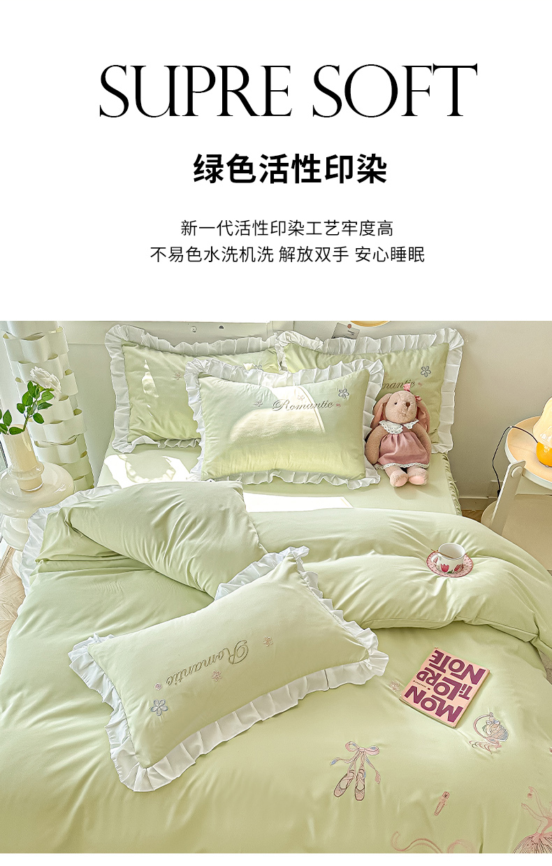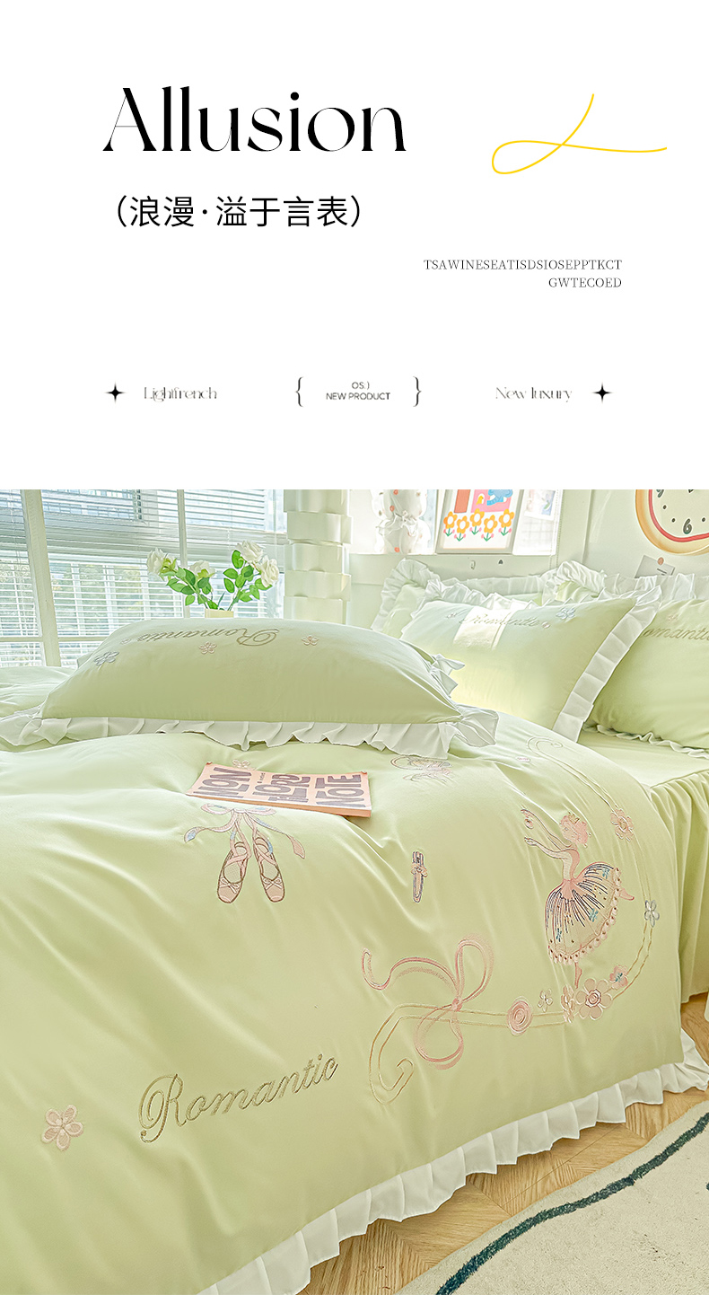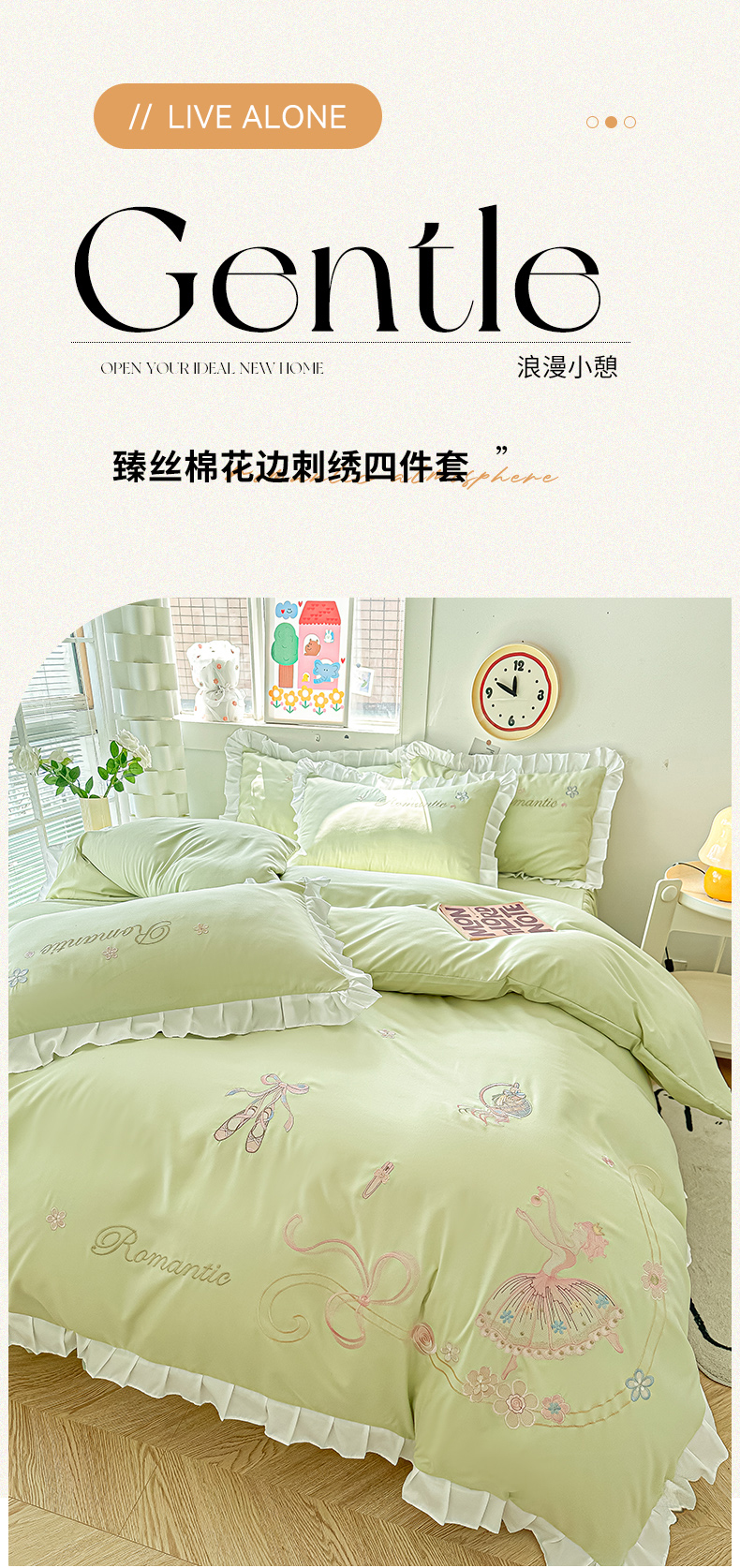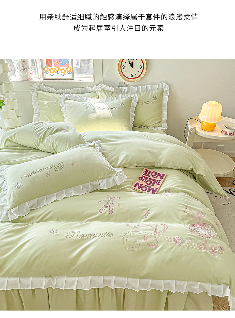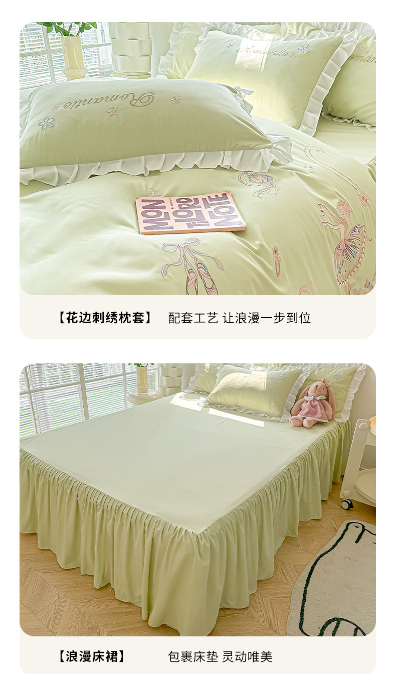 当前位置: 91家纺网 > 商品网购 > 床品套件 > 四件套 > 化纤活性四件套 > 包小包 2024新款芭蕾女孩系列精密刺绣花边韩版四件套四季款爆款(提供买家秀) 芭蕾女孩-奶绿