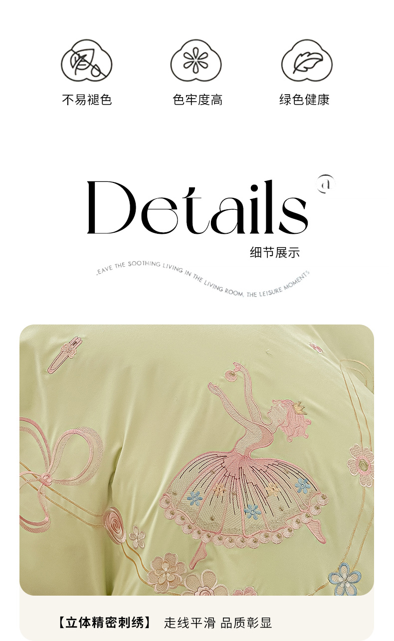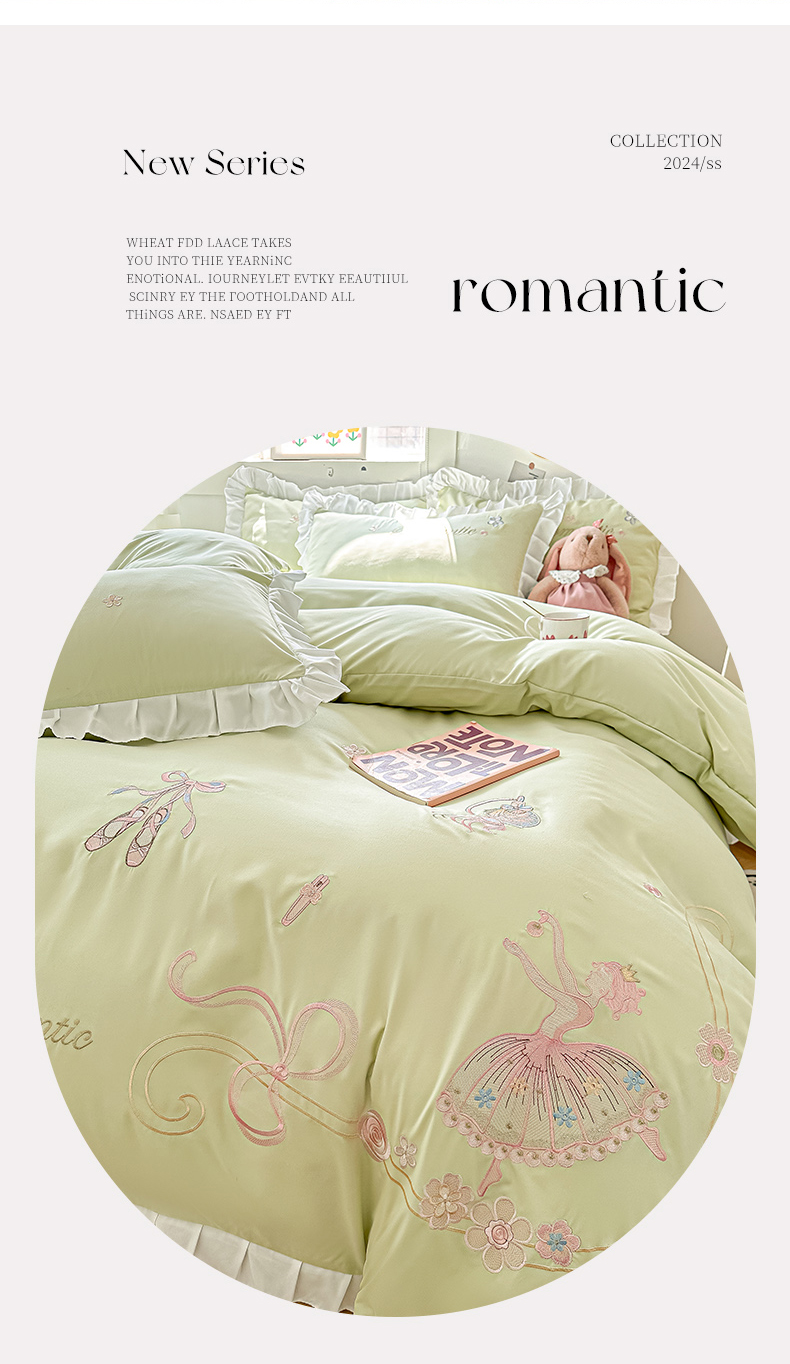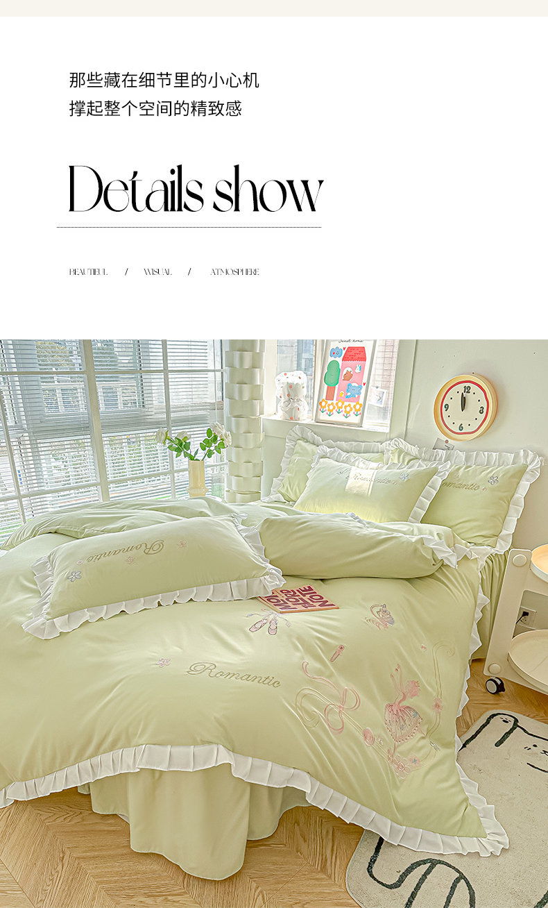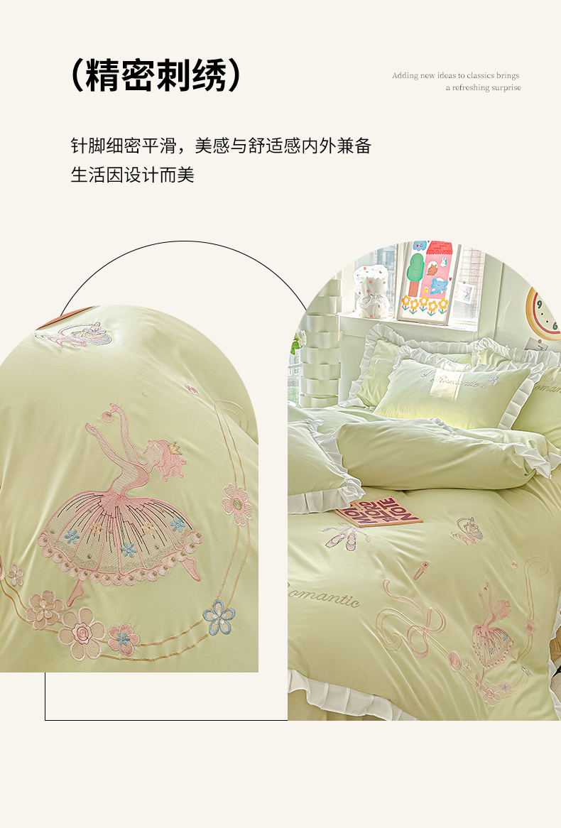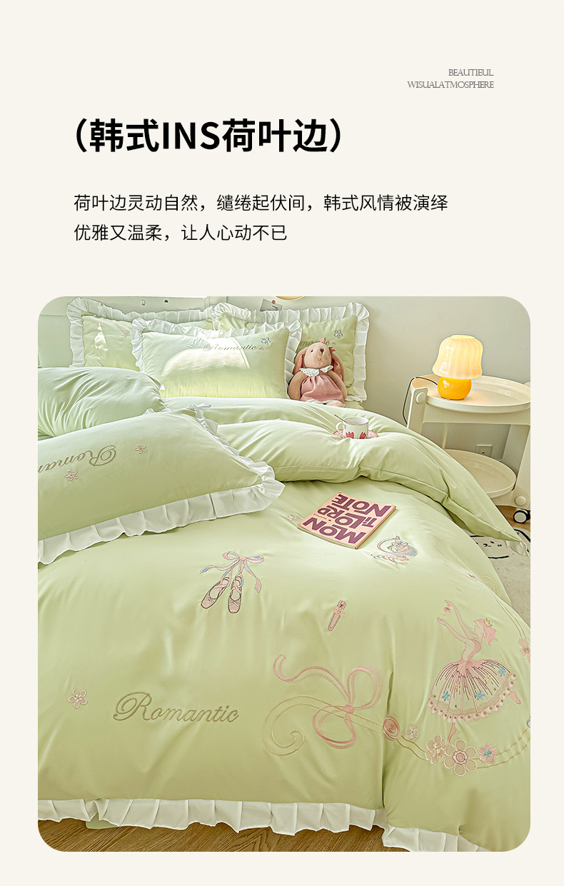 当前位置: 91家纺网 > 商品网购 > 床品套件 > 四件套 > 化纤活性四件套 > 包小包 2024新款芭蕾女孩系列精密刺绣花边韩版四件套四季款爆款(提供买家秀) 芭蕾女孩-奶绿