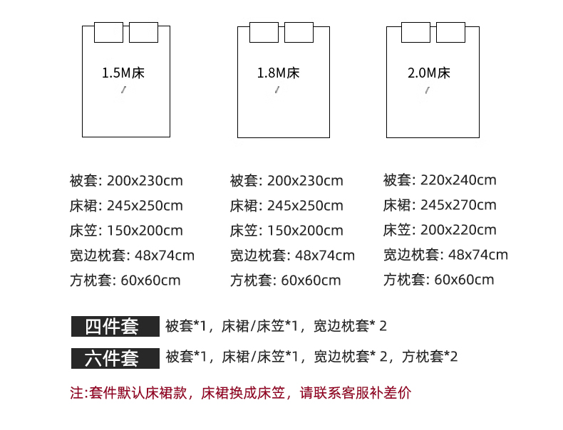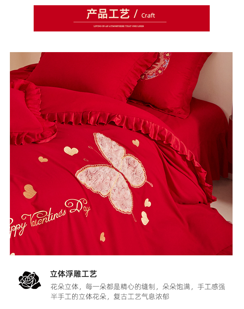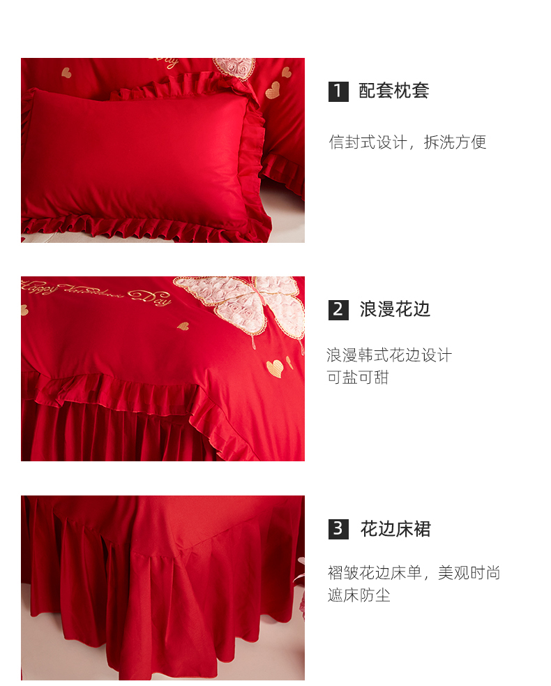 (总)玉雅家纺 2025新款长绒棉花边式红黑格调婚庆四件套,花边款-多欢喜,花边款-多喜爱