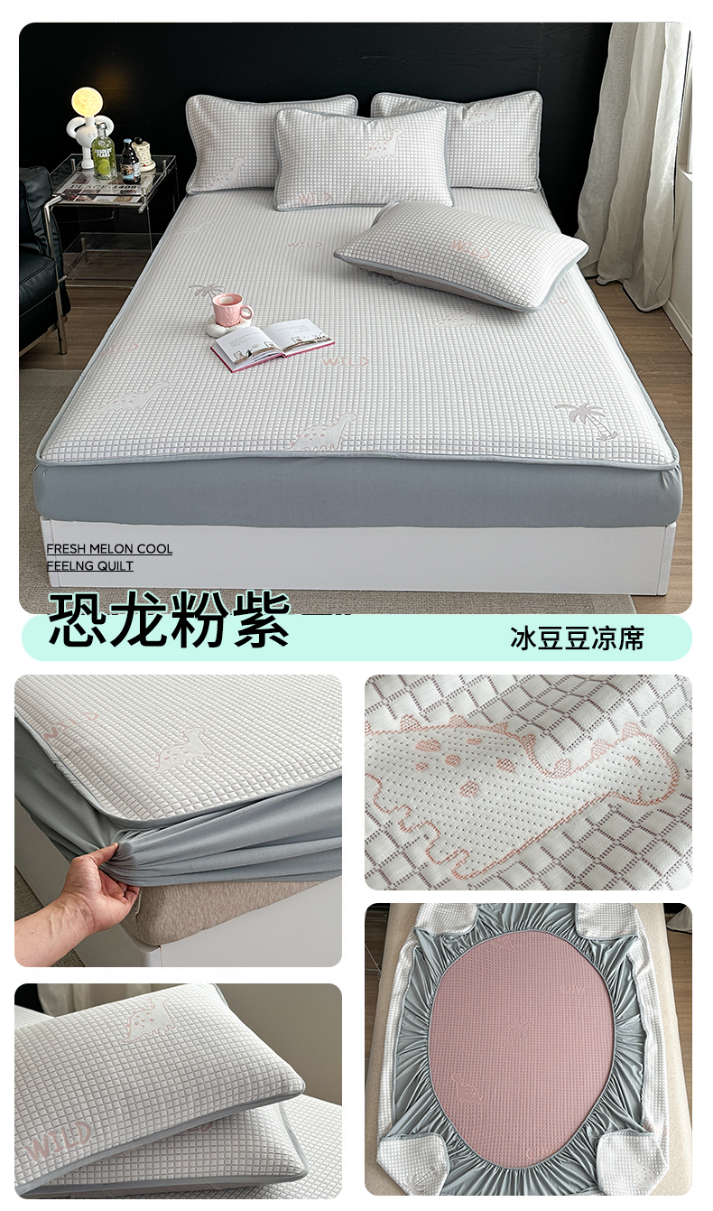 2024 新款A类立体提花冰豆豆凉感抗菌凉席床笠款 恐龙粉紫