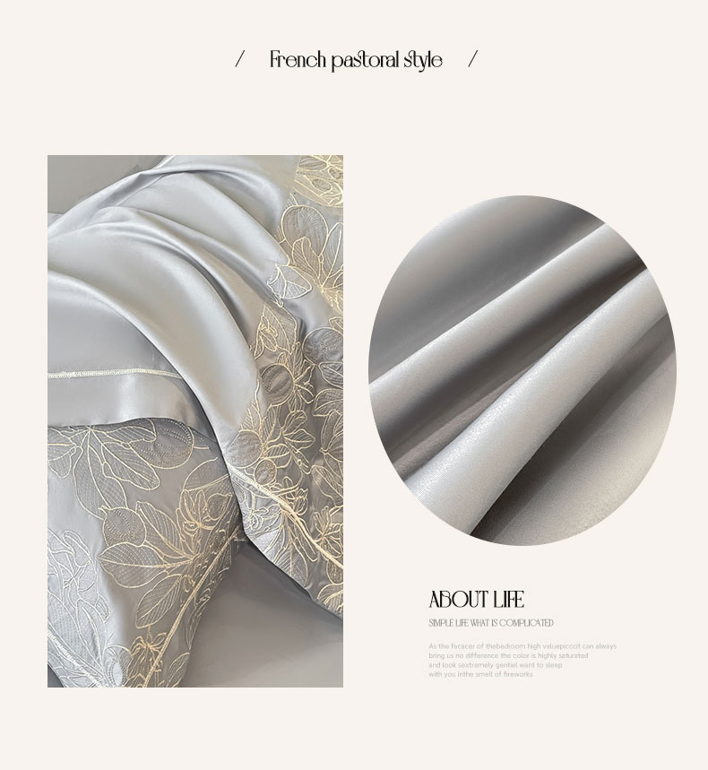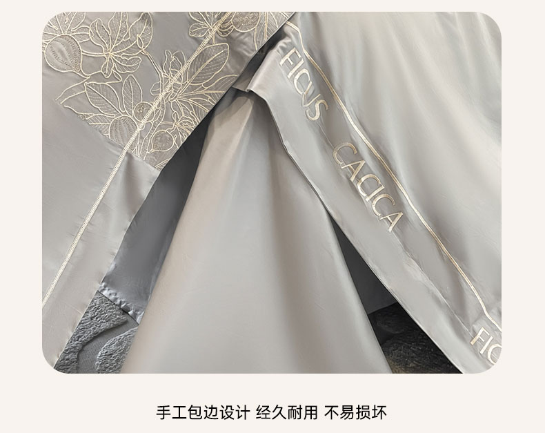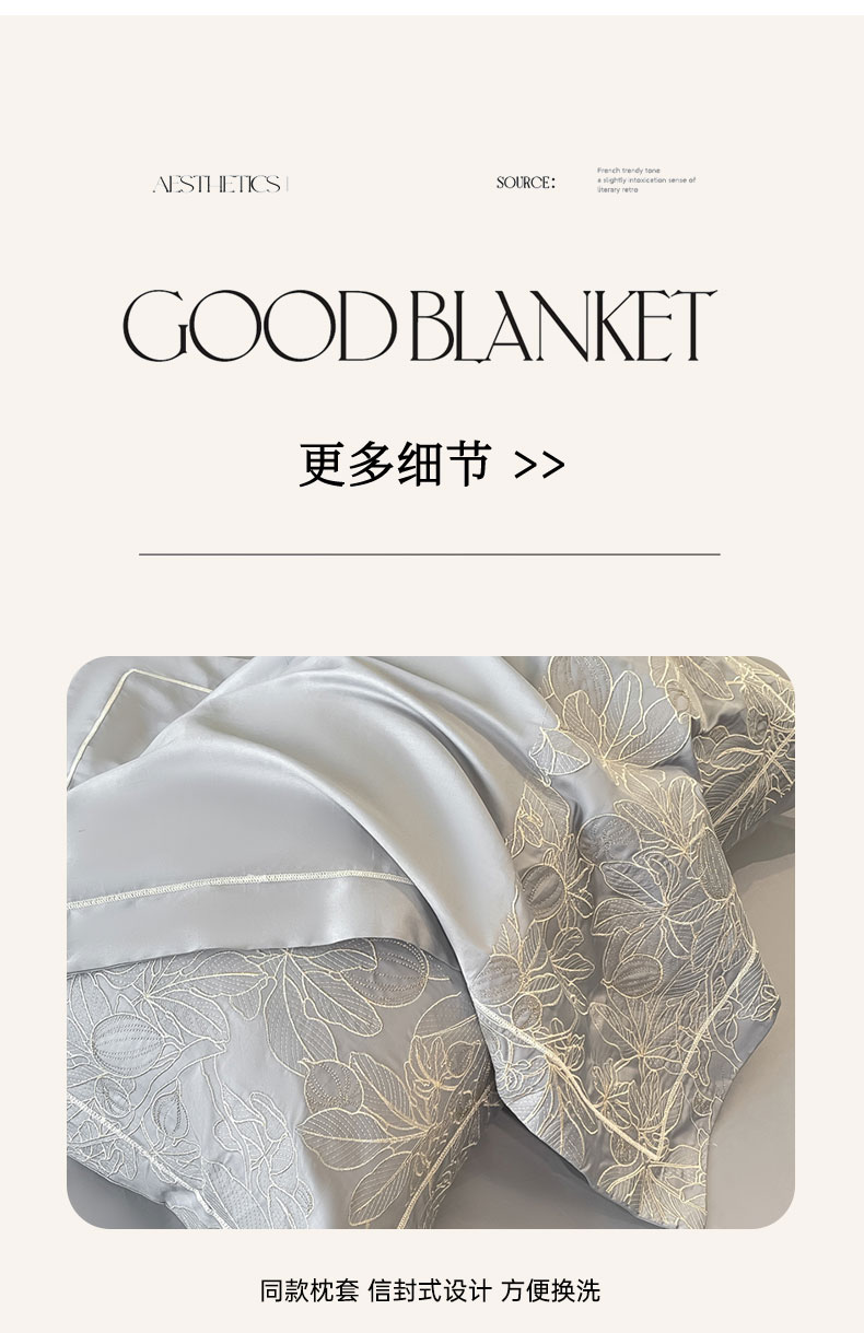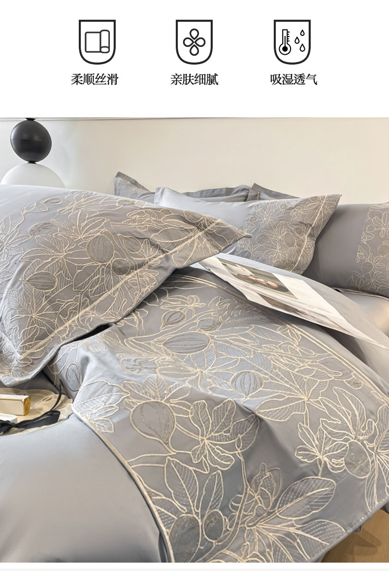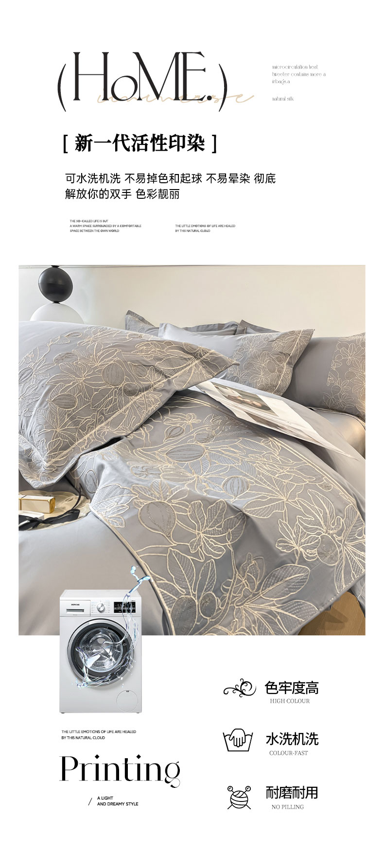 商品名称:红嘴企鹅 2025新款无花果水洗真丝四件套 无花果-灰色