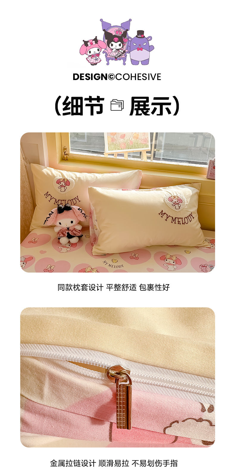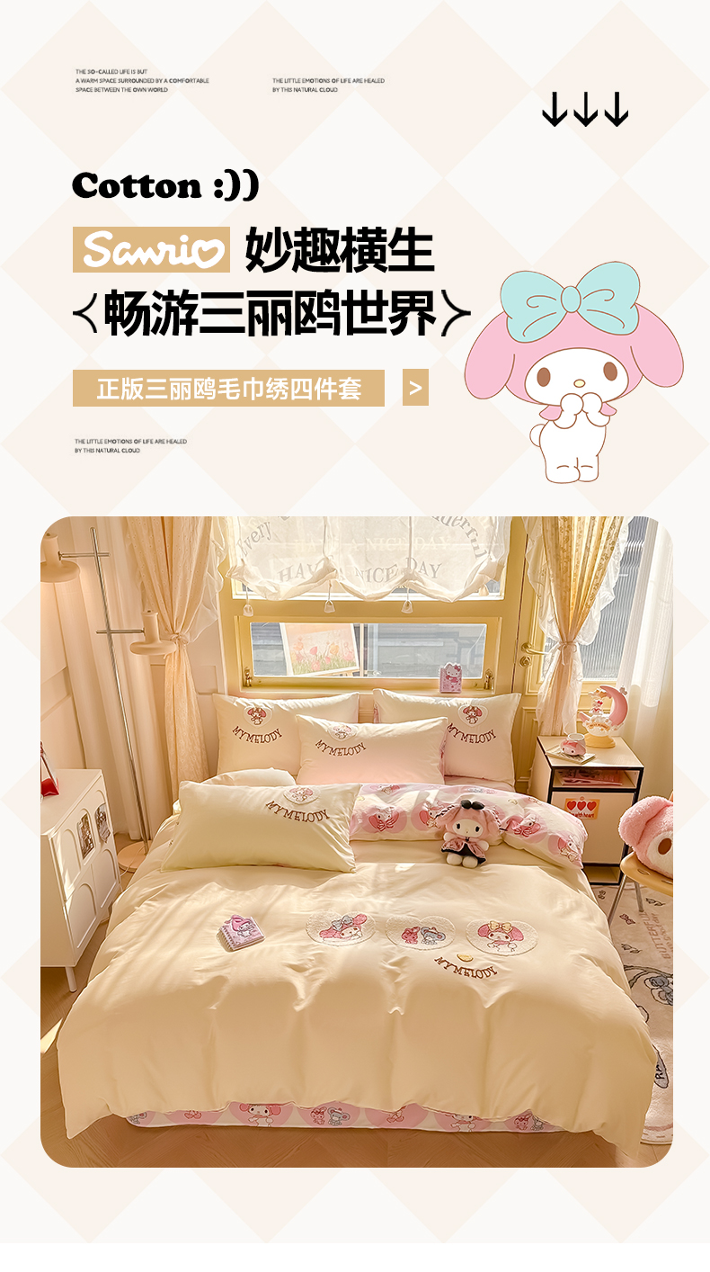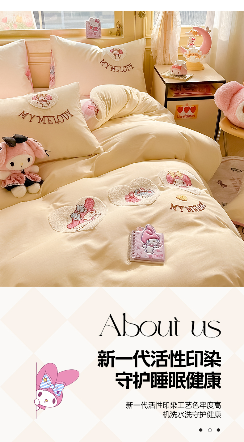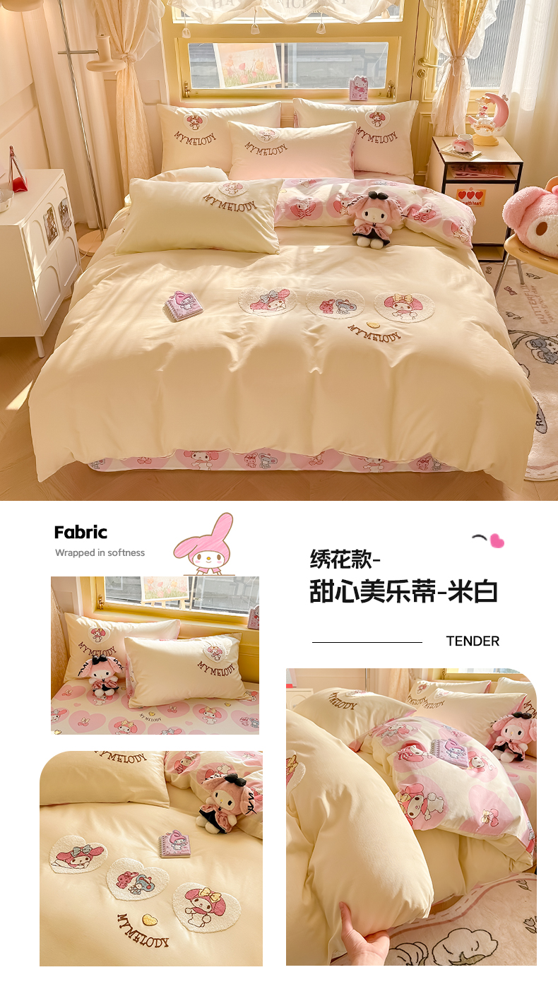 商品名称:沐辰 2024新款正版学生床三丽鸥+迪士尼毛巾绣绣花四件套 甜心美乐蒂-米白