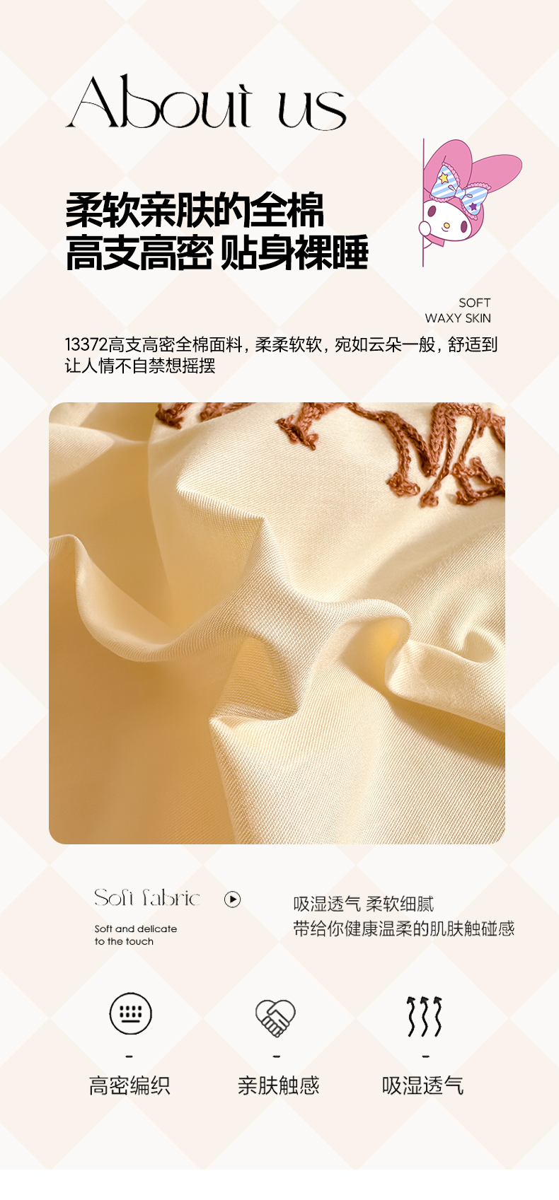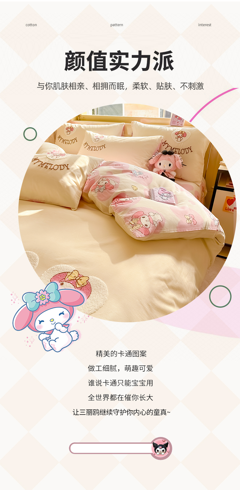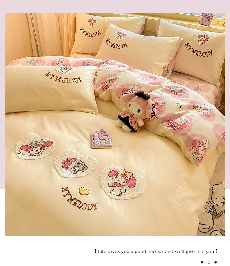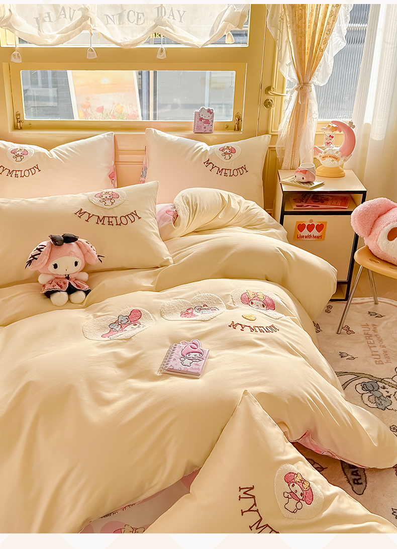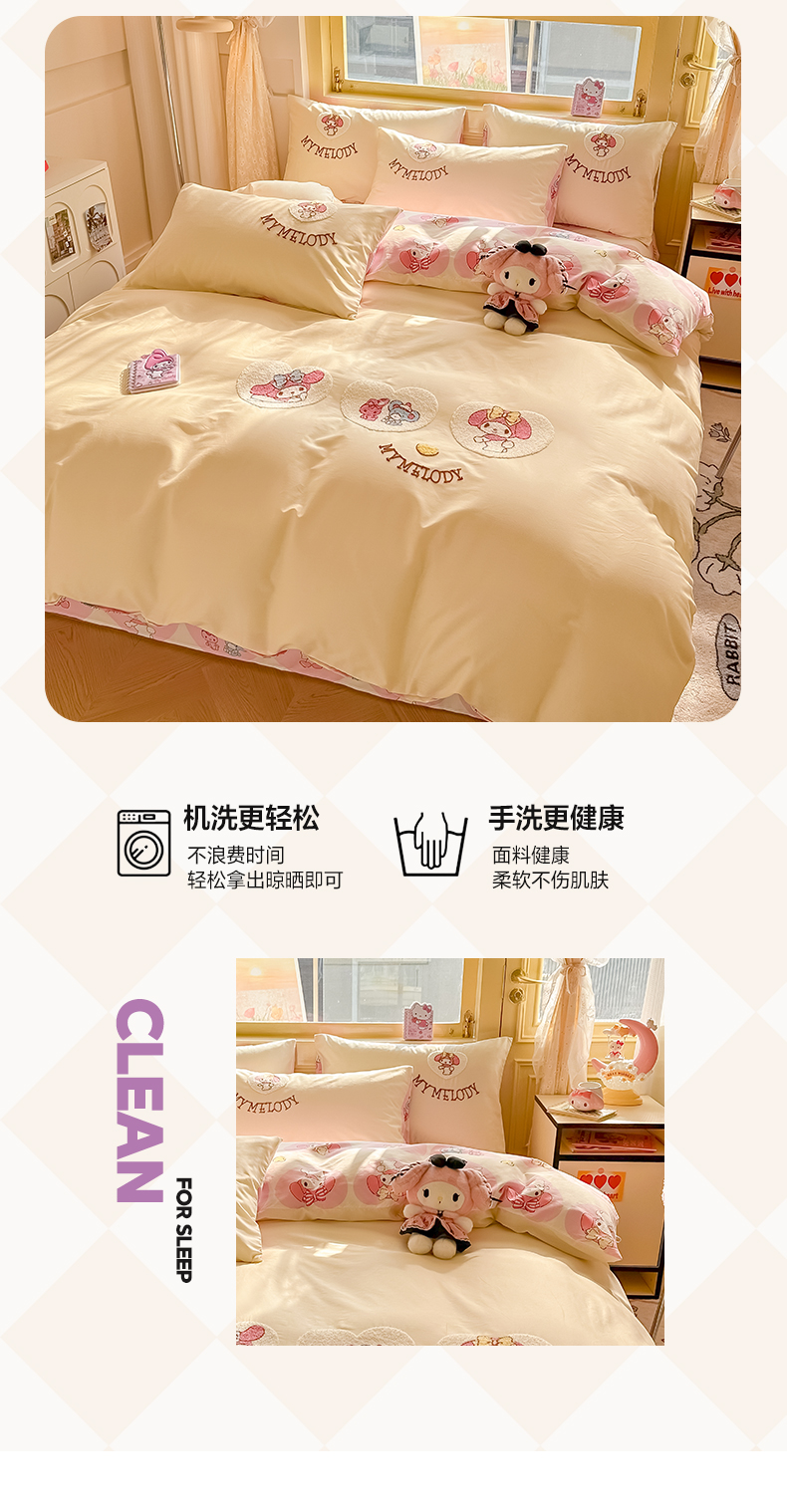 商品名称:沐辰 2024新款正版学生床三丽鸥+迪士尼毛巾绣绣花四件套 甜心美乐蒂-米白