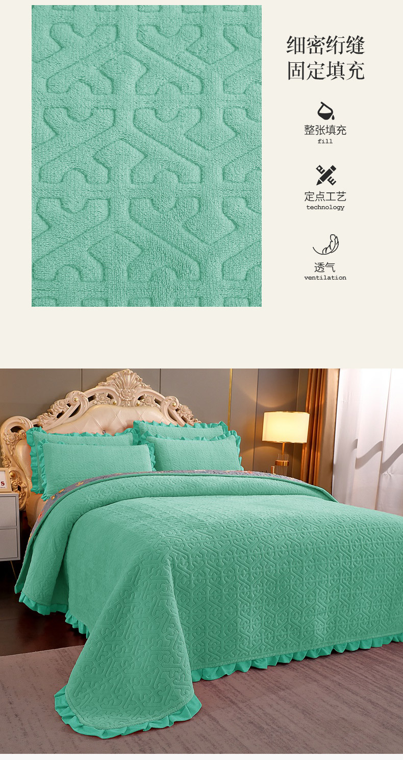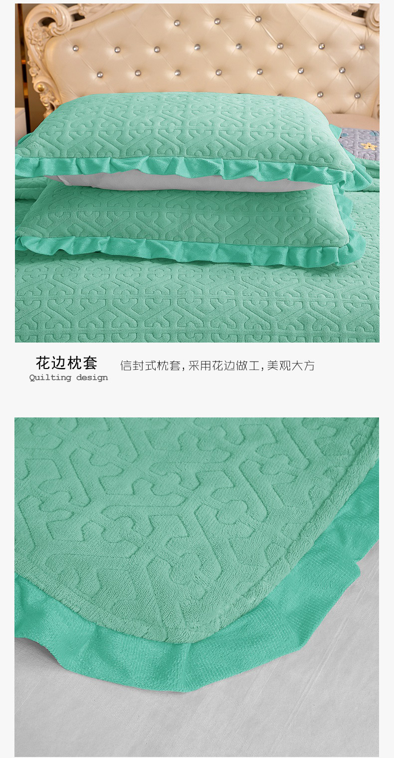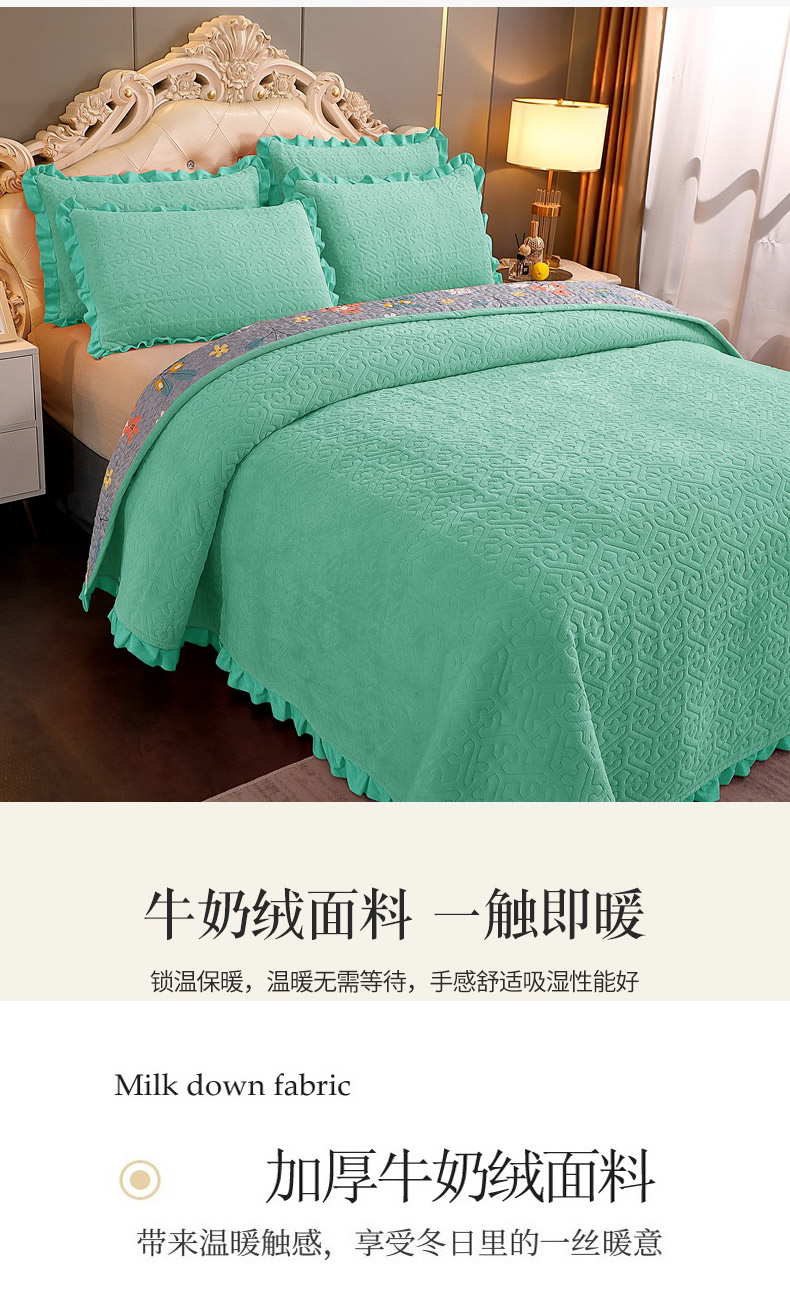 当前位置: 91家纺网 > 商品网购 > 床品套件 > 四件套 > 其它四件套 > 晶缦家纺 2024新款纯色小花边牛奶绒床盖三件套 暖馨-浅绿
