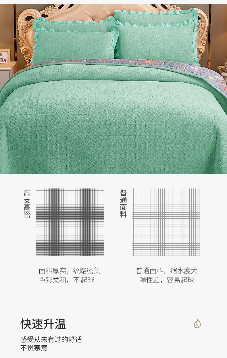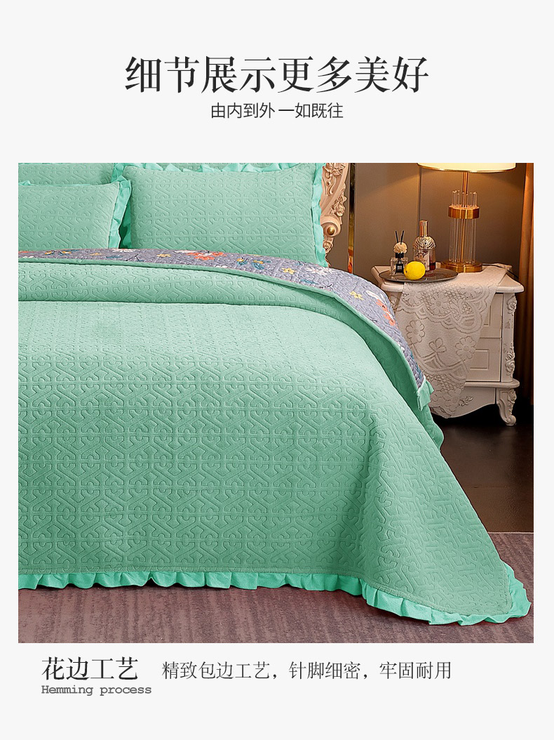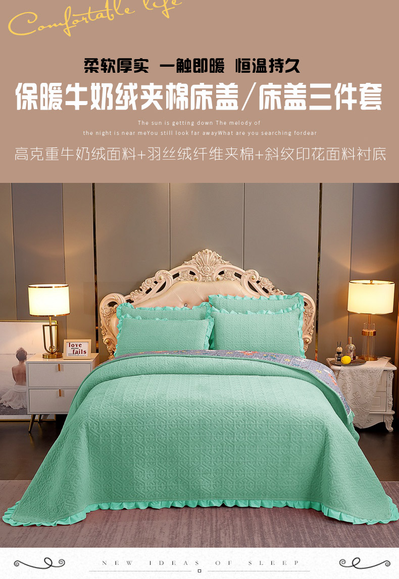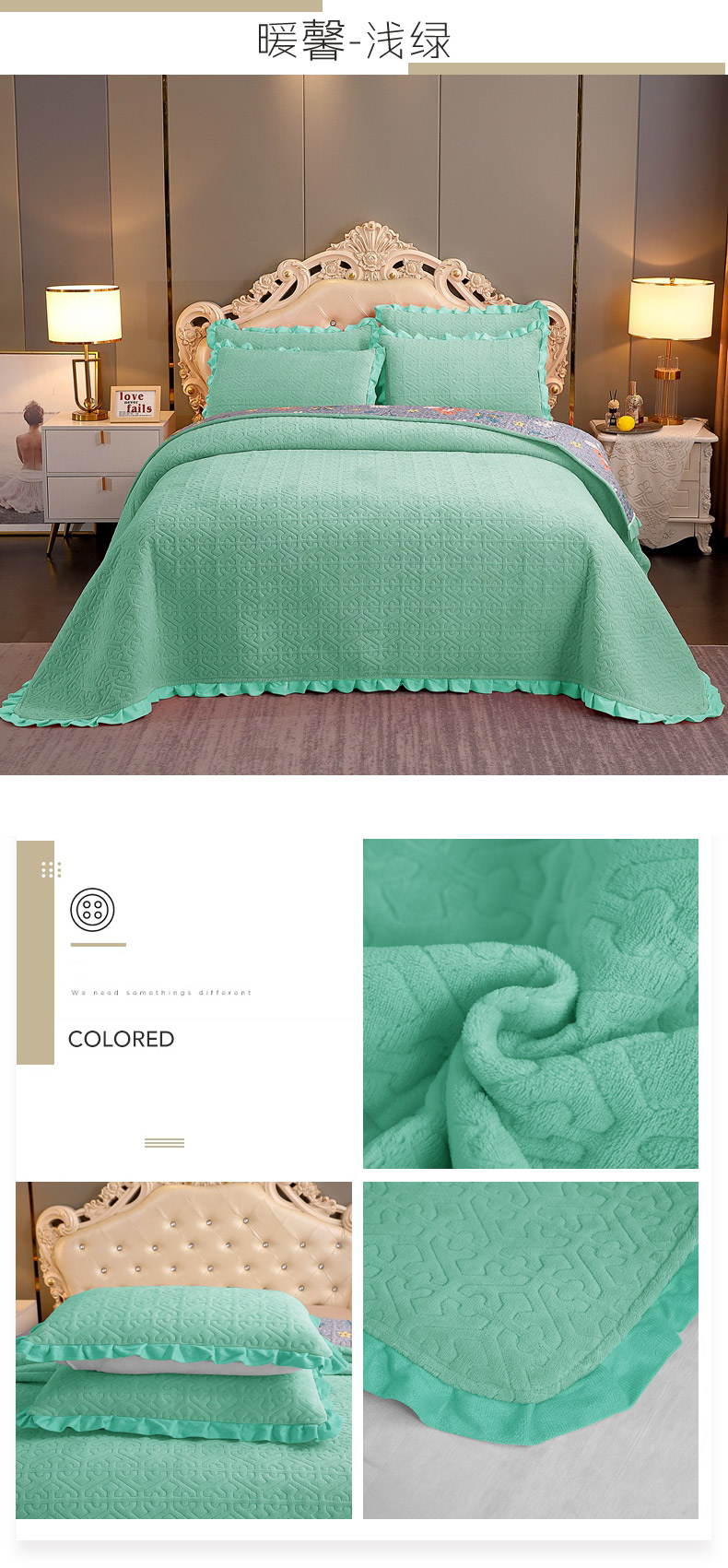 当前位置: 91家纺网 > 商品网购 > 床品套件 > 四件套 > 其它四件套 > 晶缦家纺 2024新款纯色小花边牛奶绒床盖三件套 暖馨-浅绿