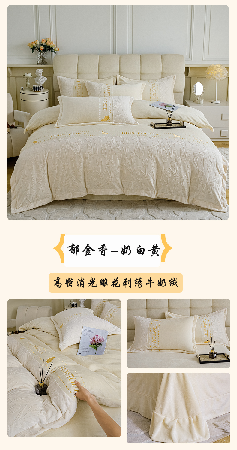 商品名称:神州川 2024新款加厚保暖高克重牛奶绒雕花刺绣四件套直播爆款 郁金香-奶白黄