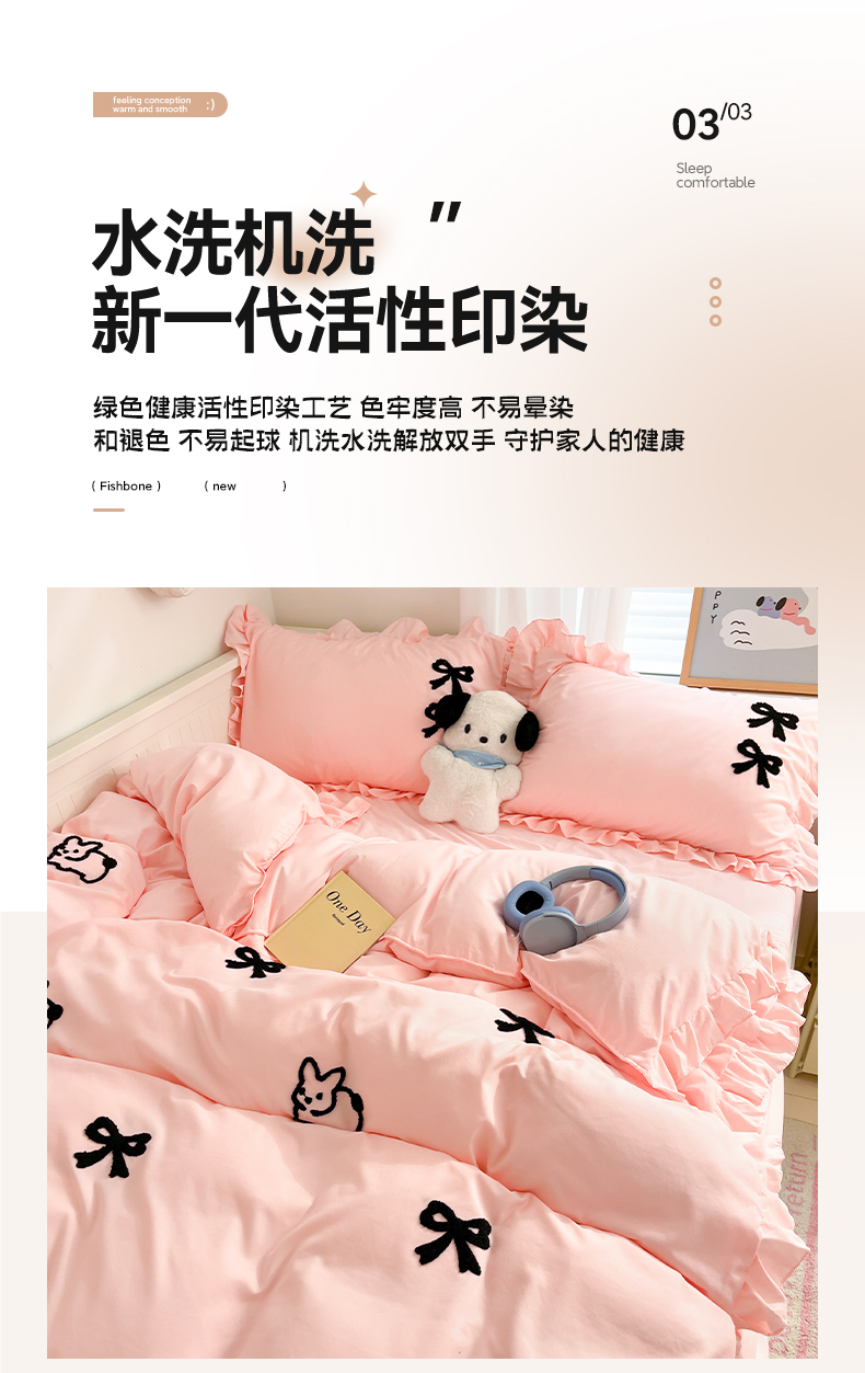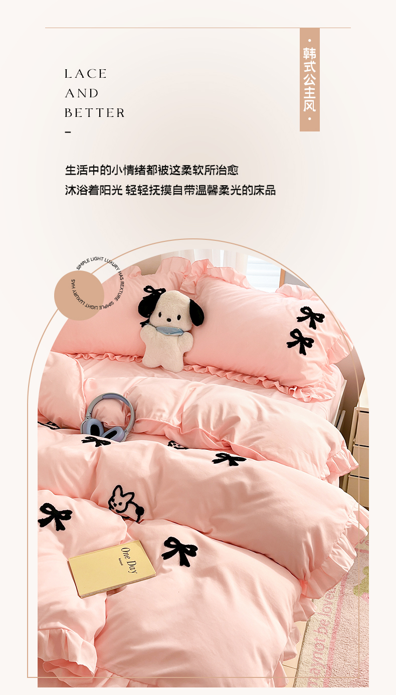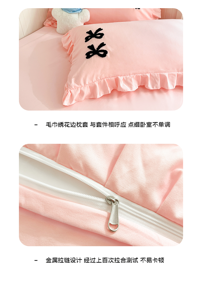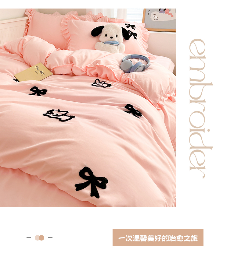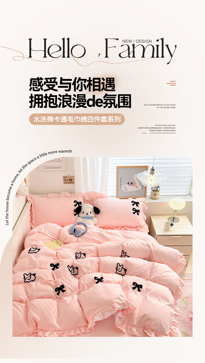 当前位置: 91家纺网 > 商品网购 > 床品套件 > 四件套 > 化纤活性四件套 > 泉欣家纺 2024韩式公主风毛巾绣花水洗棉四件套专版花型 蝴蝶结-粉玉