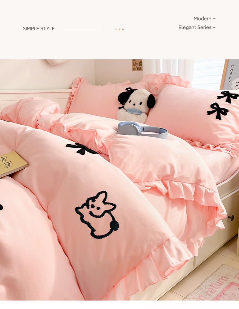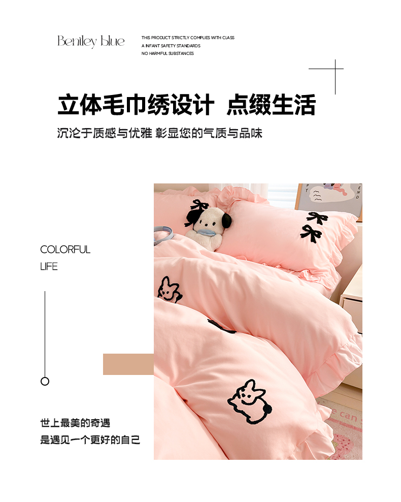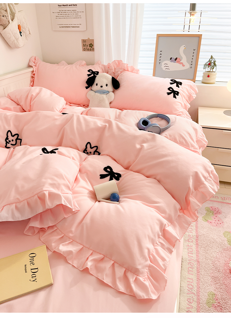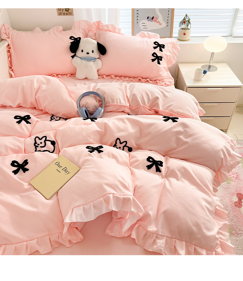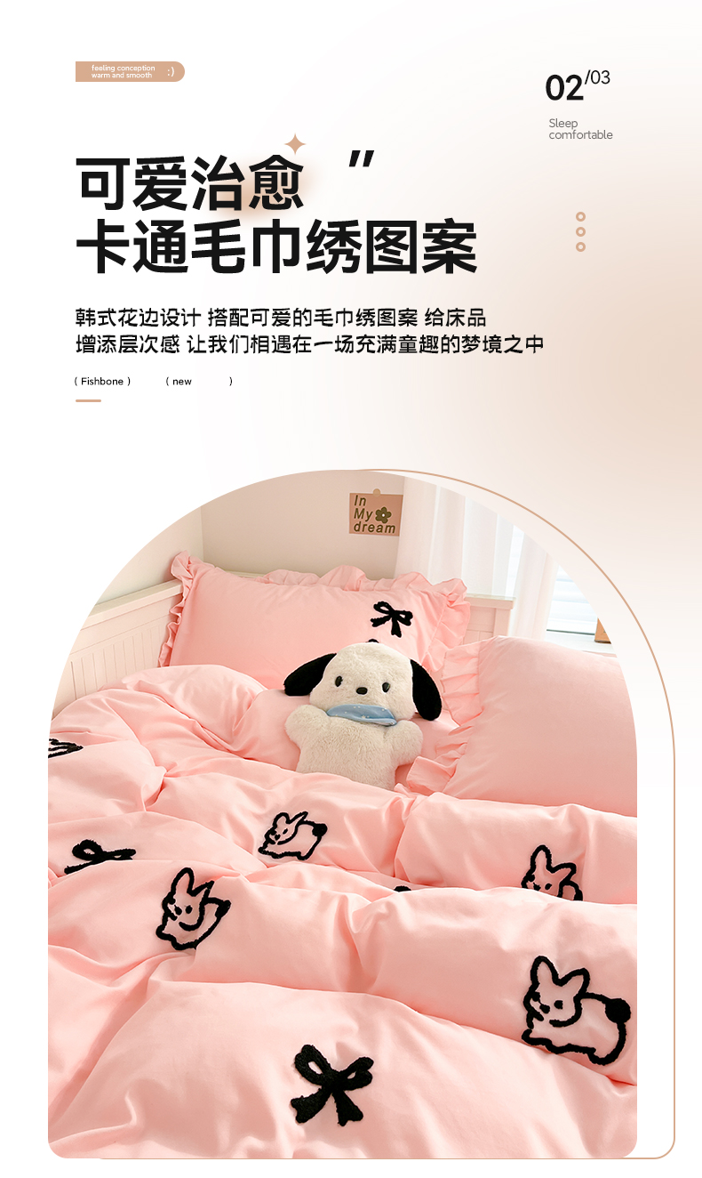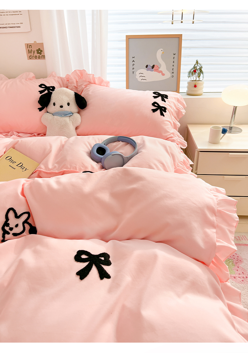 当前位置: 91家纺网 > 商品网购 > 床品套件 > 四件套 > 化纤活性四件套 > 泉欣家纺 2024韩式公主风毛巾绣花水洗棉四件套专版花型 蝴蝶结-粉玉
