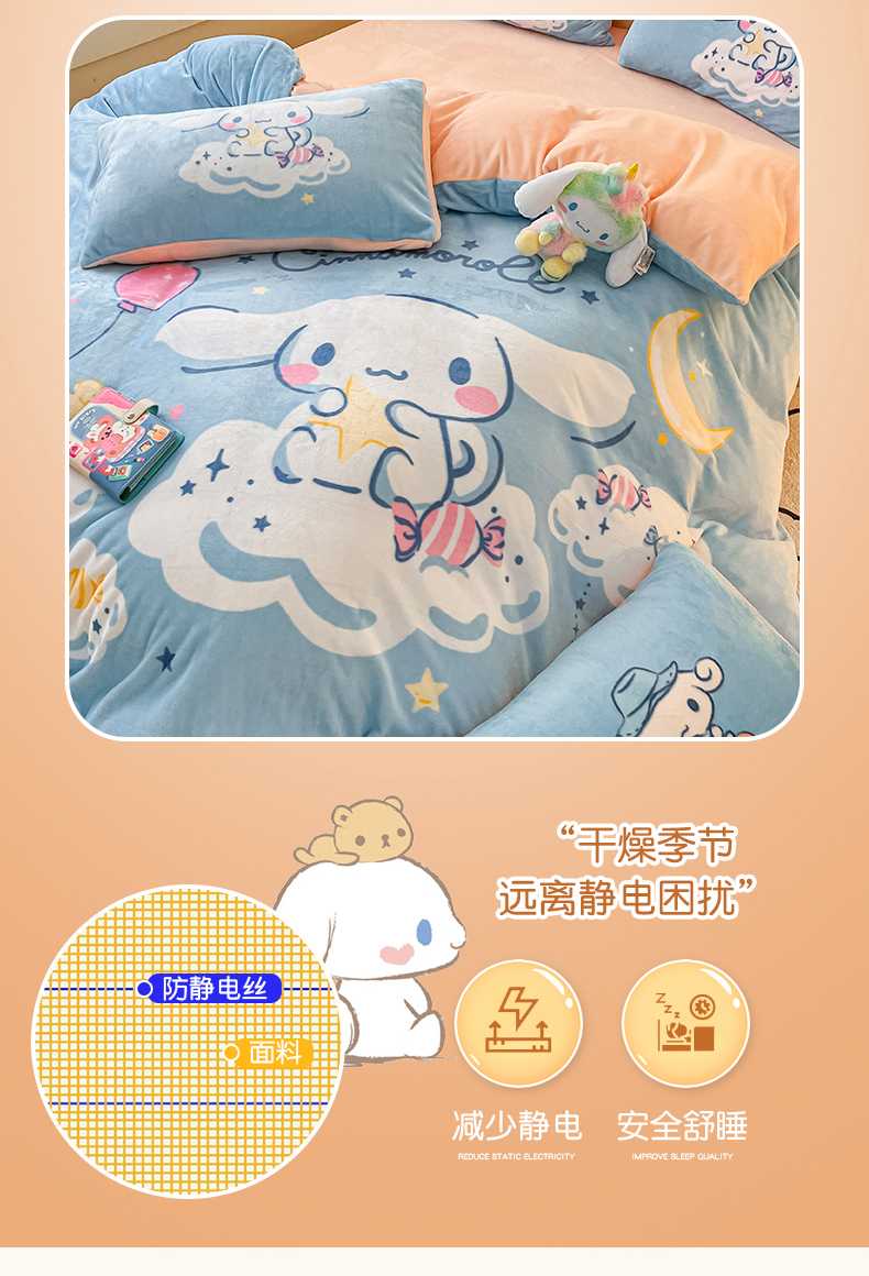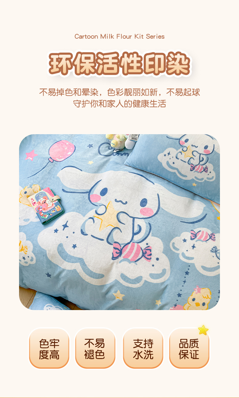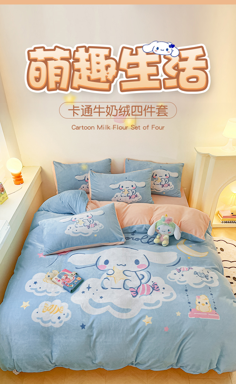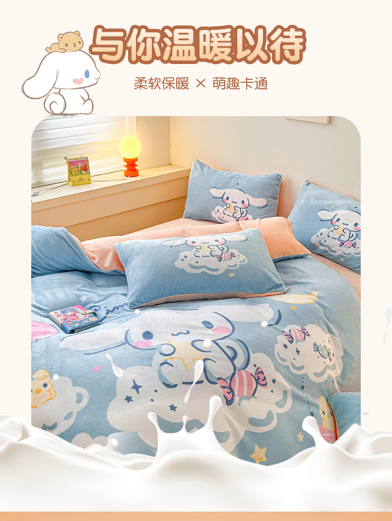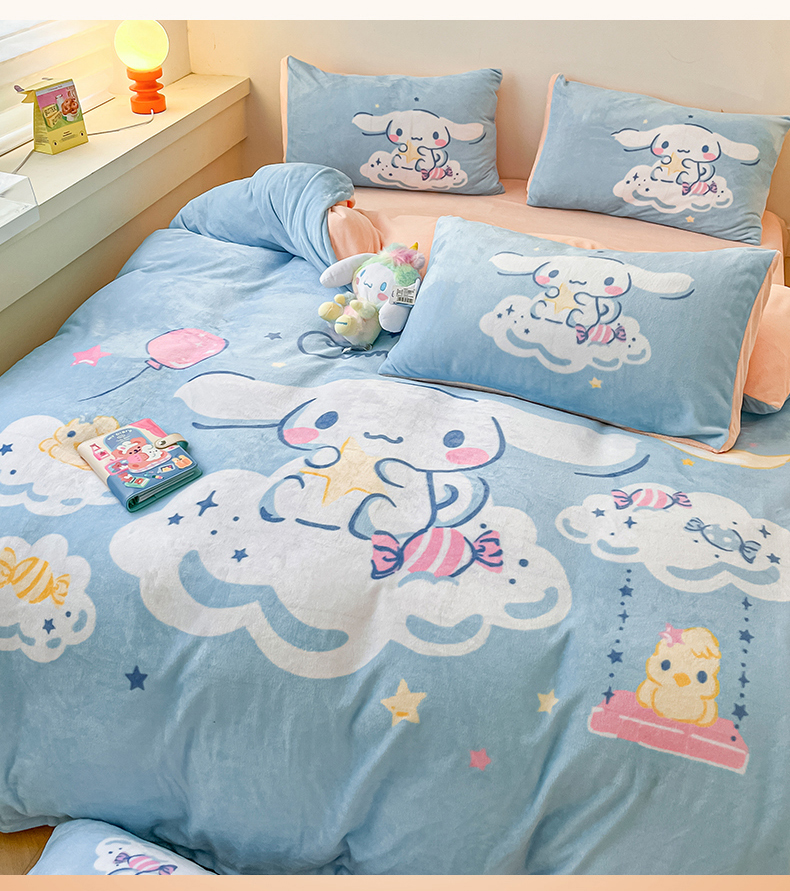 当前位置: 91家纺网 > 商品网购 > 床品套件 > 四件套 > 牛奶绒四件套 > 孩子王家纺 2024新款正版授权三丽鸥库洛米大版卡通学生宿舍双面加厚牛奶绒系列四件套--提供买家秀 云朵玉桂狗