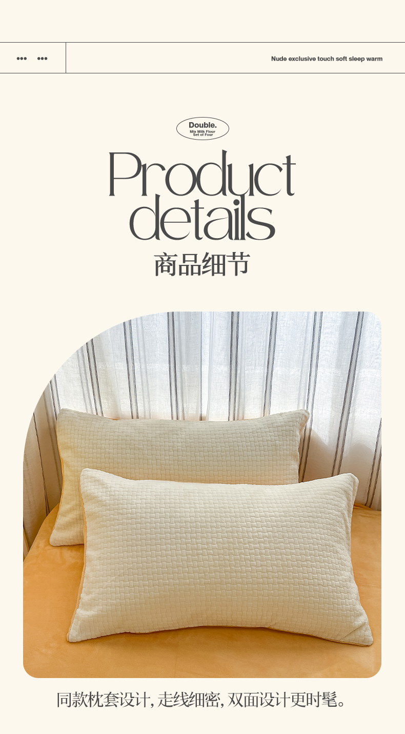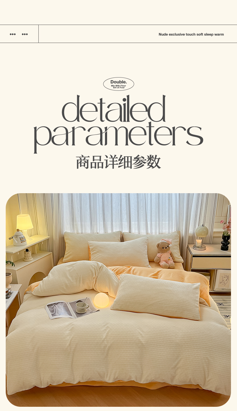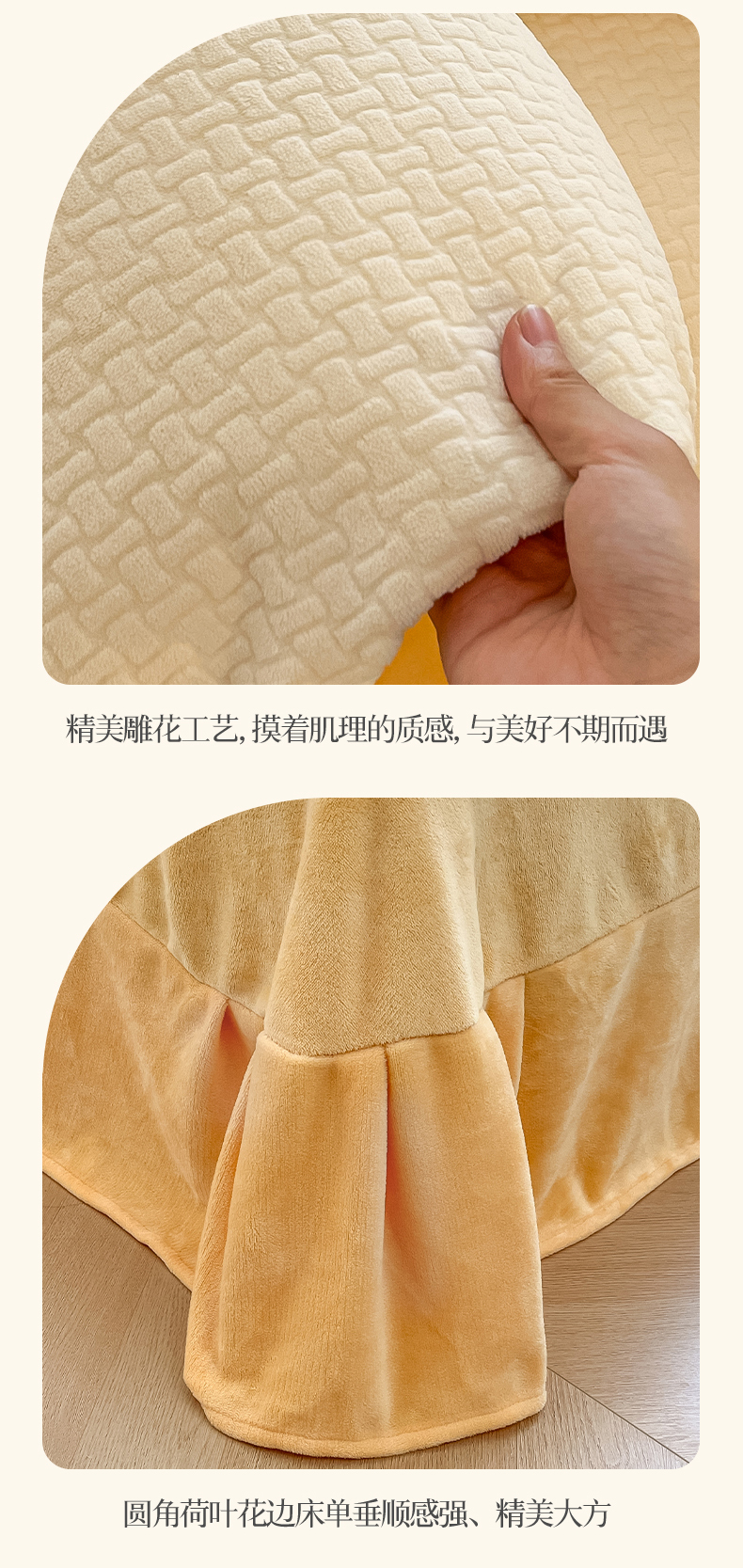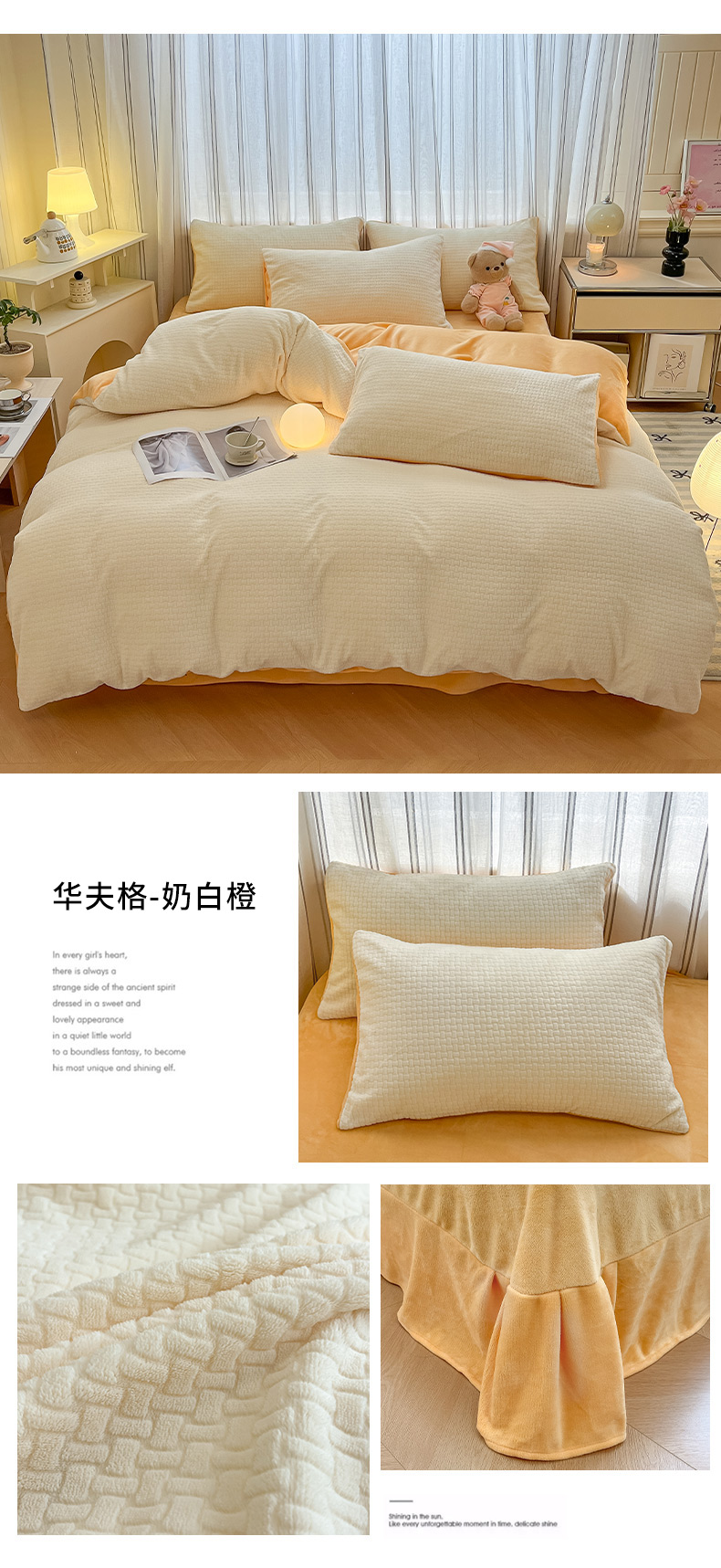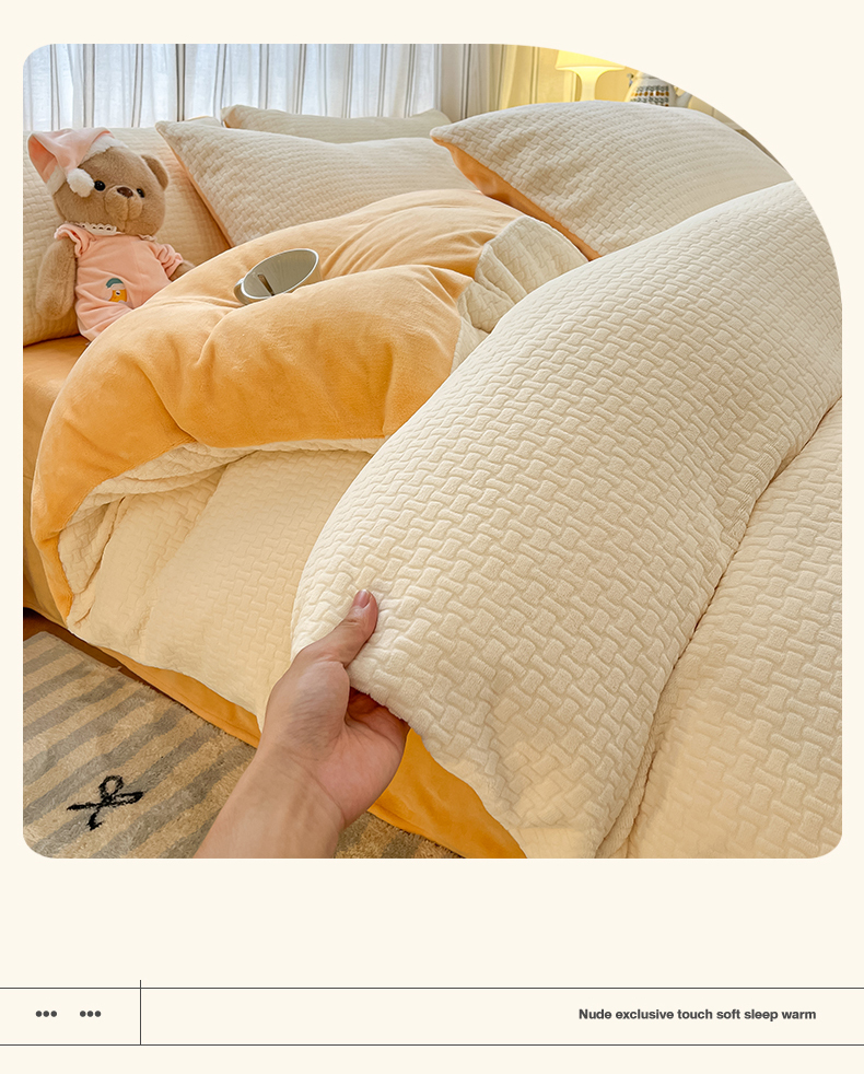 商品名称:绘萱家居 2025新款高克重雕花雕印纯色牛奶绒四件套双拼法莱绒珊瑚绒 华夫格-奶白橙