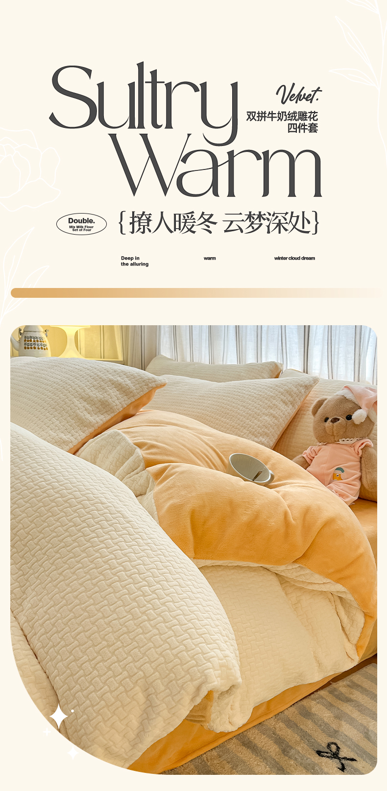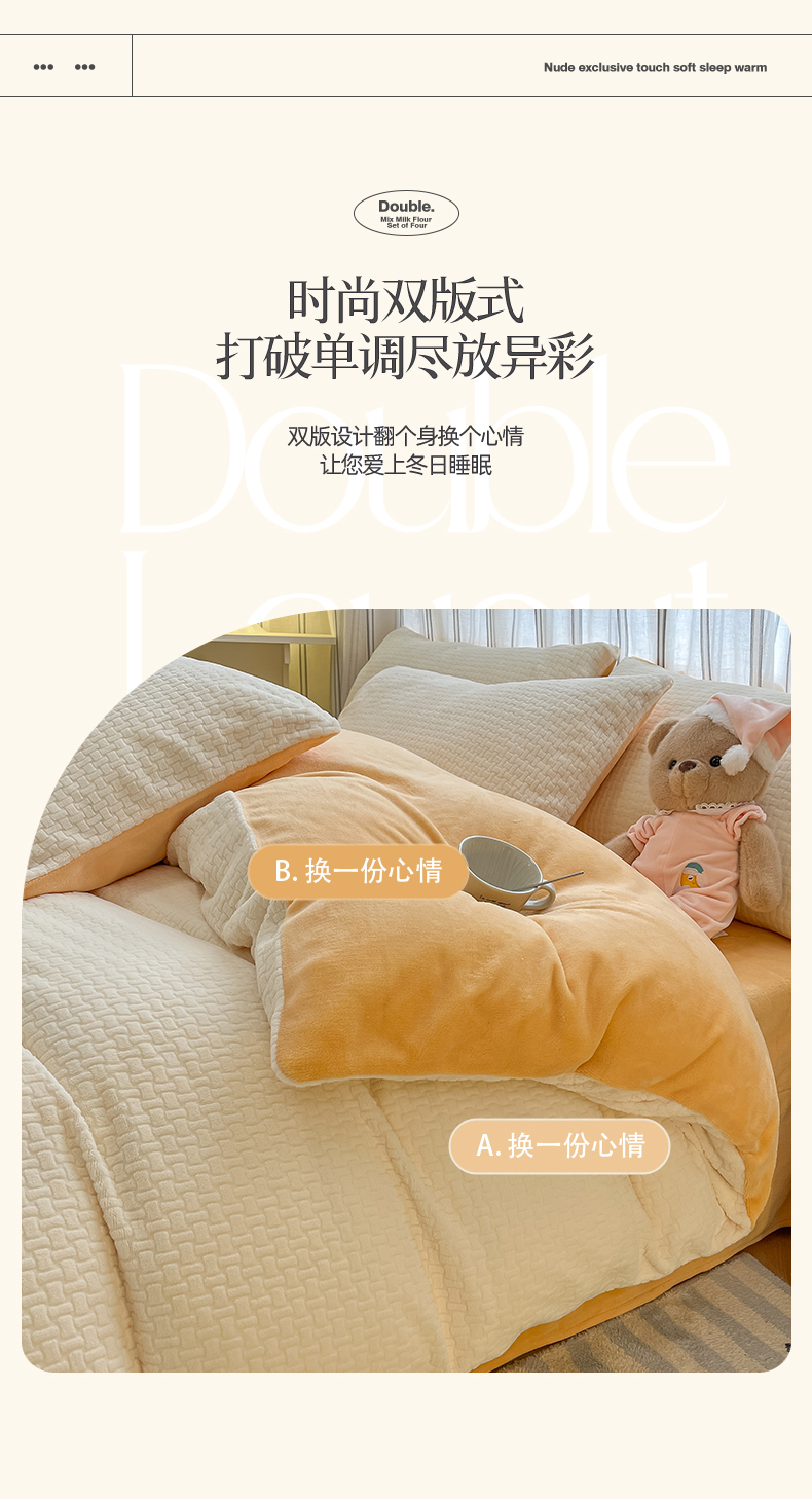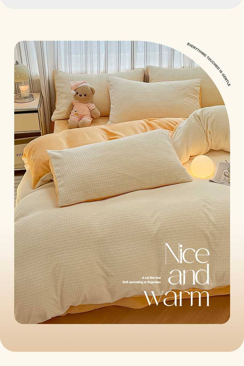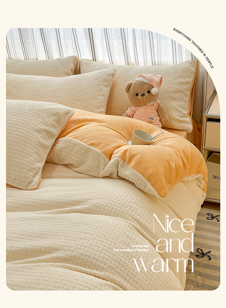 绘萱家居 2025新款高克重雕花雕印纯色牛奶绒四件套双拼法莱绒珊瑚绒 华夫格-奶白橙
