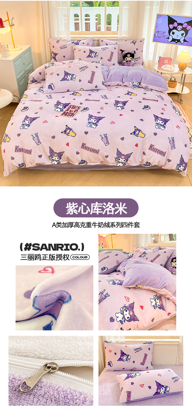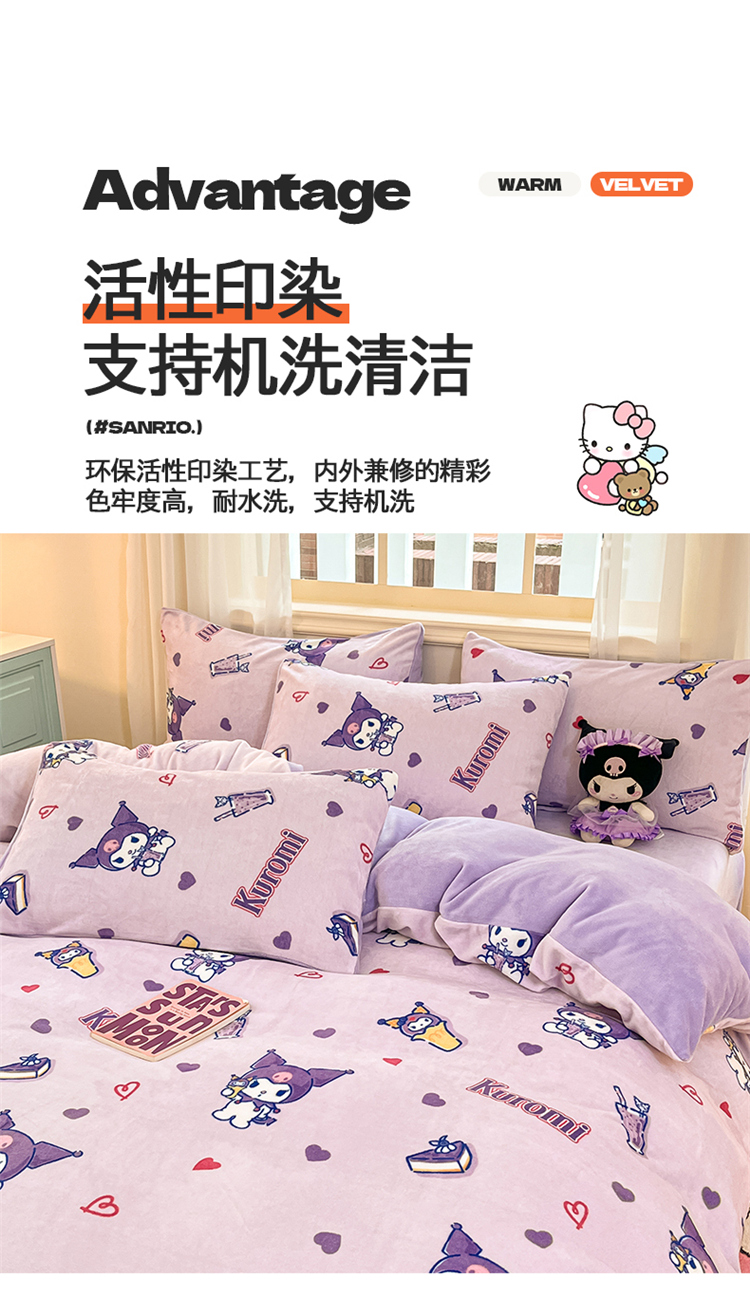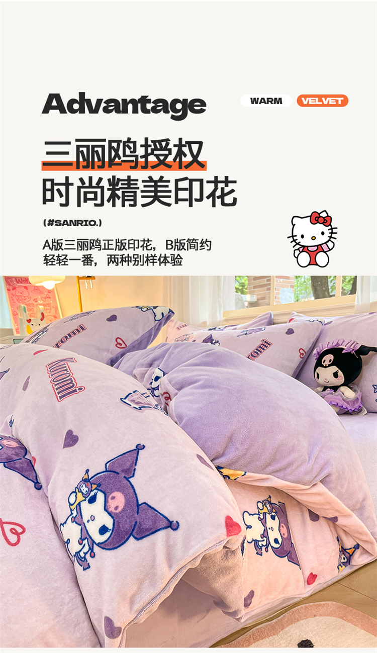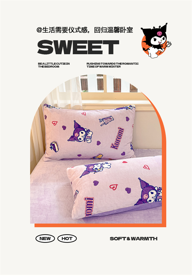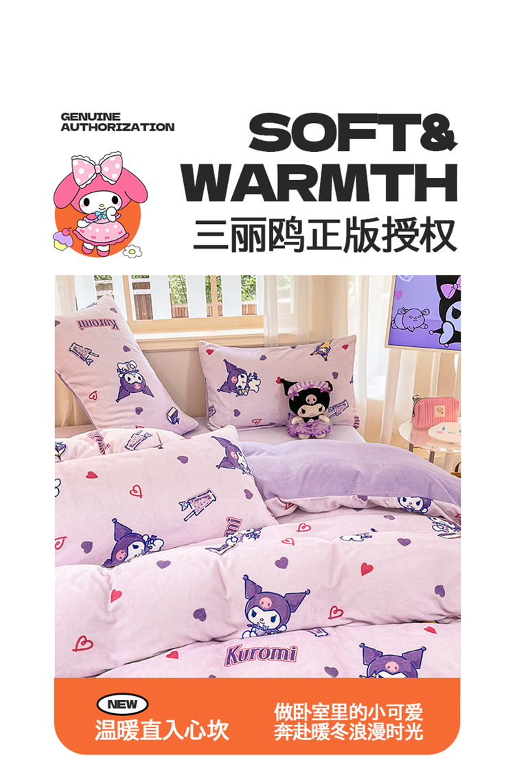 当前位置: 91家纺网 > 商品网购 > 床品套件 > 四件套 > 牛奶绒四件套 > 2024新品正版三丽鸥授权卡通加厚高克重牛奶绒系列四件套 绒三丽鸥-紫心库洛米