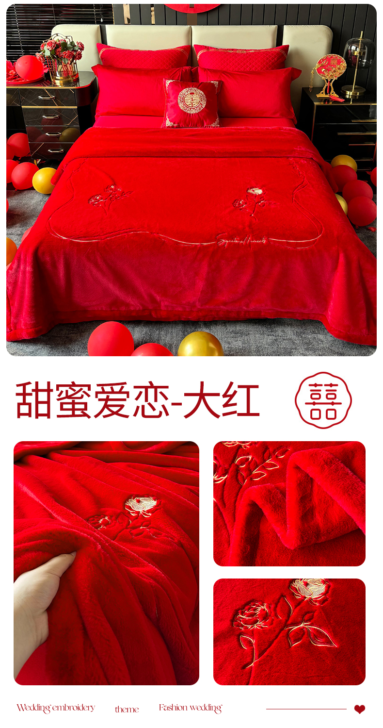 2024新款仿皮草兔绒精品绣花毛毯毯子 甜蜜爱恋-大红