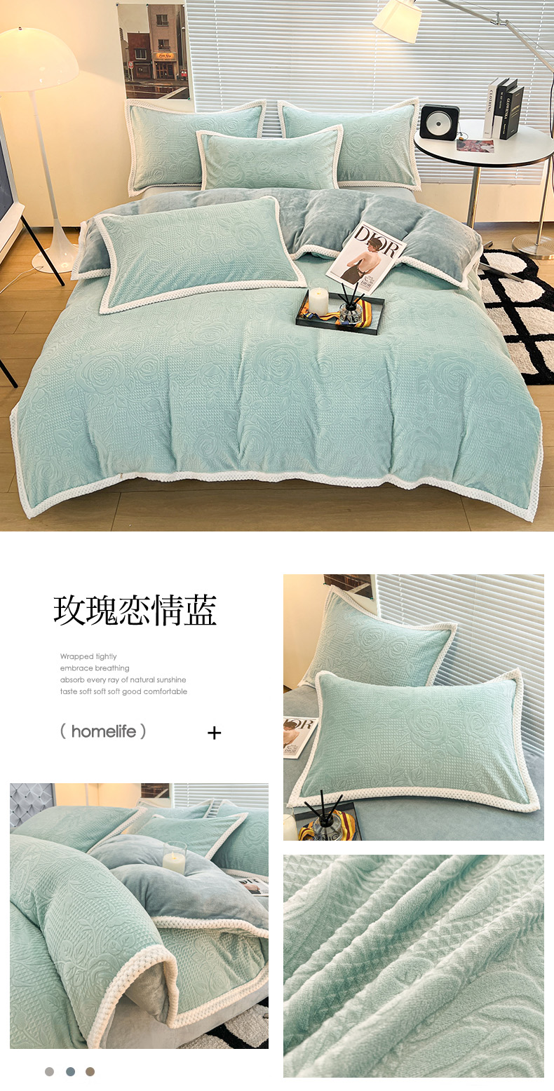 (总)倾慕 2025新款兔绒立体雕花加厚保暖系列四件套,爱娜玉,春絮蓝,春絮绿,伊宁玉,伊宁紫,优朵粉,珍妮粉,珍妮湖蓝