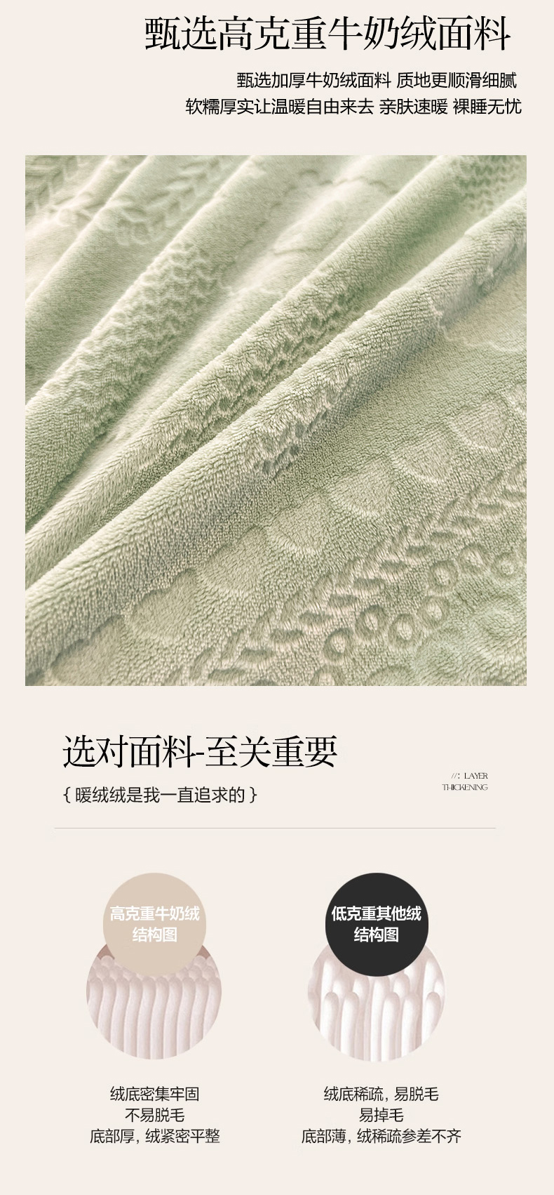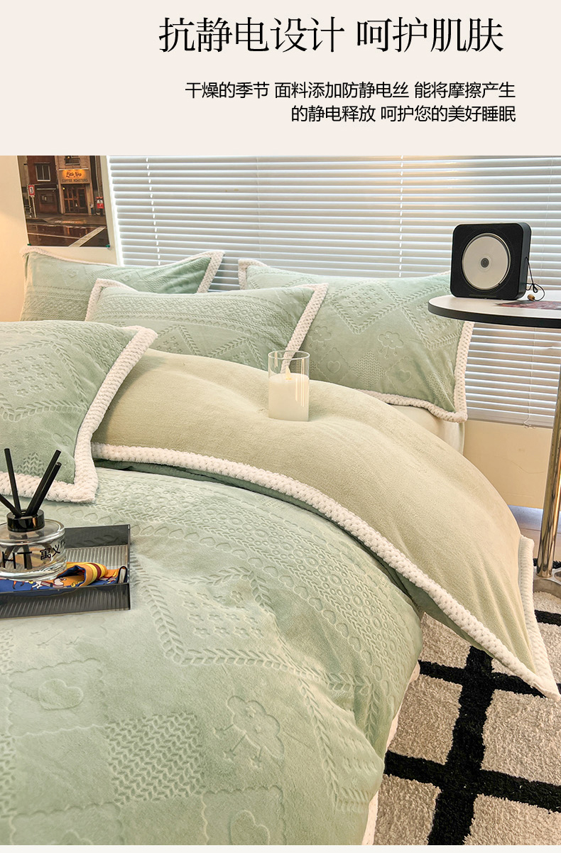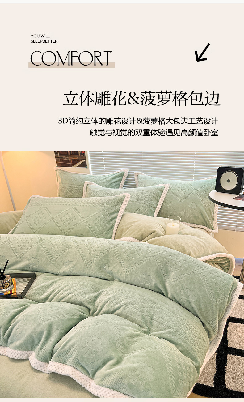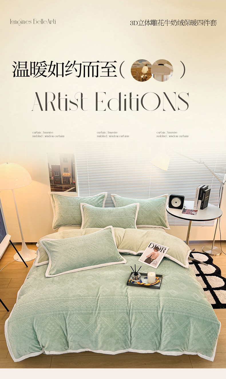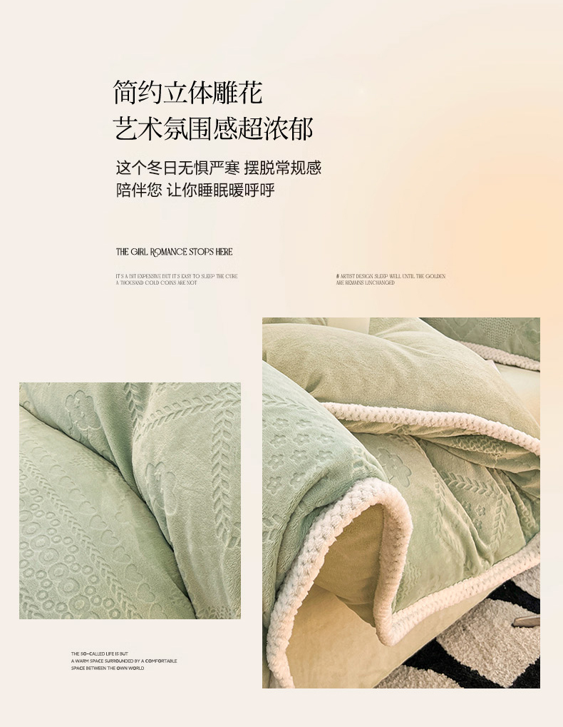 当前位置: 91家纺网 > 商品网购 > 床品套件 > 四件套 > 牛奶绒四件套 > 2024新款A类高克重3D立体雕花牛奶绒保暖系列套件单品-四件套 新泫雅花青春绿