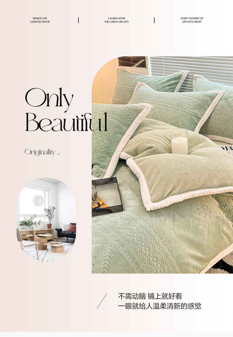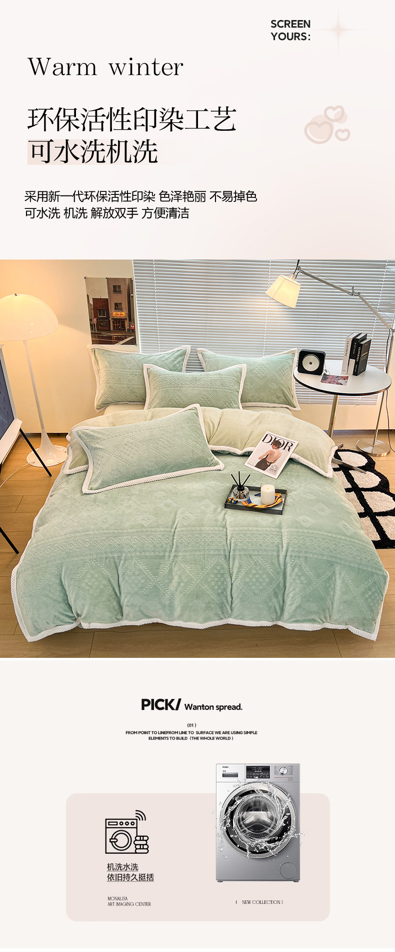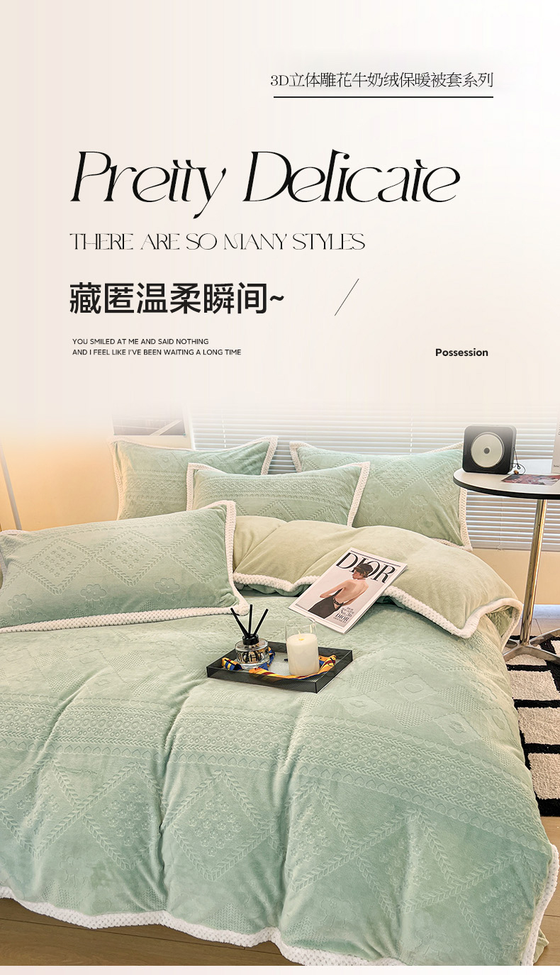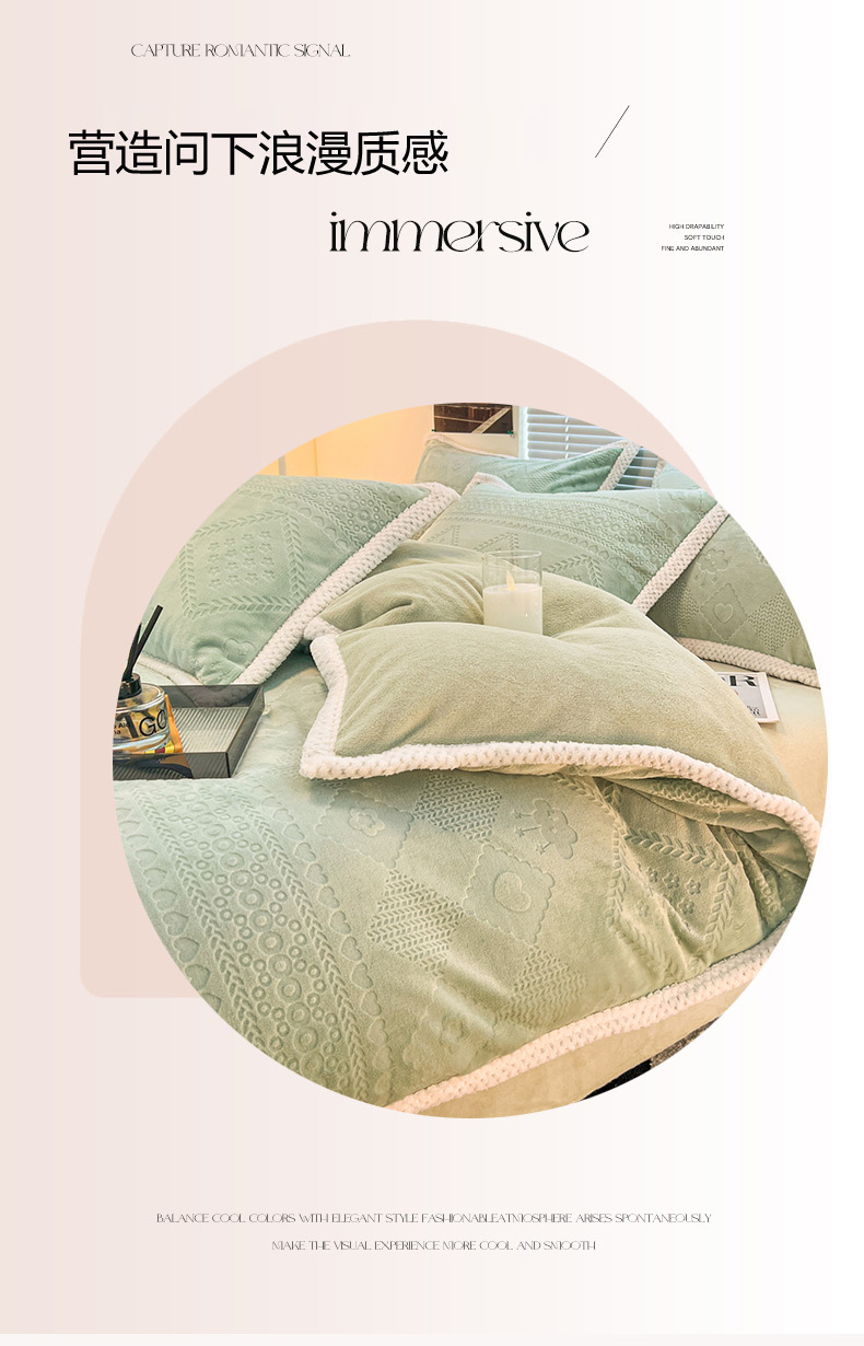 (总)倾慕 2025新款兔绒立体雕花加厚保暖系列四件套,爱娜玉,春絮蓝,春絮绿,伊宁玉,伊宁紫,优朵粉,珍妮粉,珍妮湖蓝