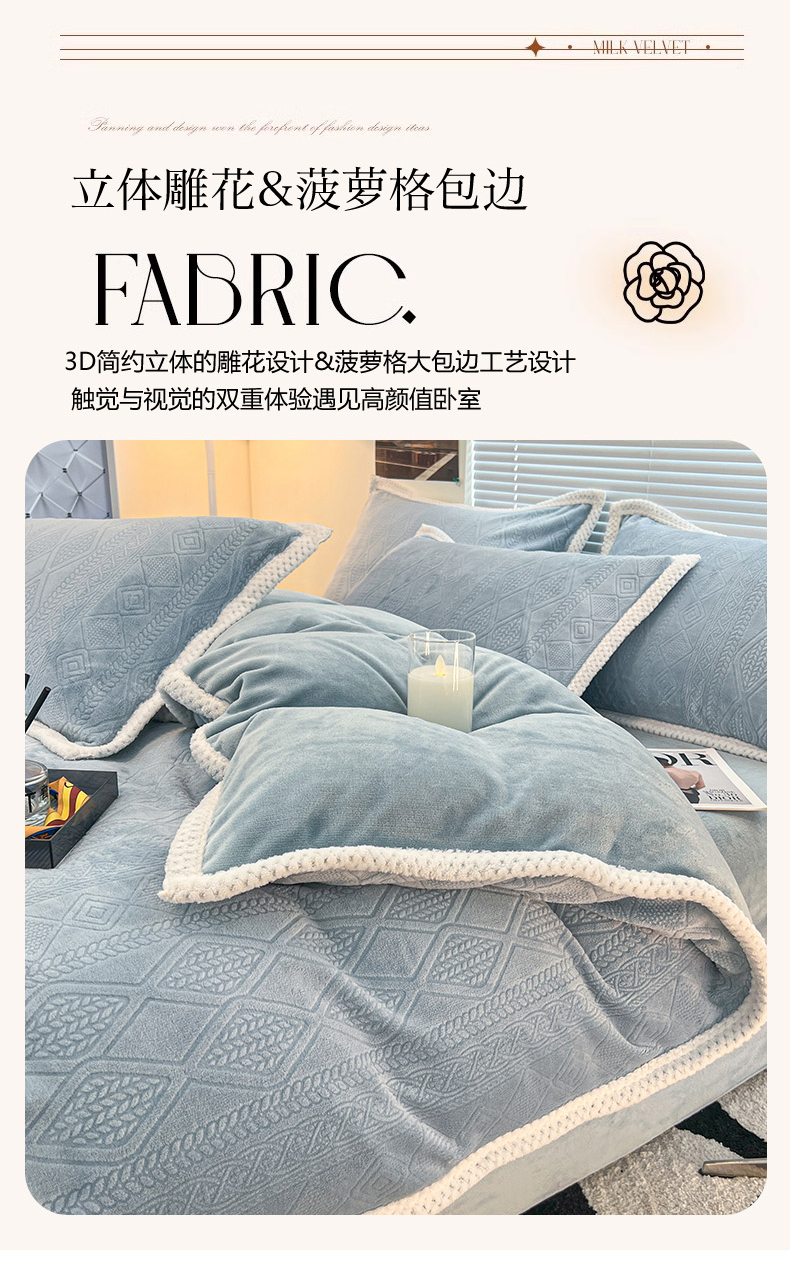(总)倾慕 2025新款兔绒立体雕花加厚保暖系列四件套,爱娜玉,春絮蓝,春絮绿,伊宁玉,伊宁紫,优朵粉,珍妮粉,珍妮湖蓝