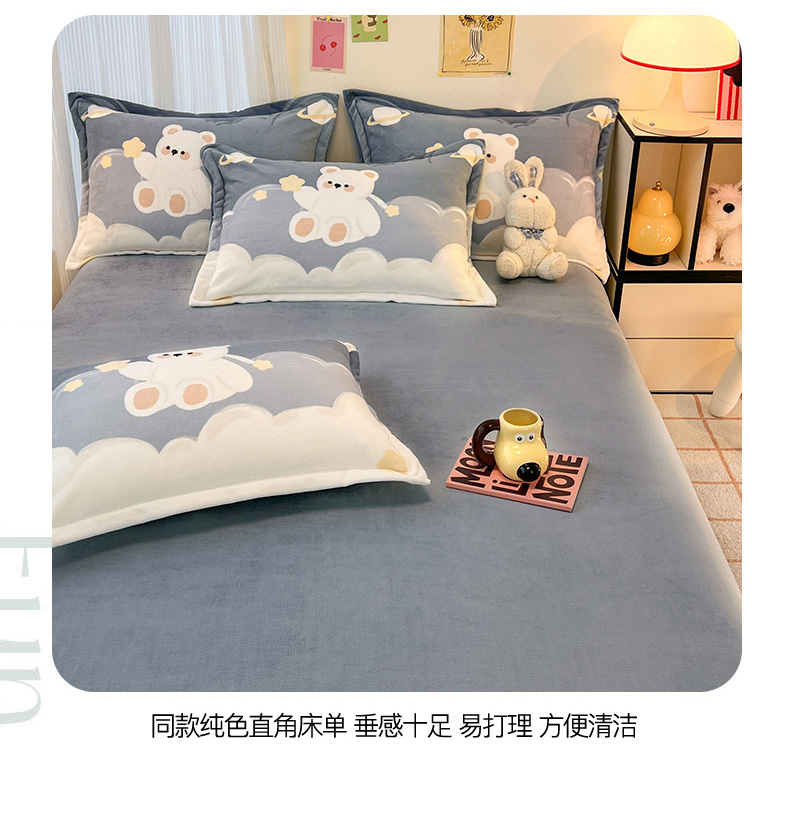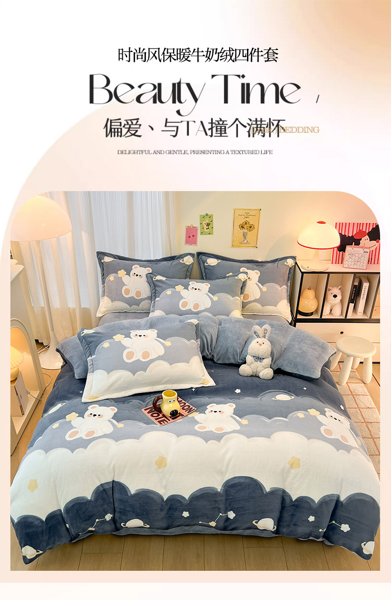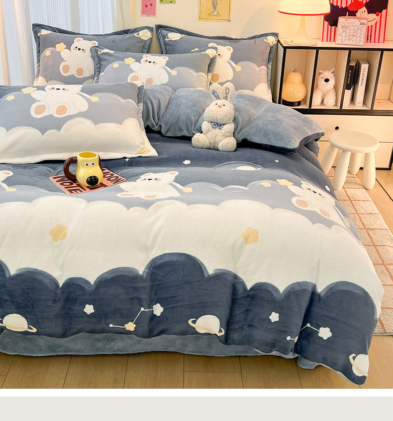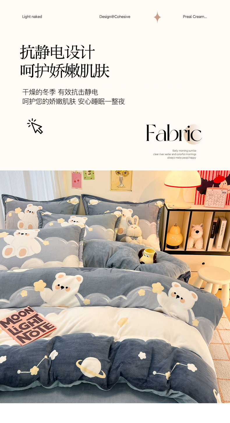 当前位置: 91家纺网 > 商品网购 > 床品套件 > 四件套 > 牛奶绒四件套 > 2024新款A类高克重时尚风牛奶绒加厚保暖系列套件单品-四件套 星球小熊