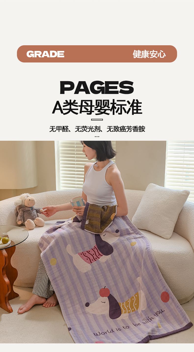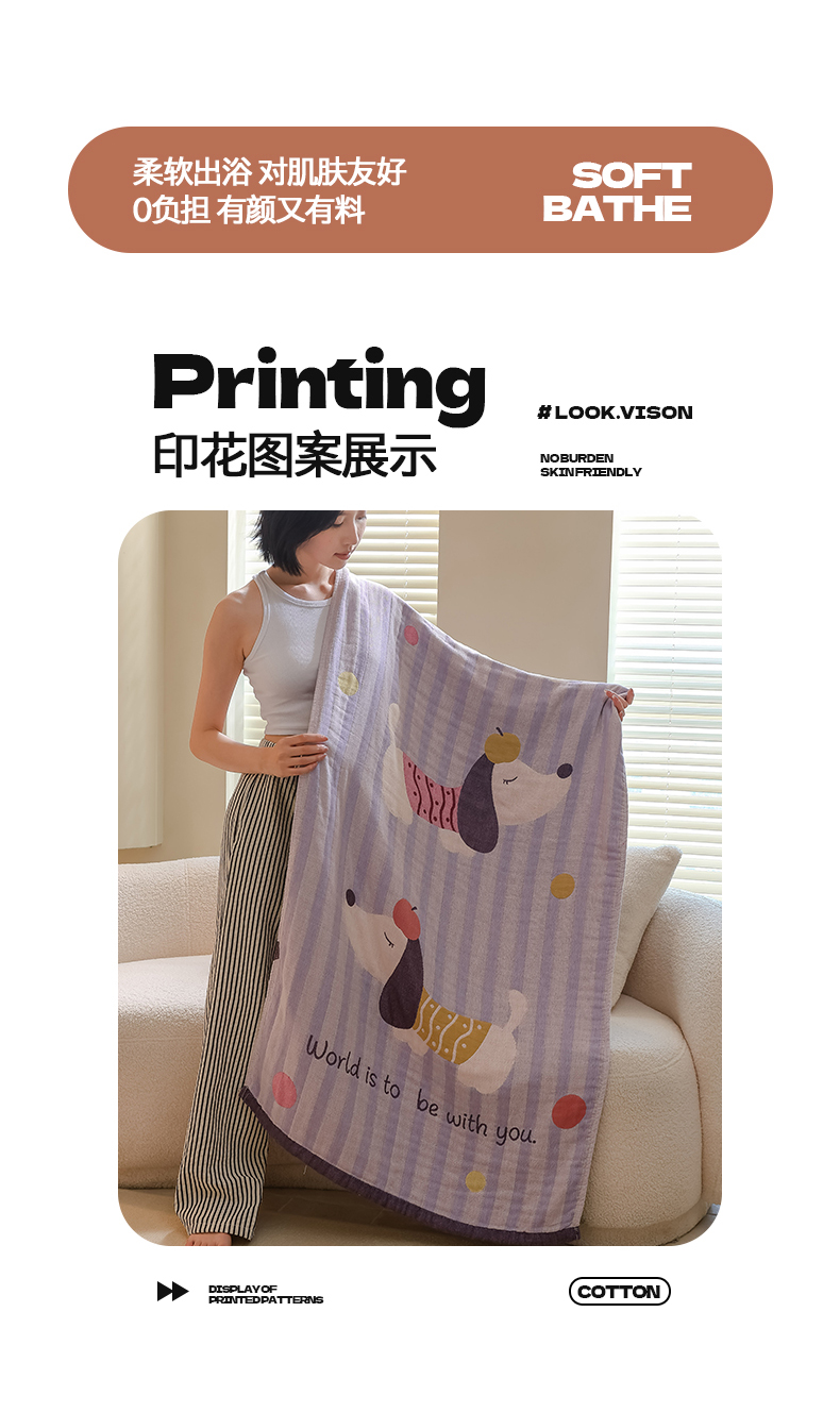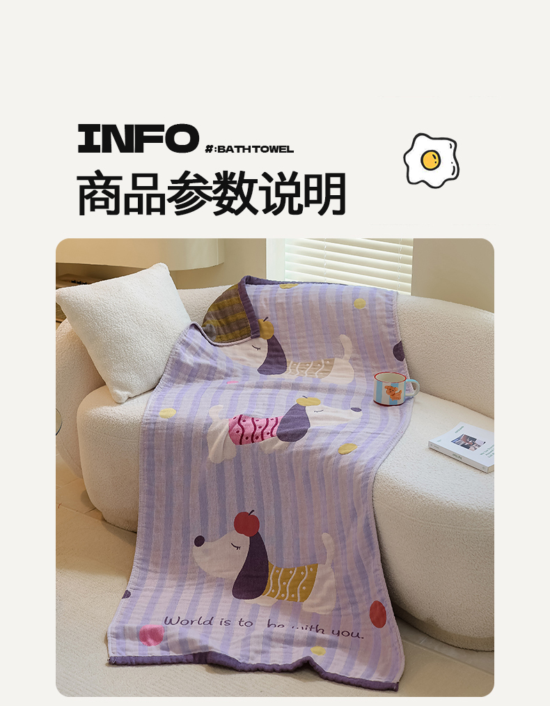 当前位置: 91家纺网 > 商品网购 > 居家日用 > 毛巾/浴巾/浴袍 > 浴巾 > 雯雨家纺 2024新款四层全棉纱布浴巾加大毛巾80*160cm 平安狗