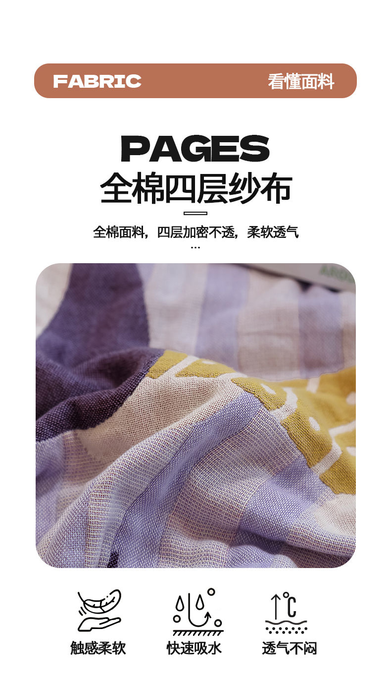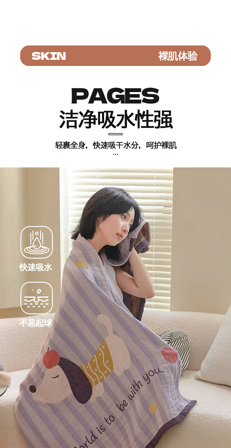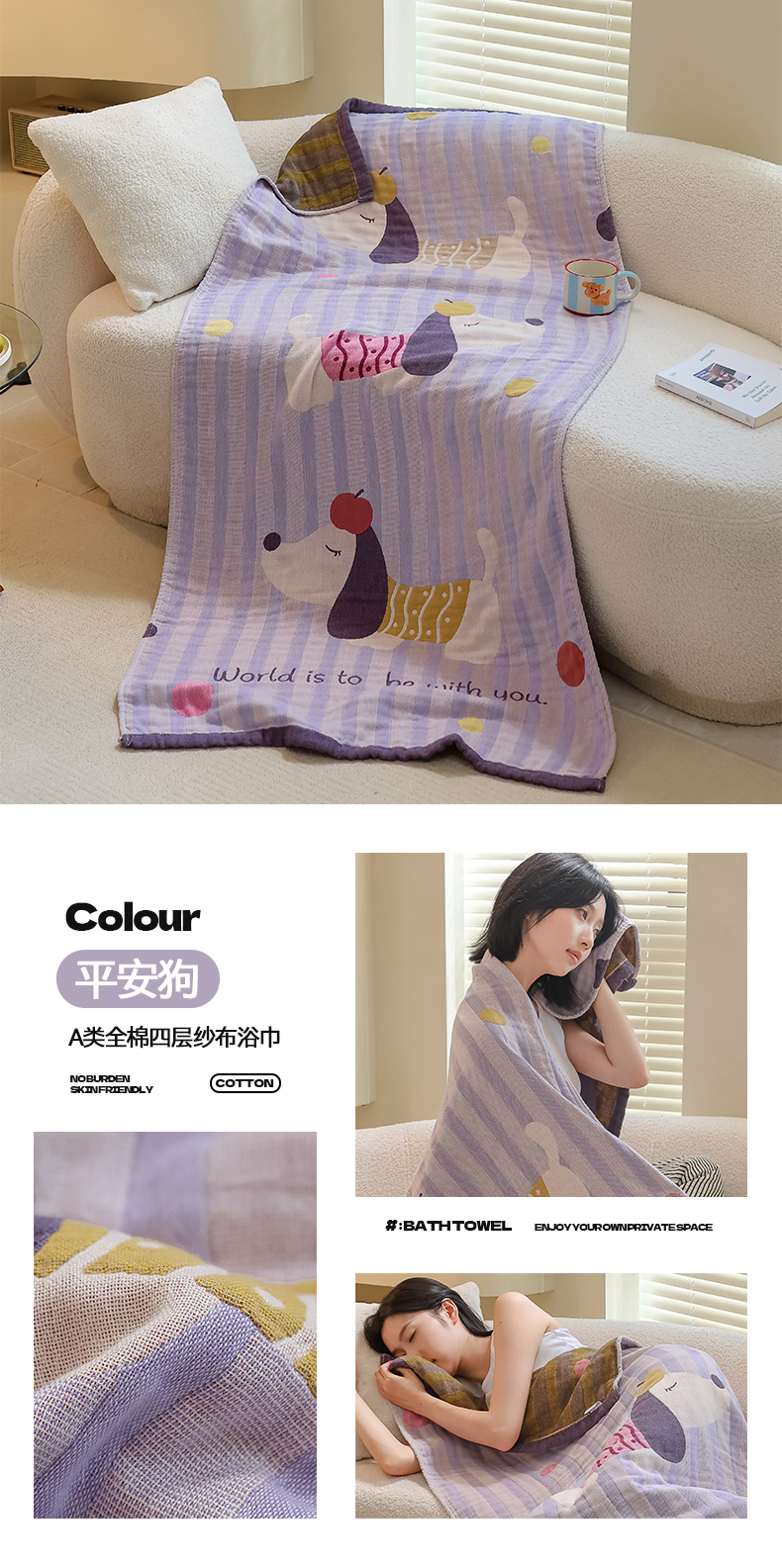 当前位置: 91家纺网 > 商品网购 > 居家日用 > 毛巾/浴巾/浴袍 > 浴巾 > 雯雨家纺 2024新款四层全棉纱布浴巾加大毛巾80*160cm 平安狗