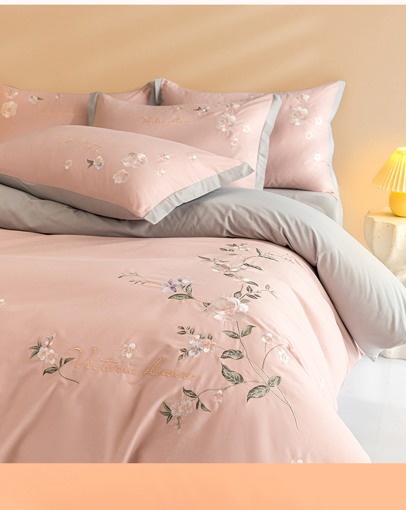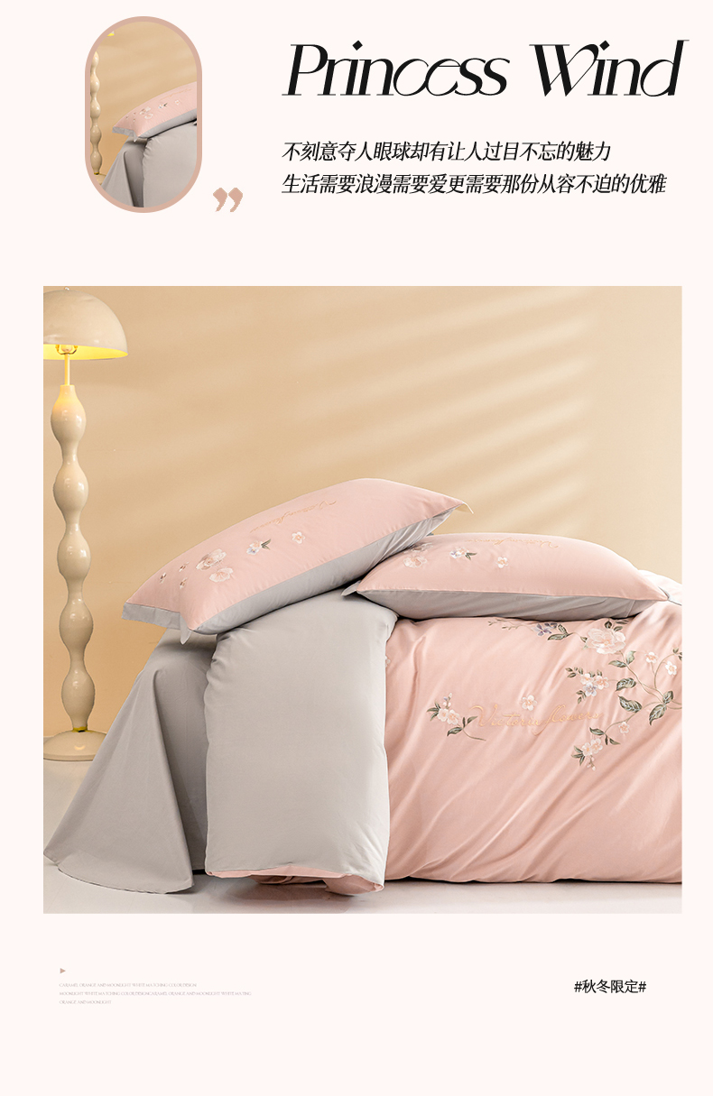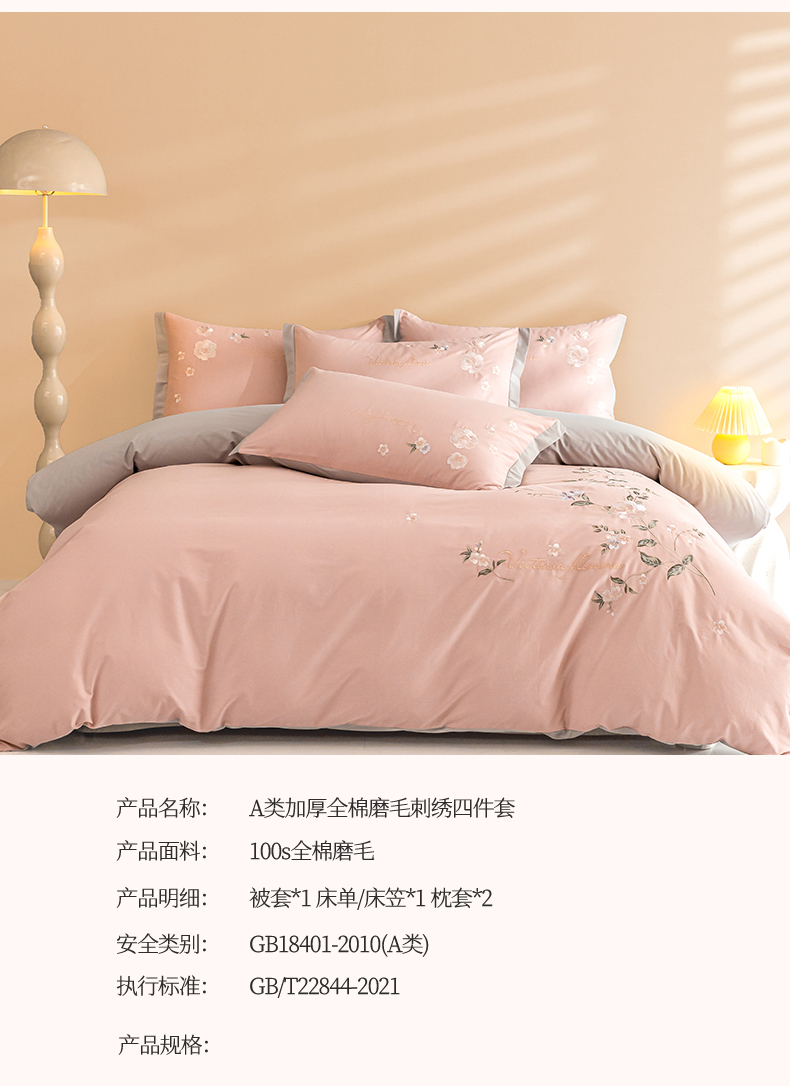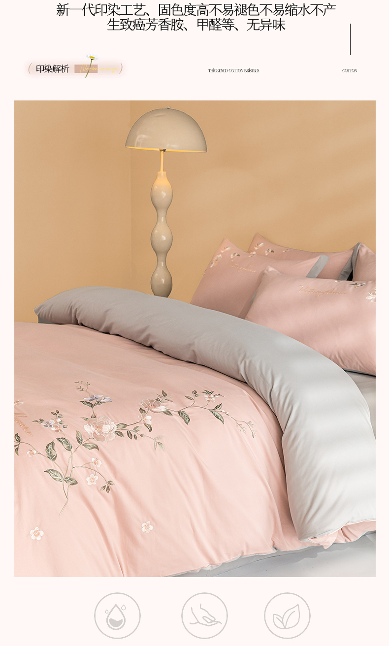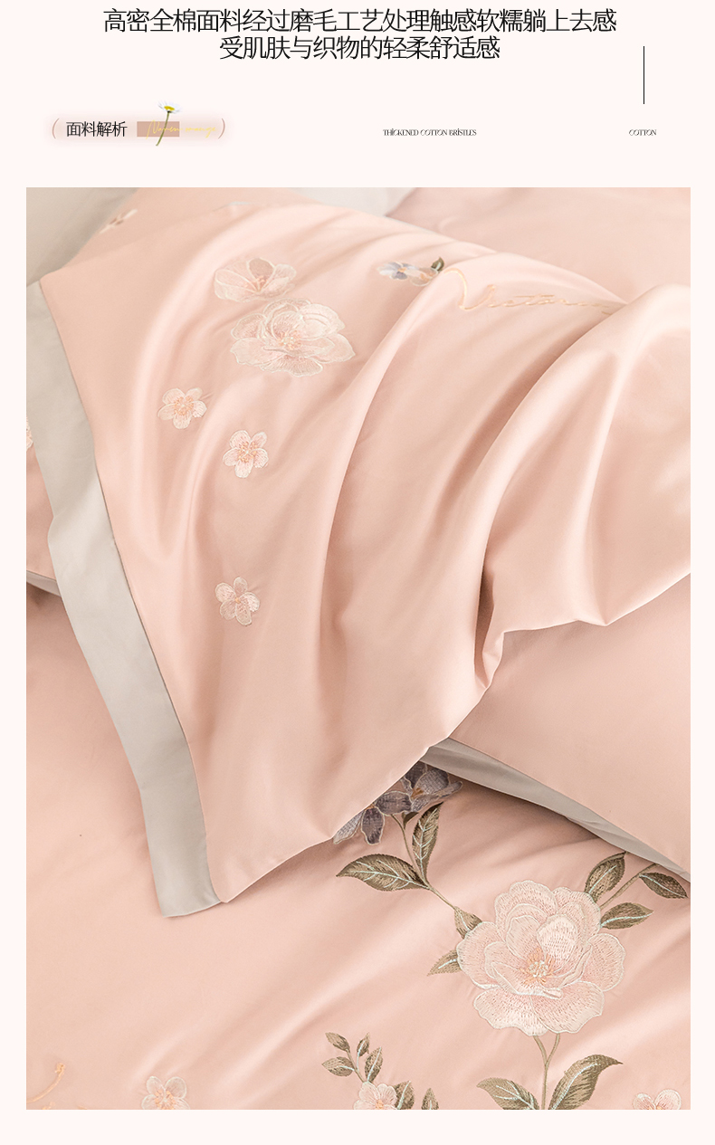 商品名称:2024新保暖-秋冬A类100支全棉磨毛刺绣四件套-花语系列 花语-粉芋山灰