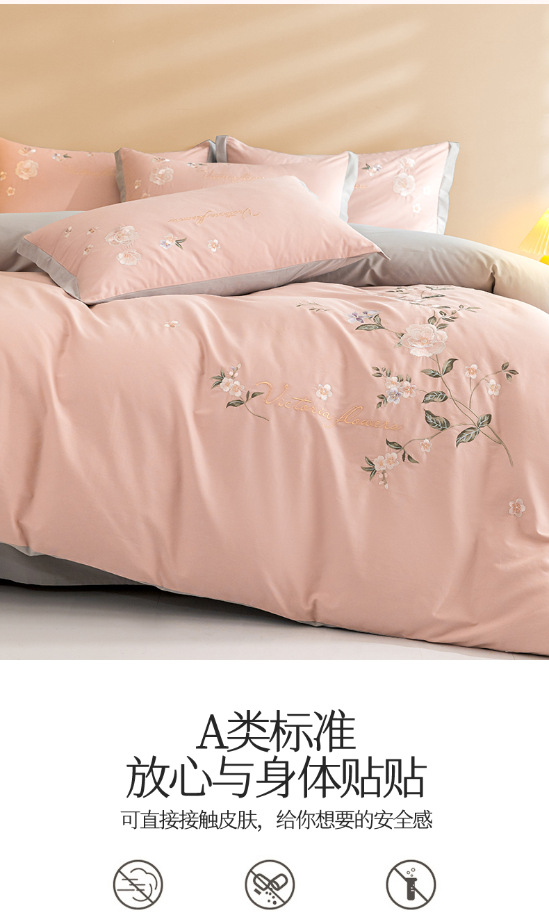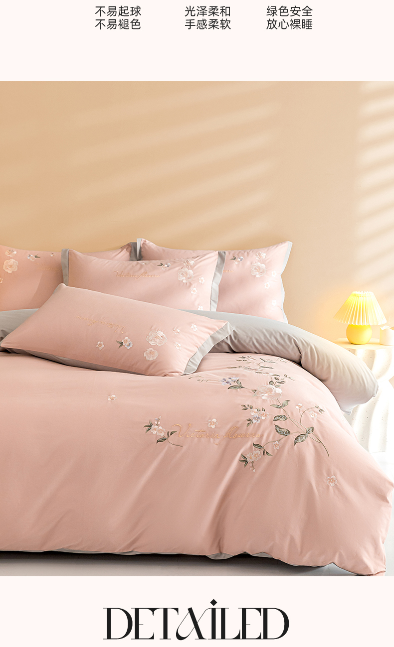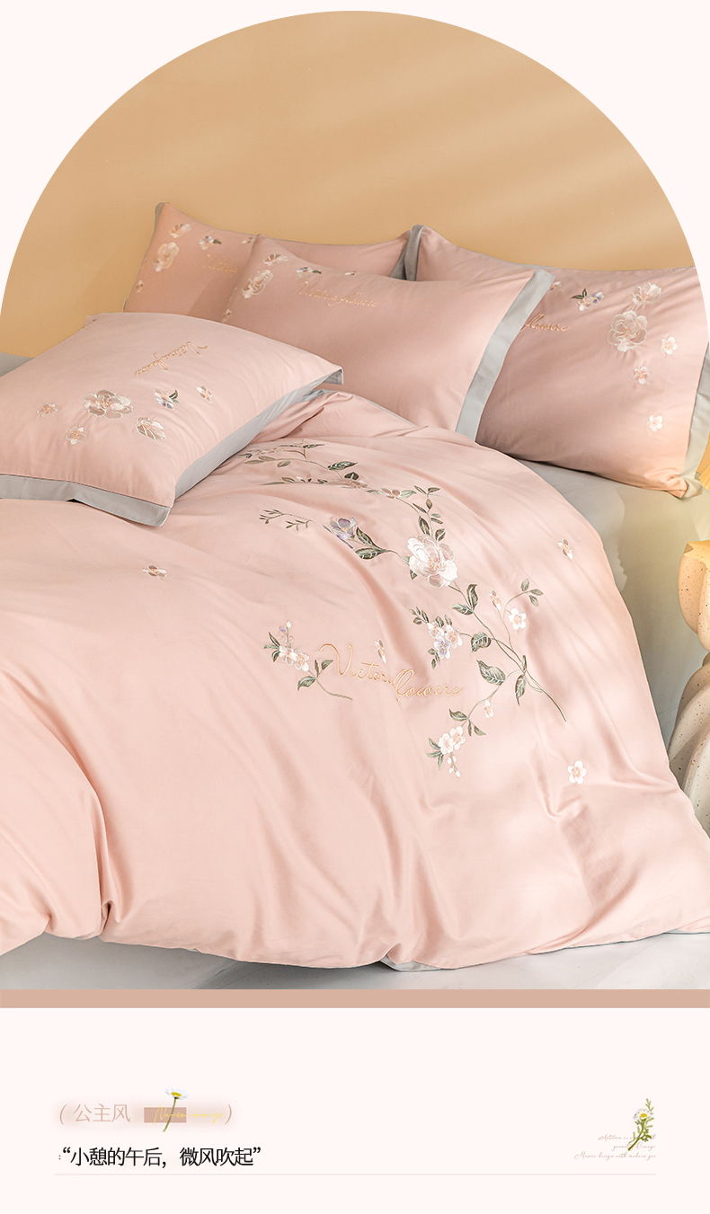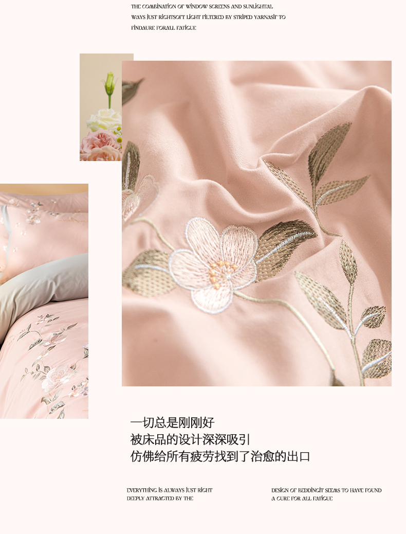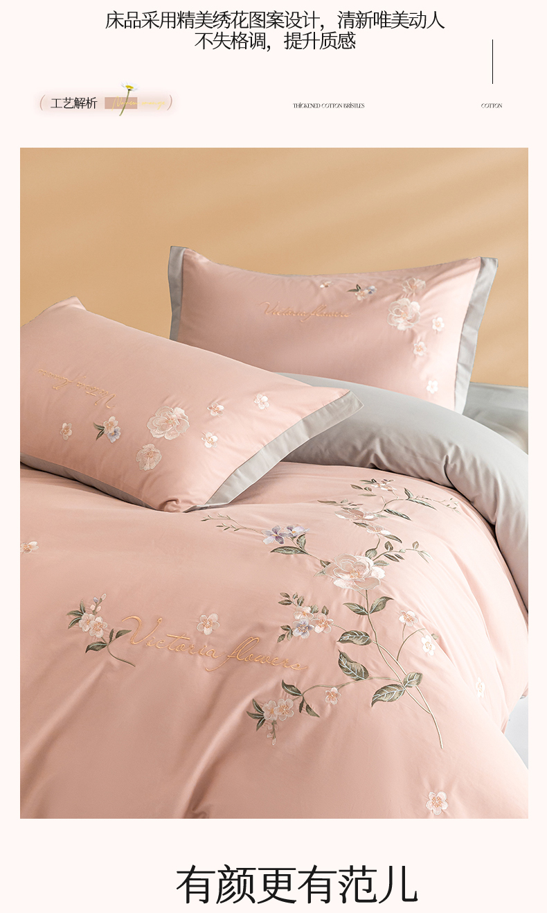 商品名称:2024新保暖-秋冬A类100支全棉磨毛刺绣四件套-花语系列 花语-粉芋山灰