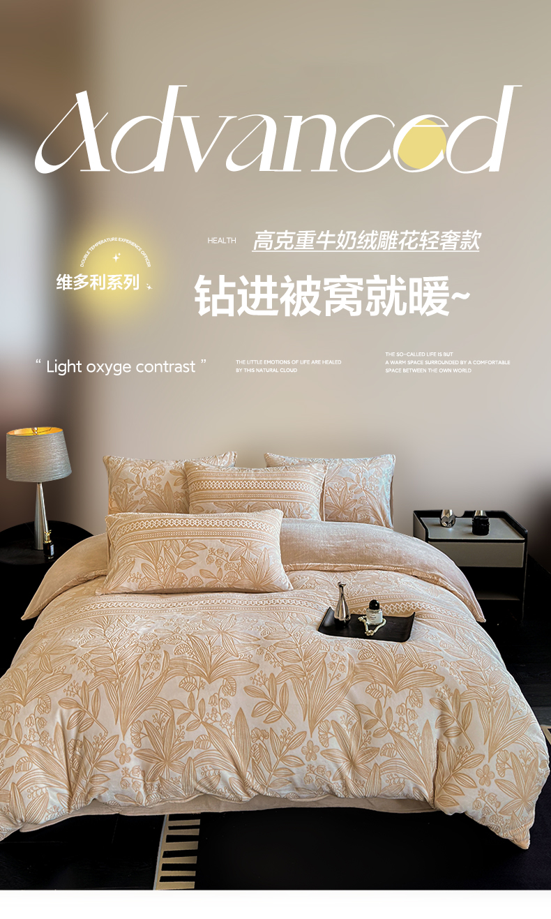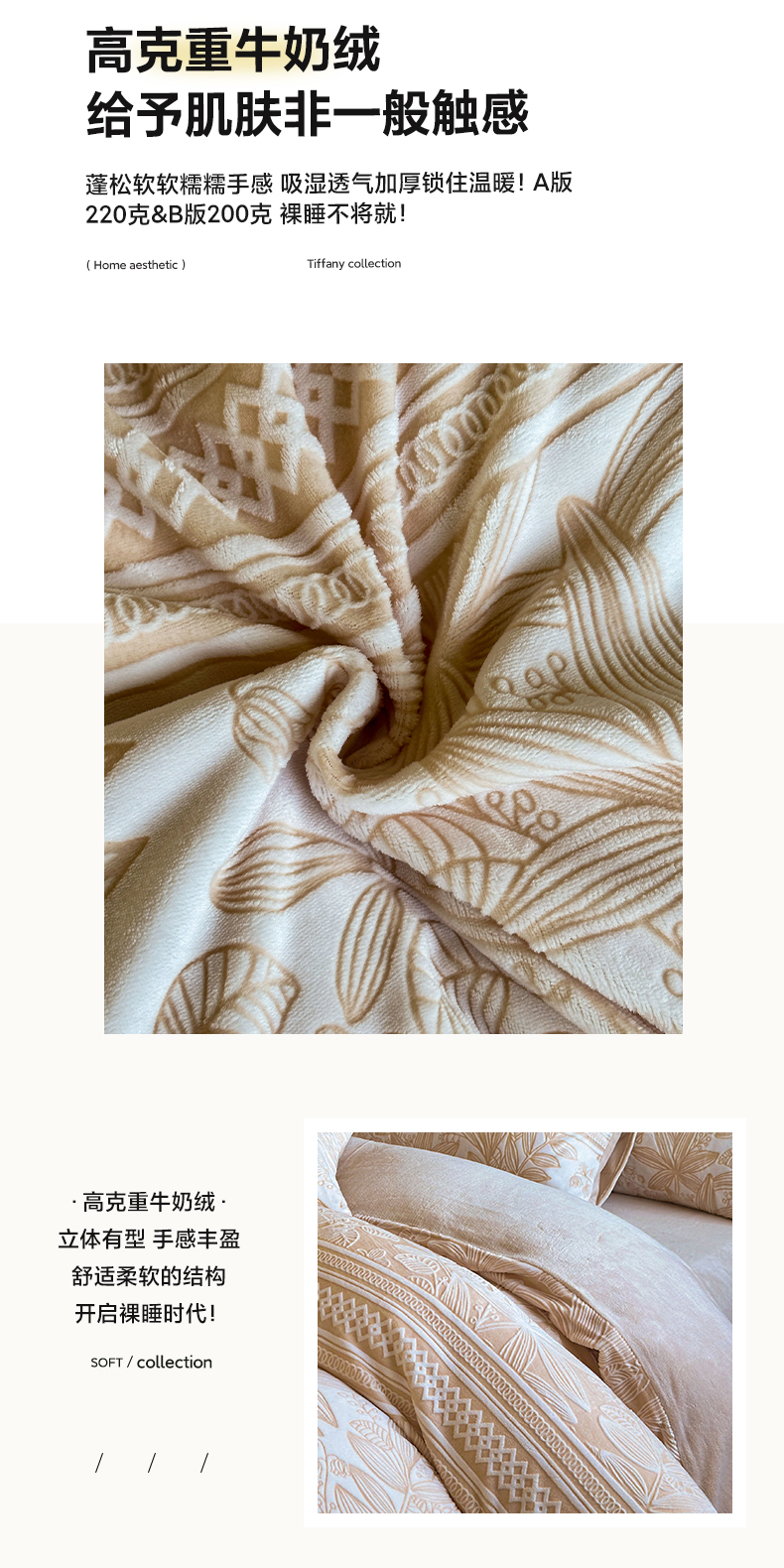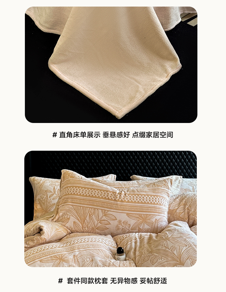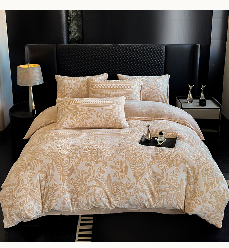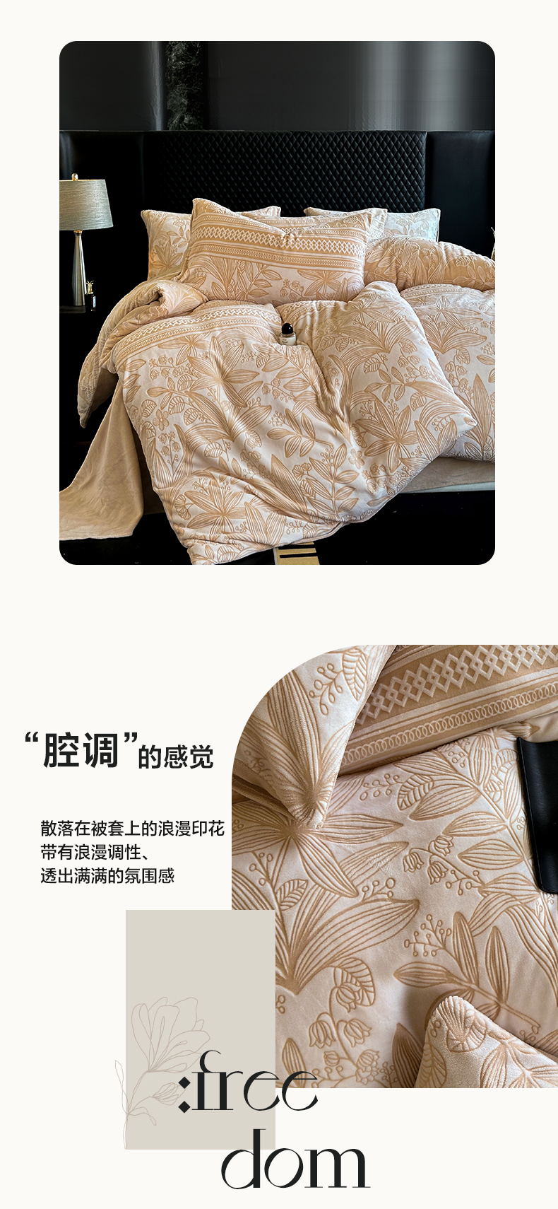 当前位置: 91家纺网 > 商品网购 > 床品套件 > 四件套 > 牛奶绒四件套 > 莱登卡奴 2024新款高克重牛奶绒雕花轻奢款四件套-维多利系列 花间奶杏