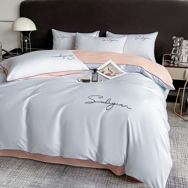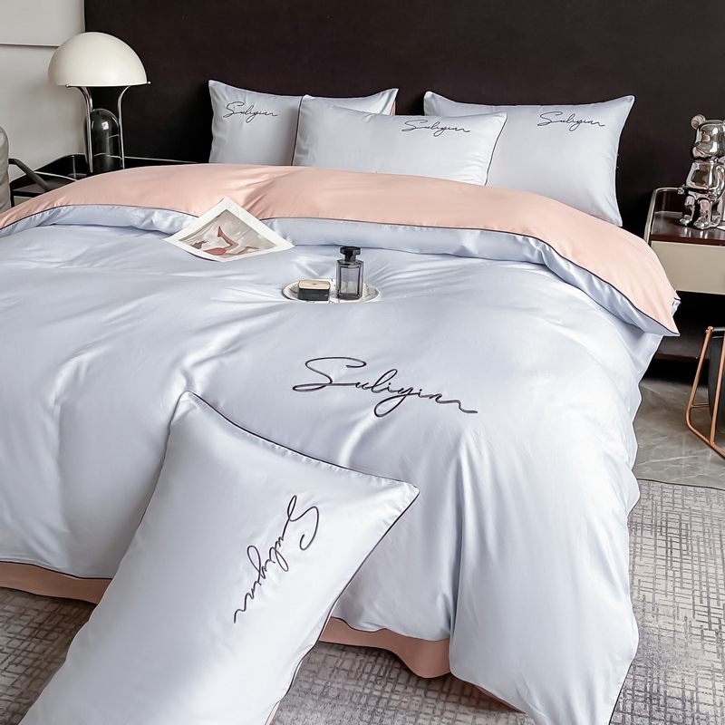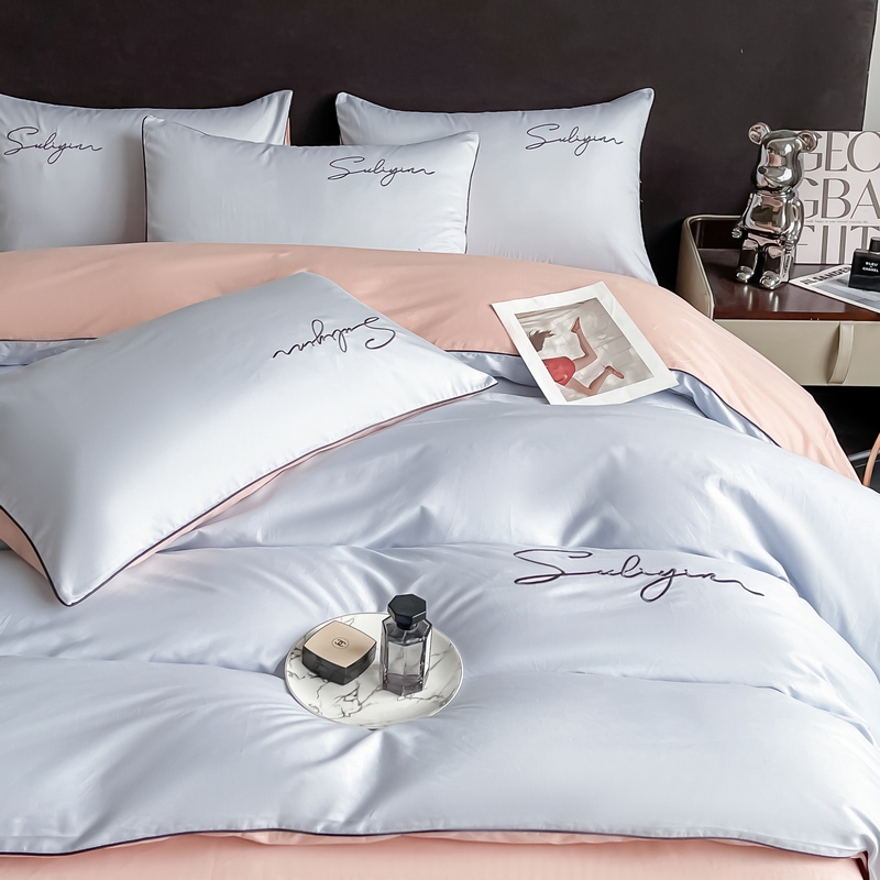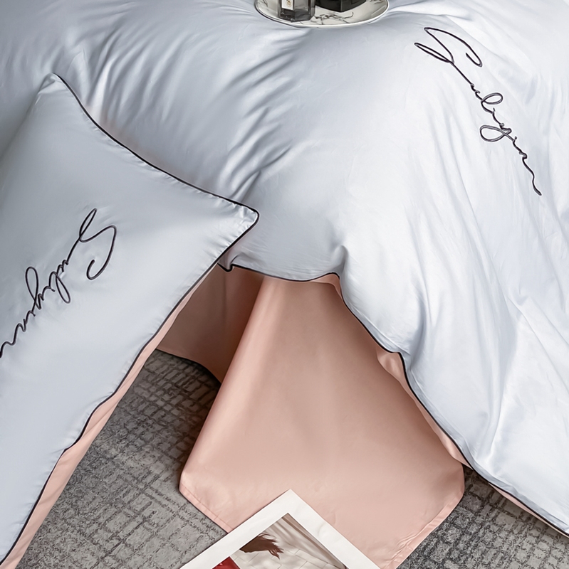 法莱妮毛毯 2025新款轻奢13372喷气纯色百分百纯棉全棉刺绣麻绳四件套 天空蓝+玫瑰粉