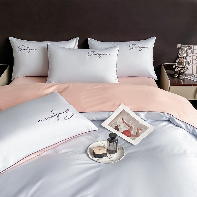 商品名称:法莱妮毛毯 2025新款轻奢13372喷气纯色百分百纯棉全棉刺绣麻绳四件套 天空蓝+玫瑰粉