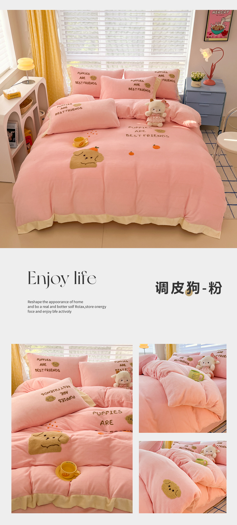 商品名称:眷恋家纺 2024新款牛奶绒毛巾绣宽边四件套-调皮狗系列 调皮狗-粉
