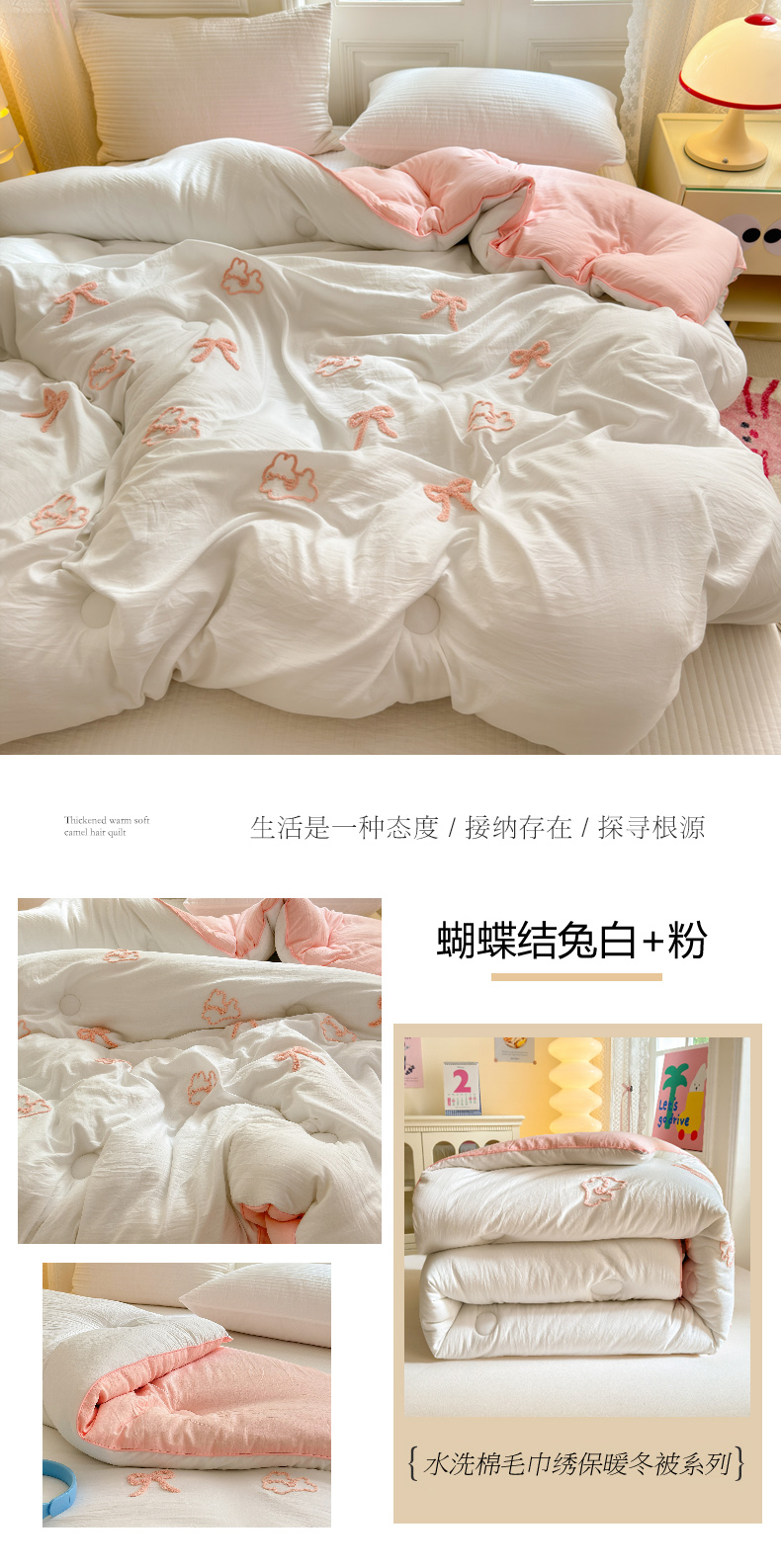 商品名称:花伞 2024新款INS小红书毛巾绣水洗棉冬被 蝴蝶结兔白+粉