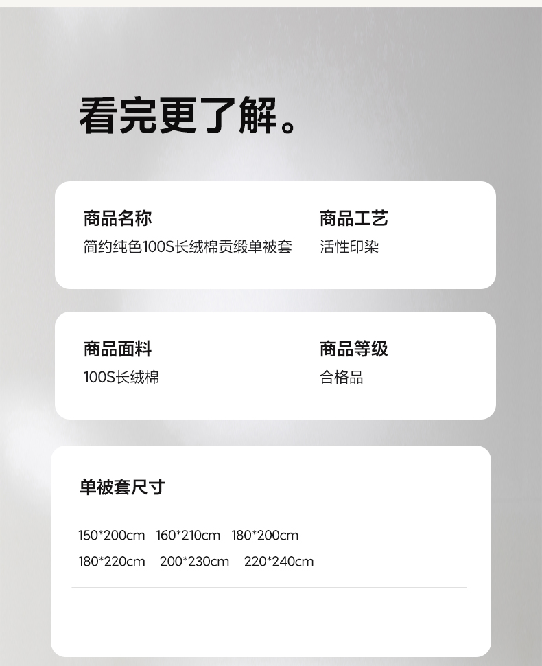 当前位置: 91家纺网 > 商品网购 > 床上用品 > 被套 > 轩和家居 2024新款A类50S贡缎长绒棉单被套系列 梦境灰