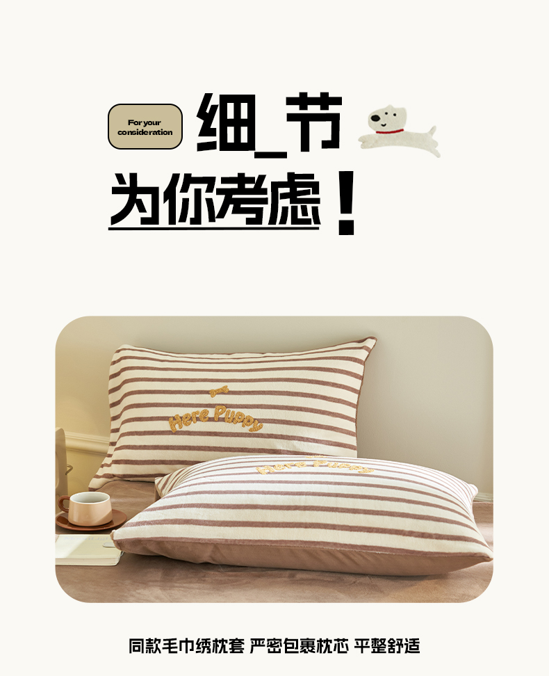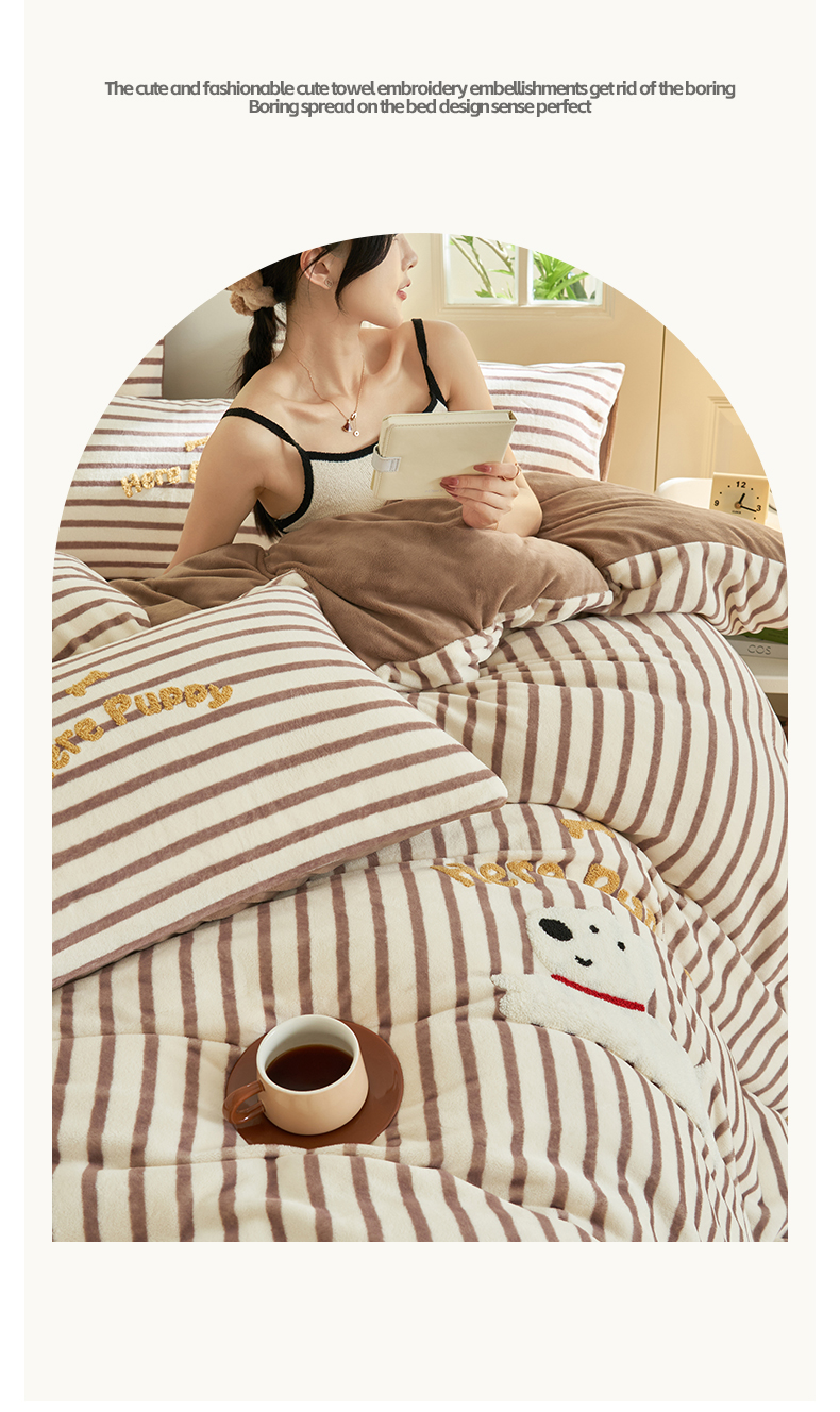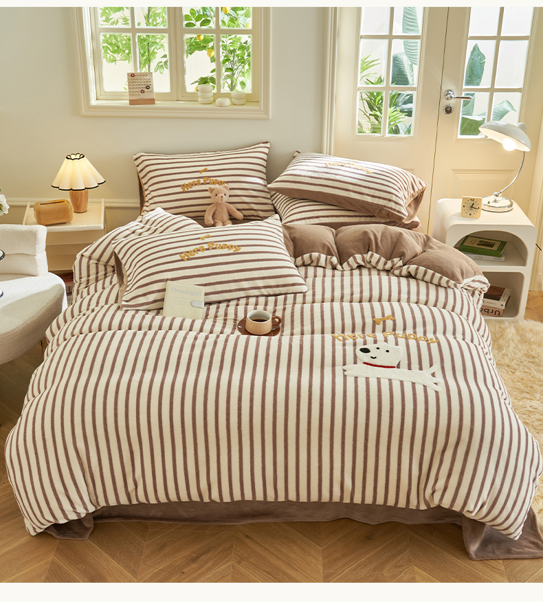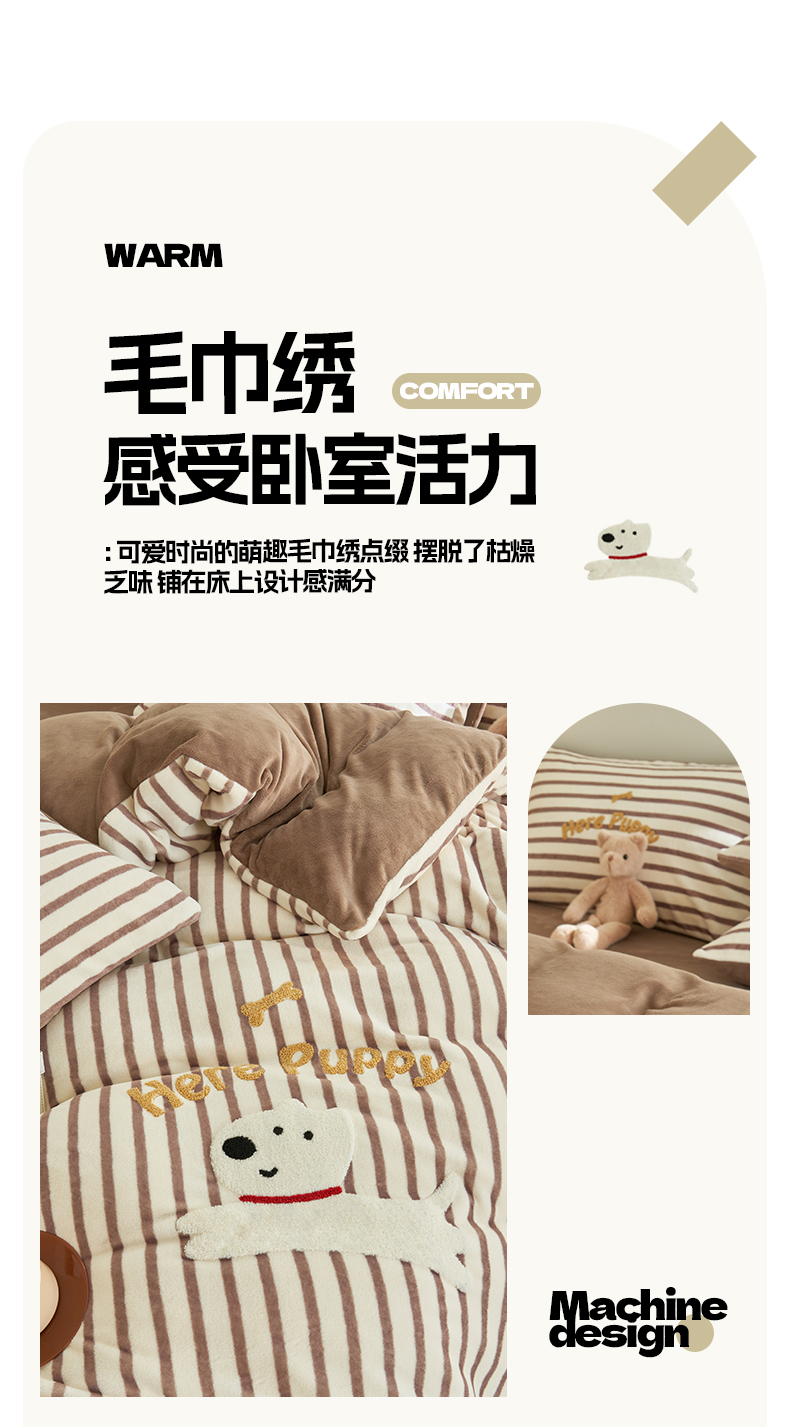当前位置: 91家纺网 > 商品网购 > 床品套件 > 四件套 > 牛奶绒四件套 > 晨曦家纺 2024新款卡通毛巾绣牛奶绒卡通四件套 puppy狗-深咖