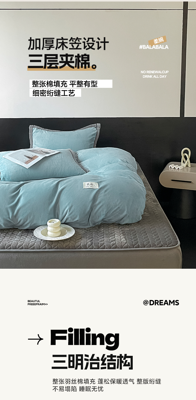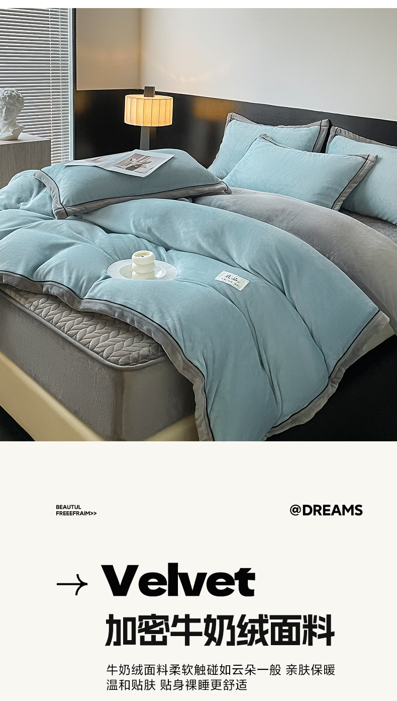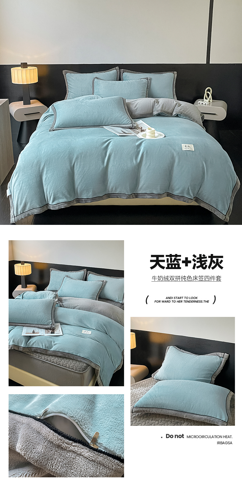 当前位置: 91家纺网 > 商品网购 > 床品套件 > 四件套 > 牛奶绒四件套 > 欧邦 新款纯色双拼牛奶绒夹棉床笠四件套 天蓝+浅灰