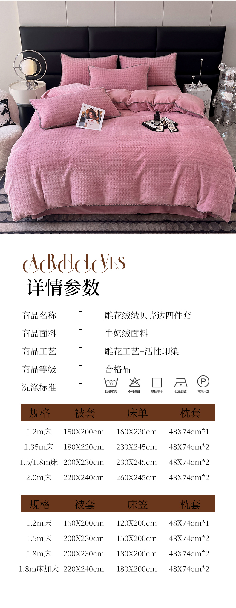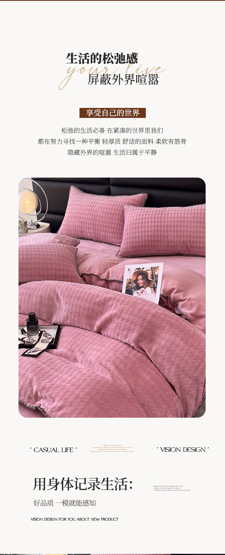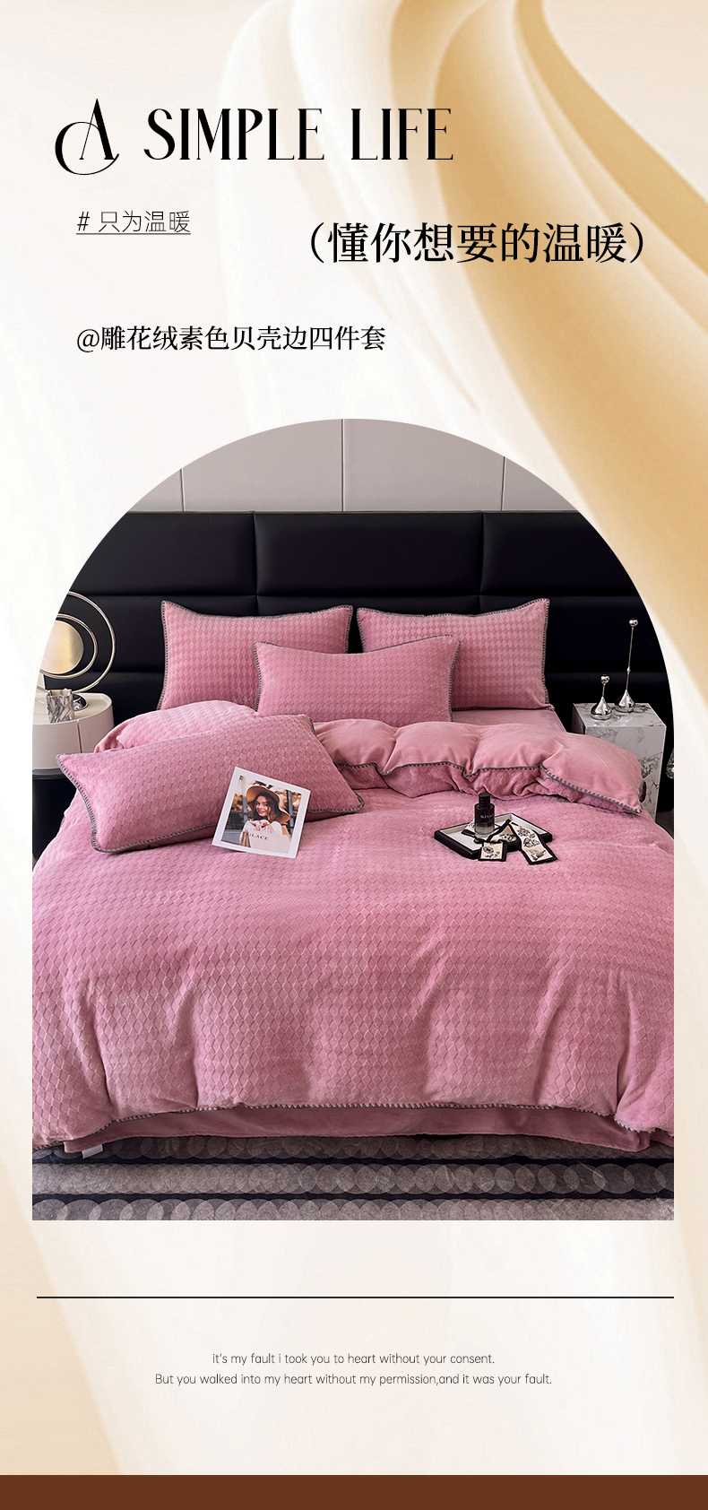 当前位置: 91家纺网 > 商品网购 > 床品套件 > 四件套 > 雕花绒四件套 > 菡宝 2024新款贝壳边无印风230g雕花绒床单四件套 菱形格-豆粉