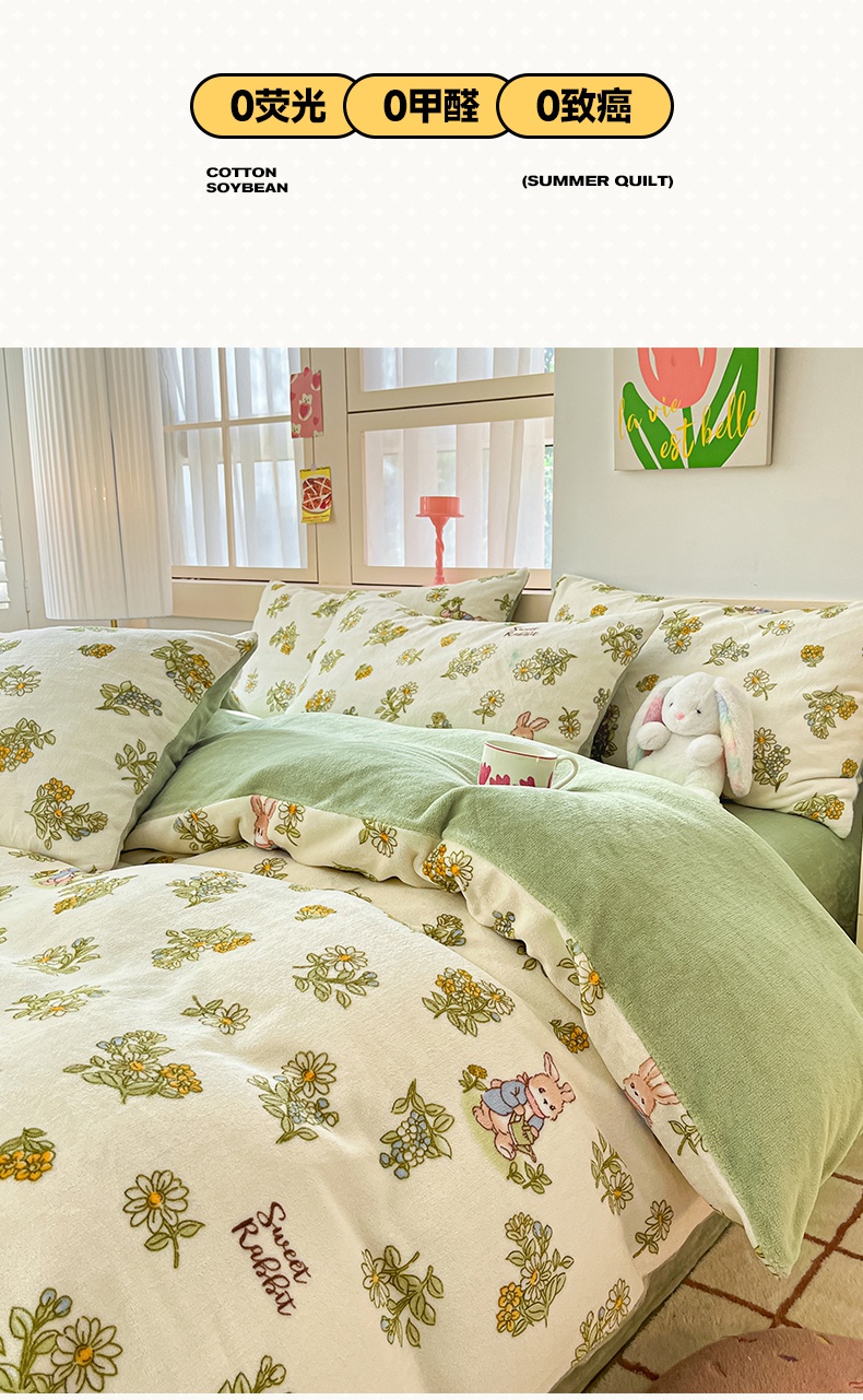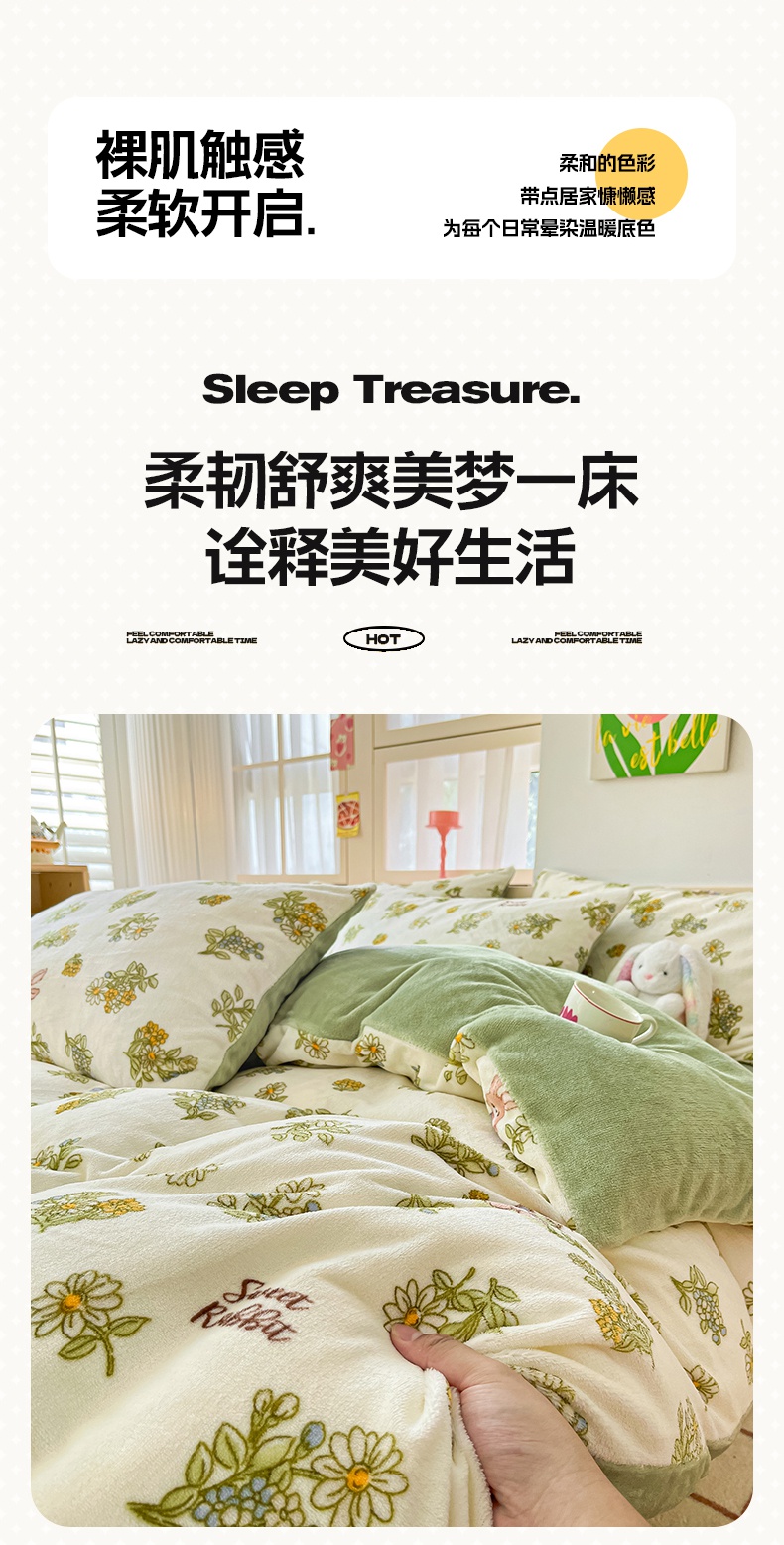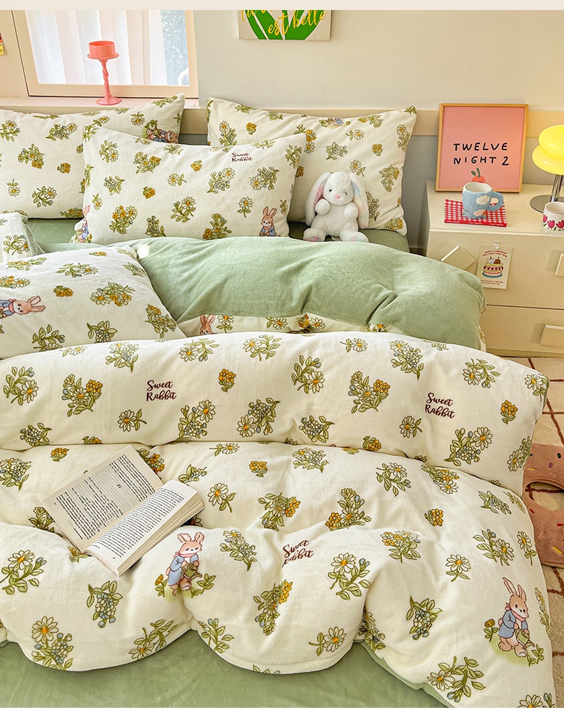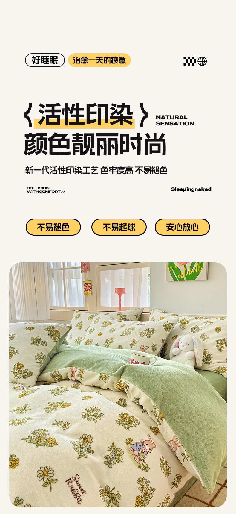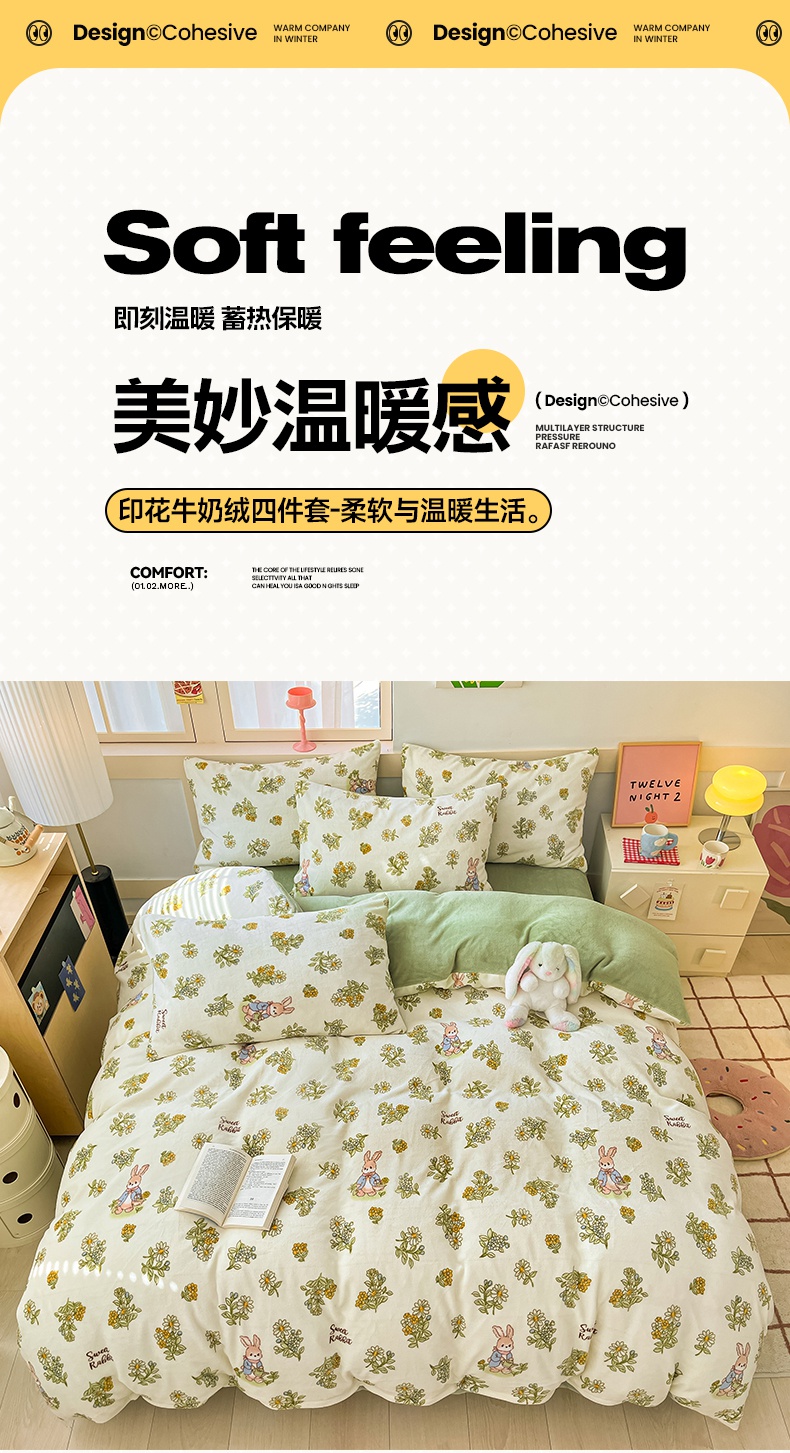 寐眠 2024新款高克重印花牛奶绒四件套风格一 采花小兔