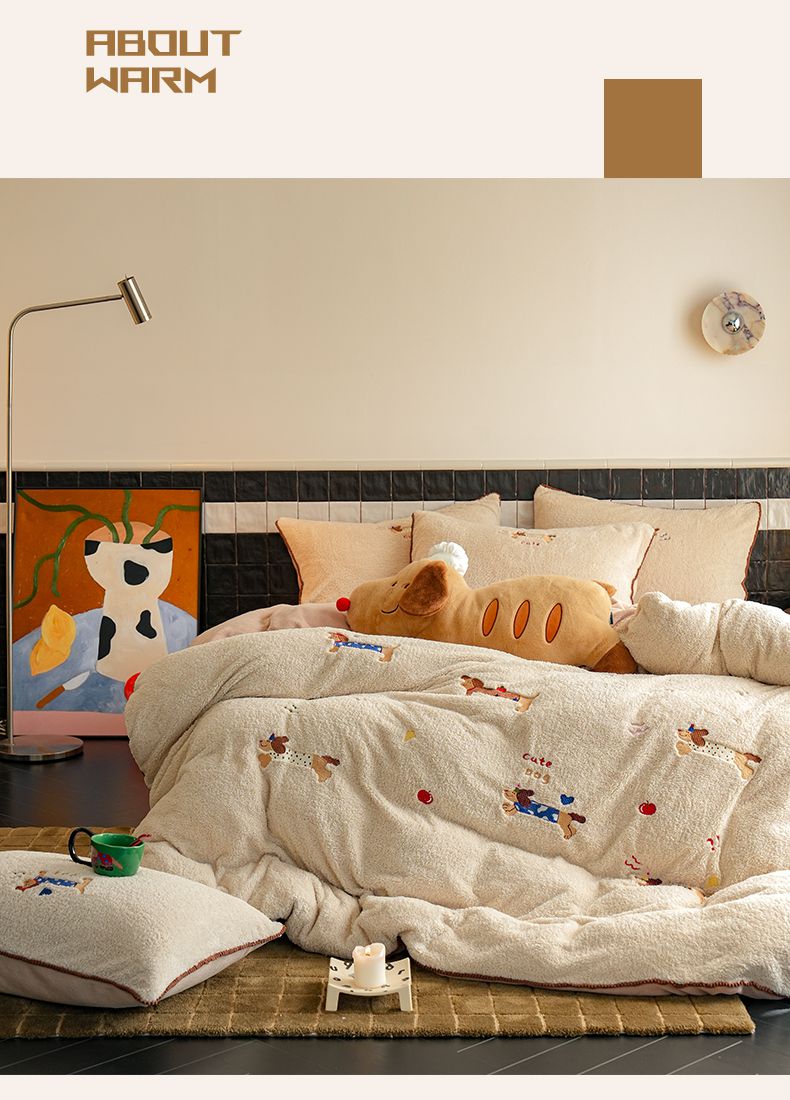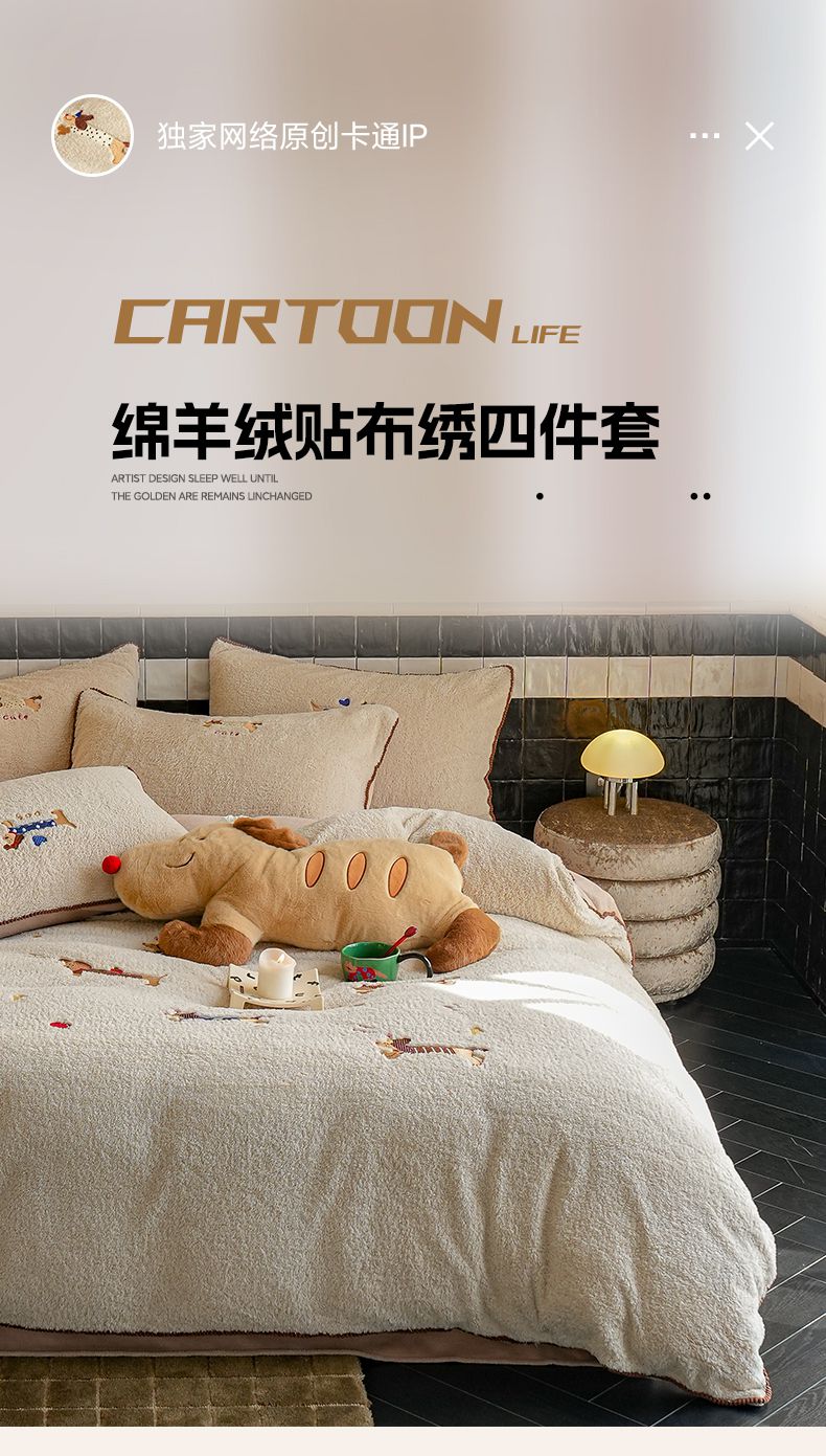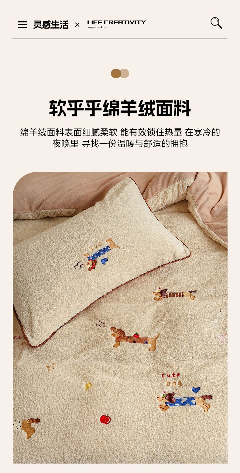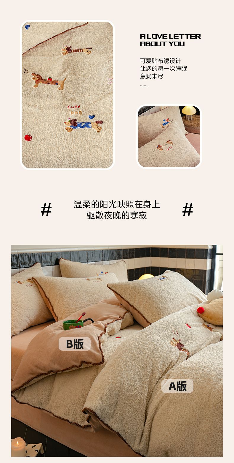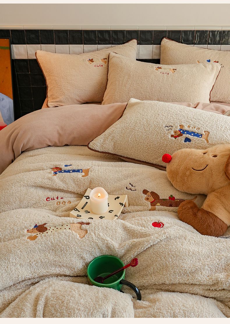 商品名称:秀色家纺 2025新款卡通风可爱少女心绵羊绒牛奶绒四件套加厚保暖秋冬季法兰绒刺绣被套 腊肠Dog