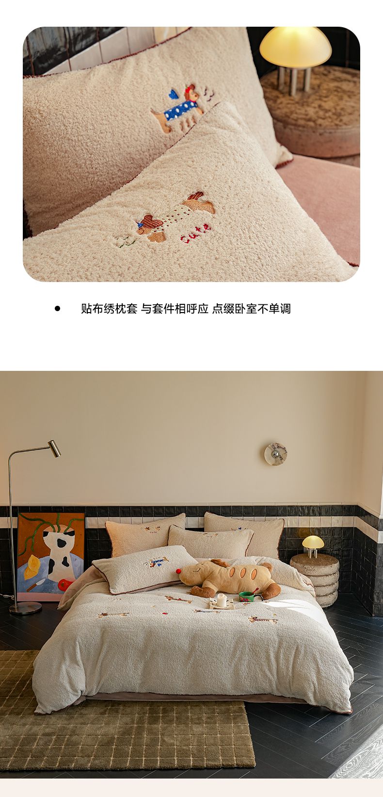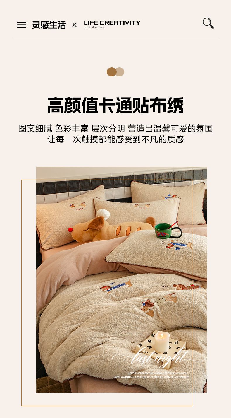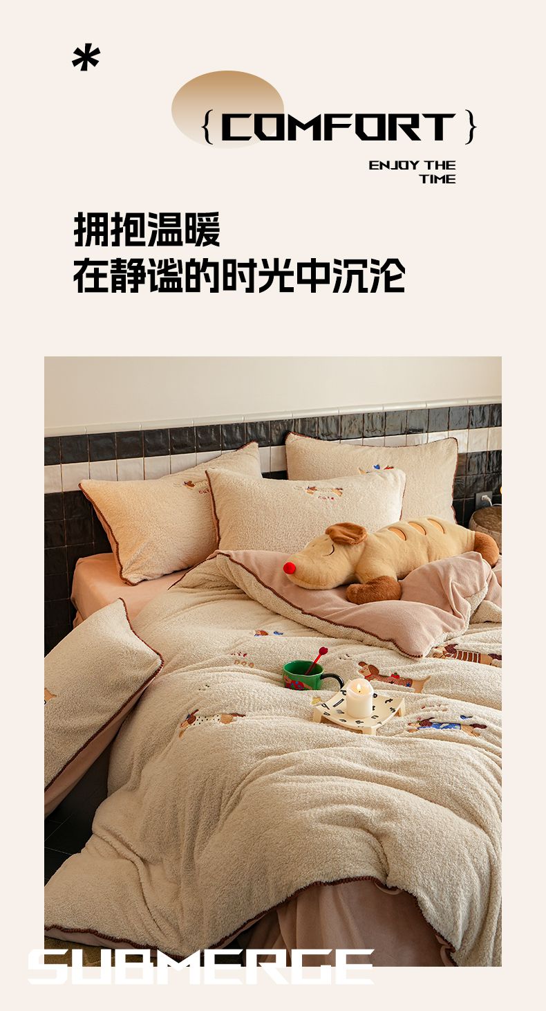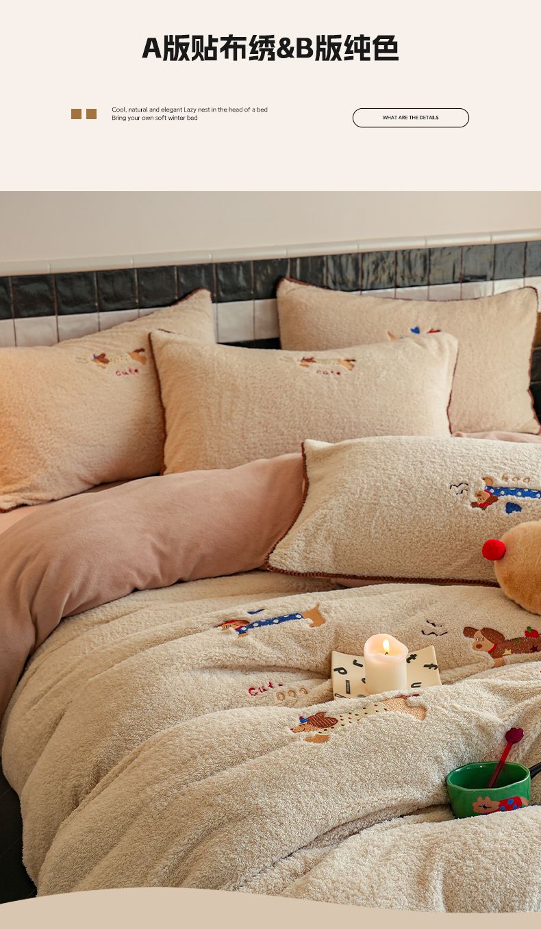 商品名称:秀色家纺 2025新款卡通风可爱少女心绵羊绒牛奶绒四件套加厚保暖秋冬季法兰绒刺绣被套 腊肠Dog