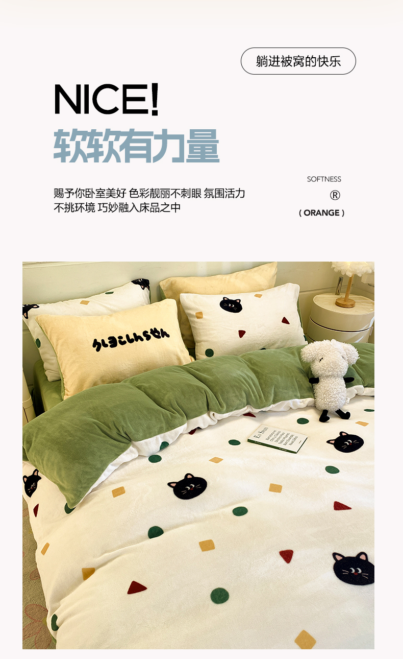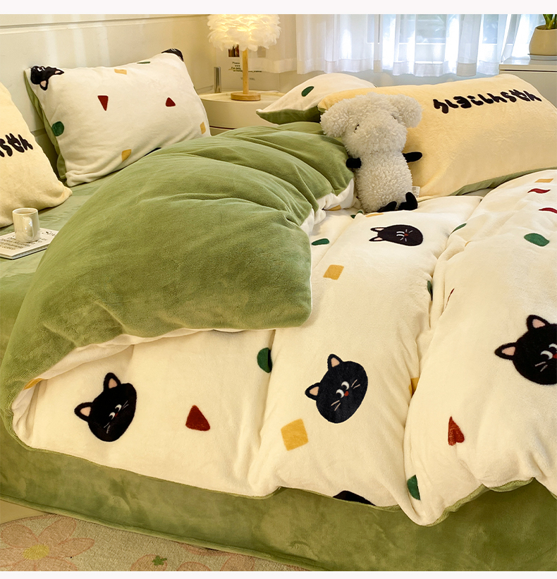 商品名称:如一 2024新款A类高克重印花牛奶绒四件套 色彩猫