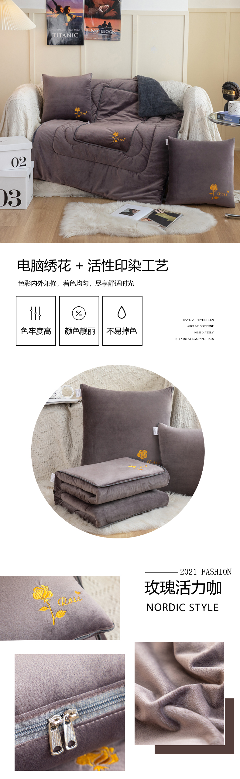 雷人家纺 2021新款宝宝绒保暖加厚双拼绣花抱枕被 玫瑰活力咖