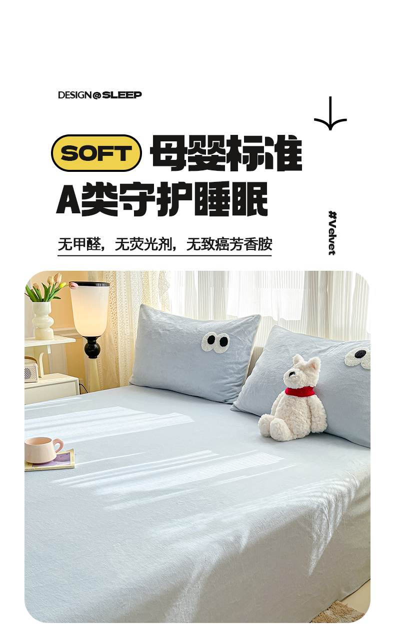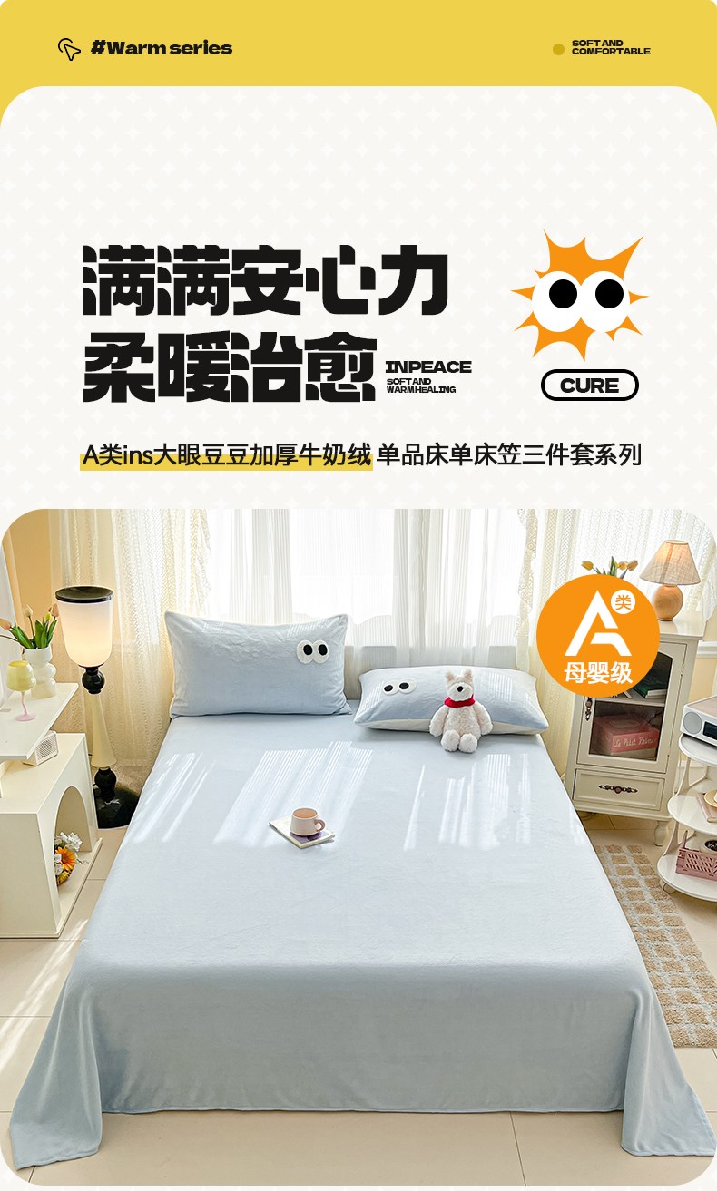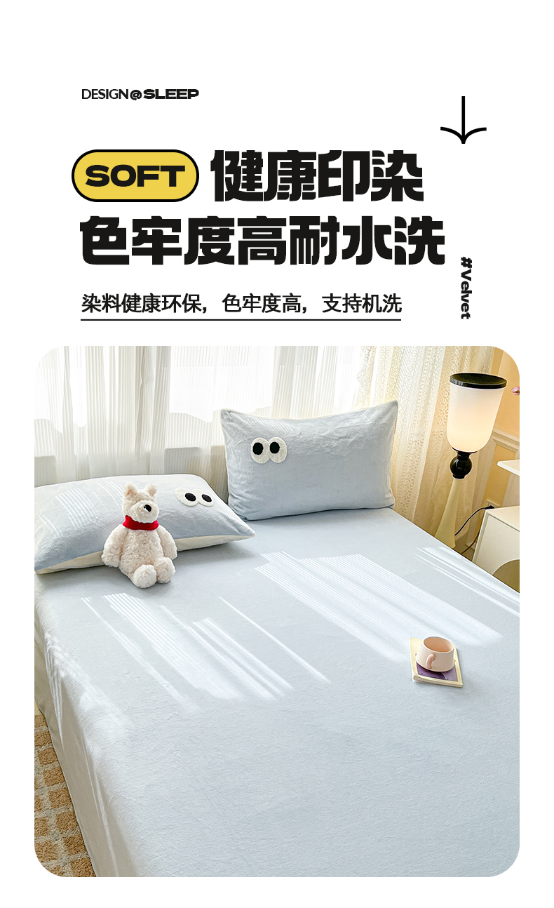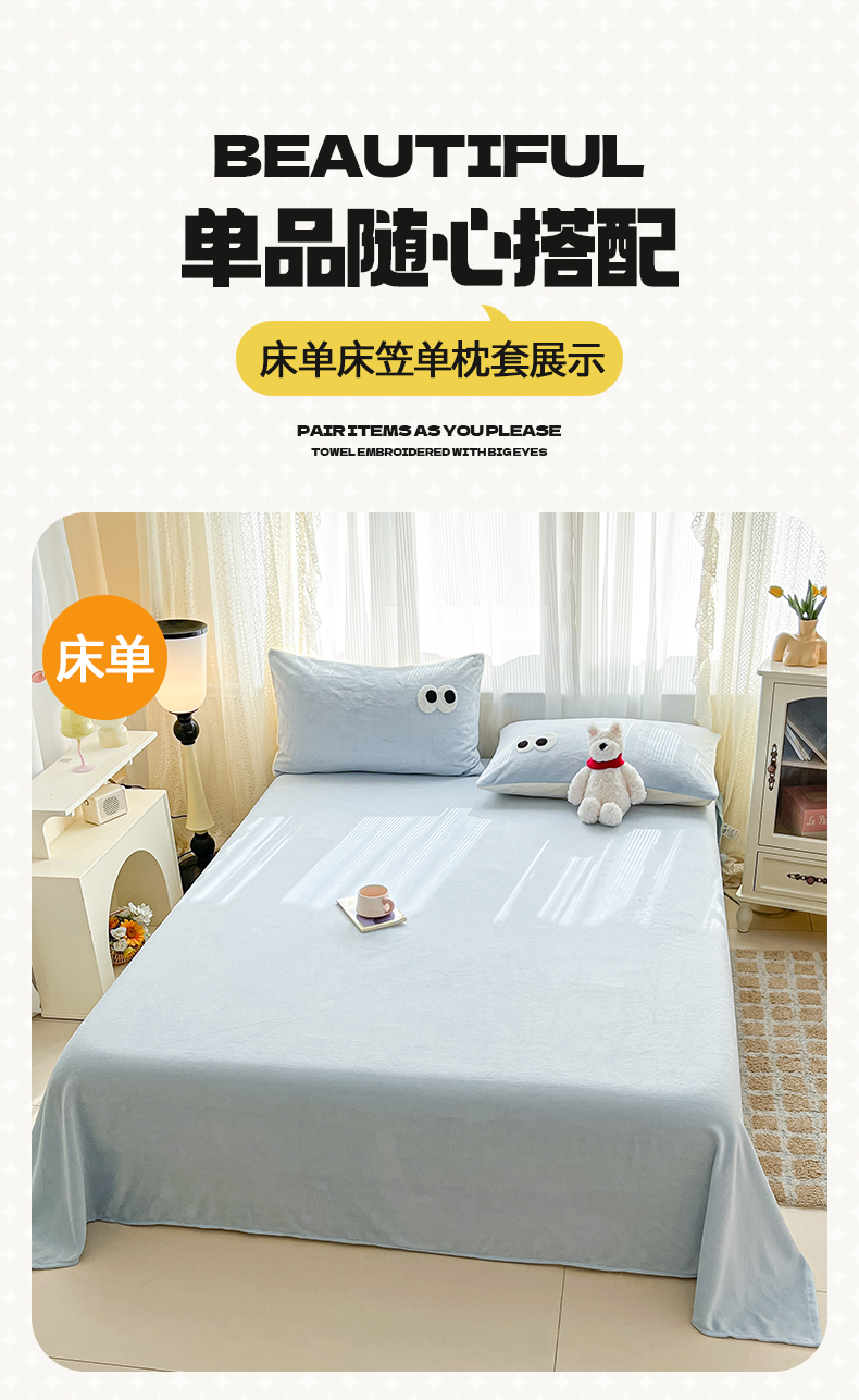 • 91家纺网 家纺一手货源 找家纺 桃子家居  2025新款A类ins大眼豆豆加厚牛奶绒单品床单床笠三件套系列 绒单品-大眼豆豆天蓝床单