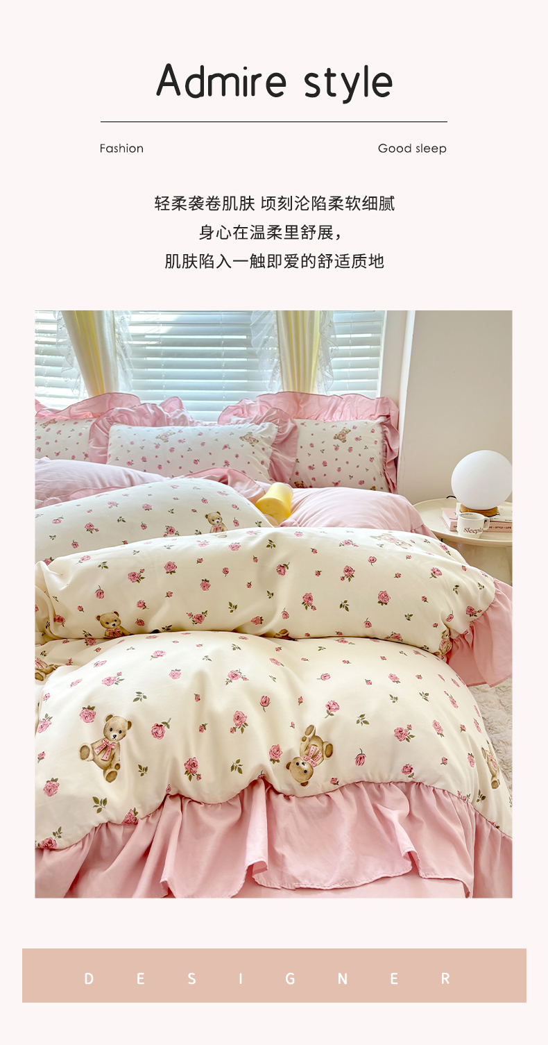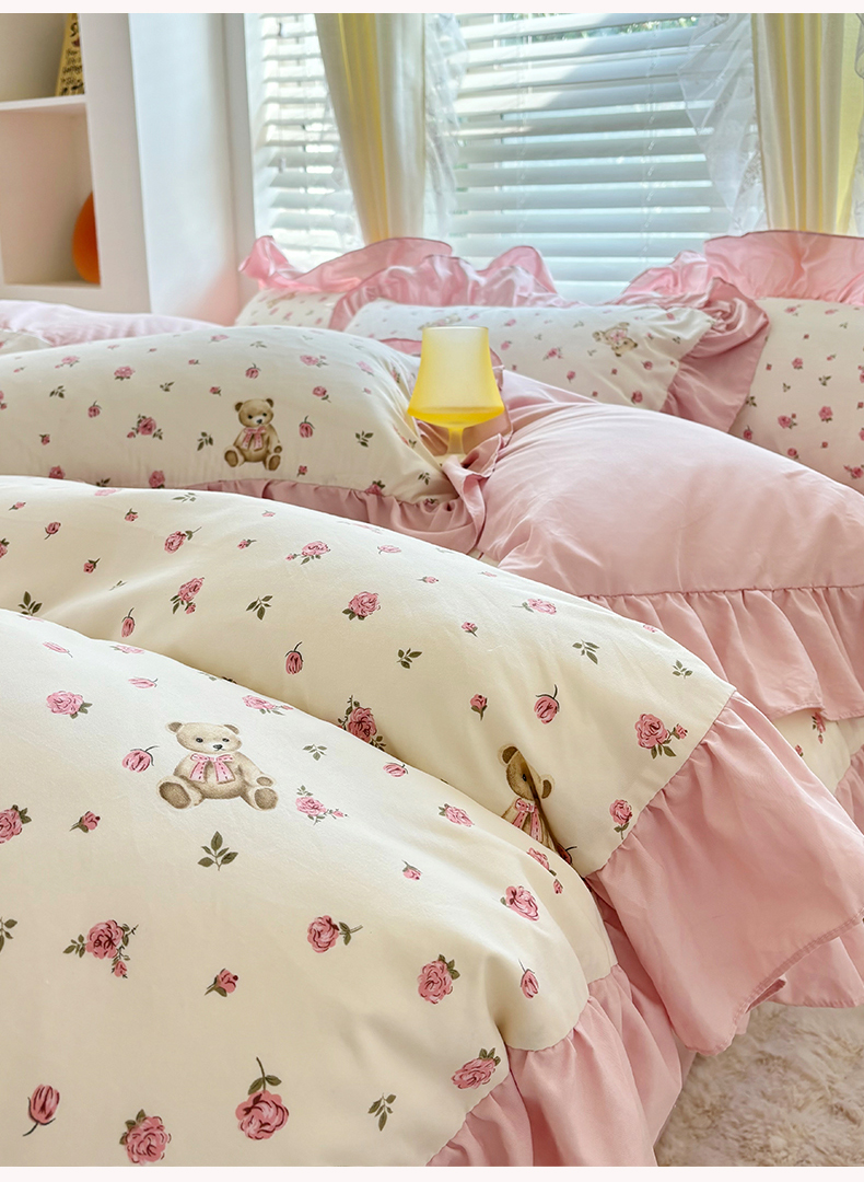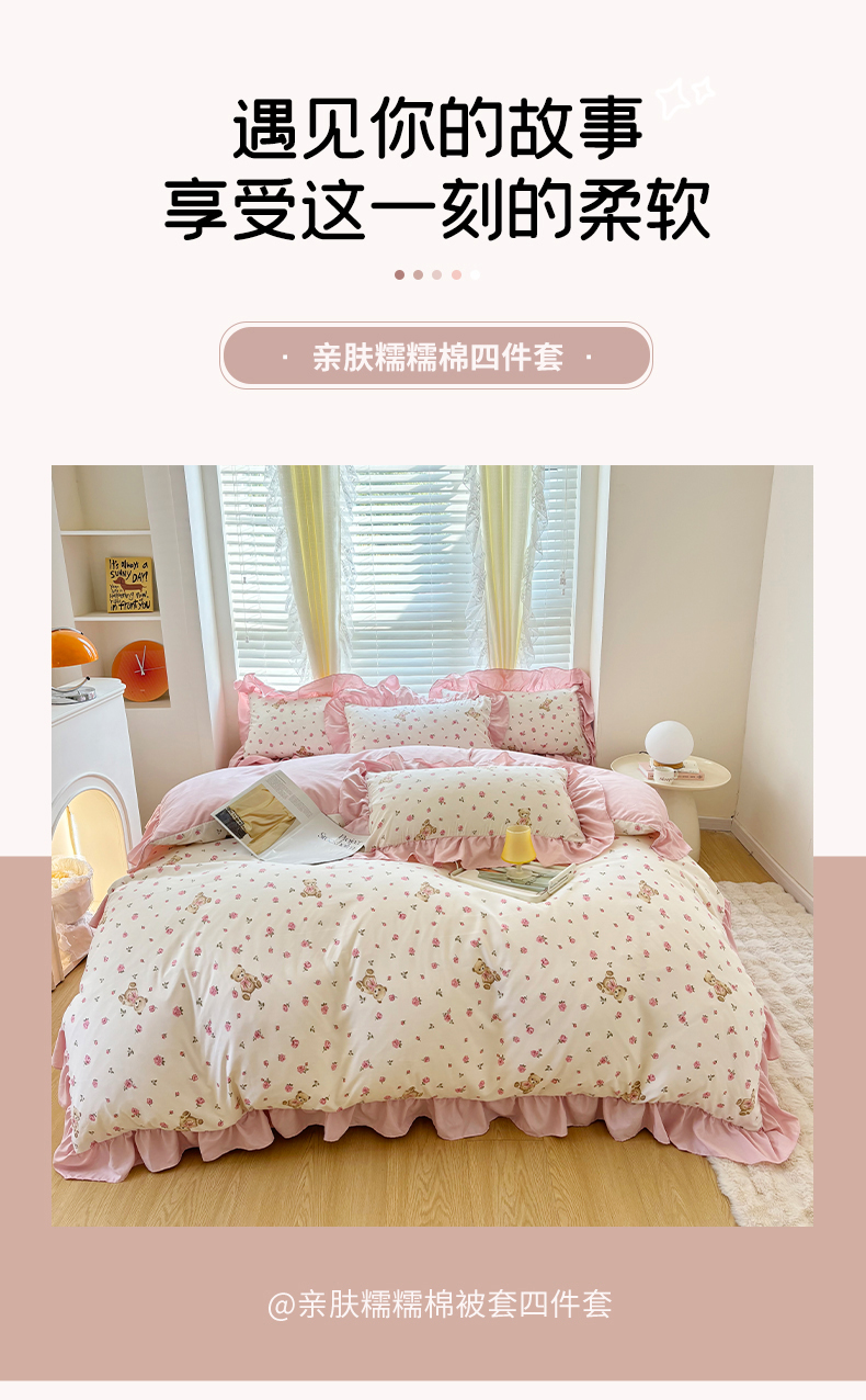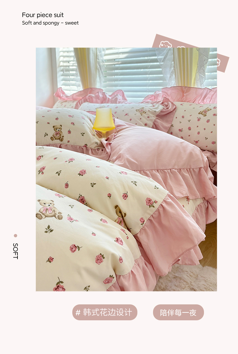 仟网汇 2025新款韩版糯糯棉花边夏被四件套田园法式 玫瑰熊