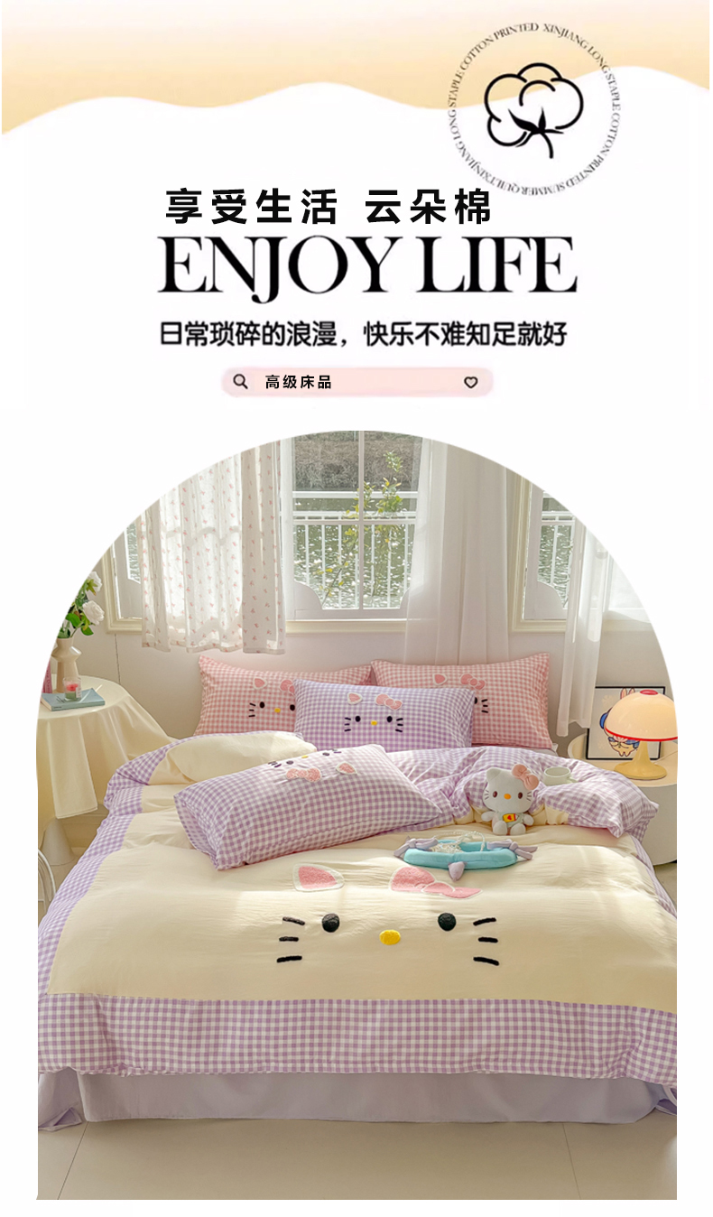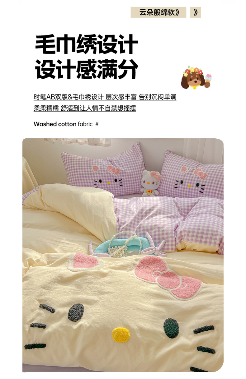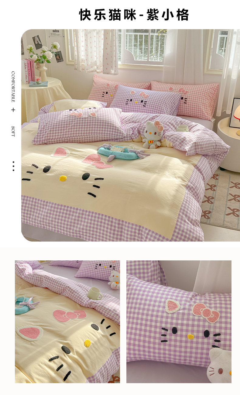 商品名称:2025春夏新款云朵棉水洗棉毛巾绣拼角工艺四件套 快乐猫咪-紫小格