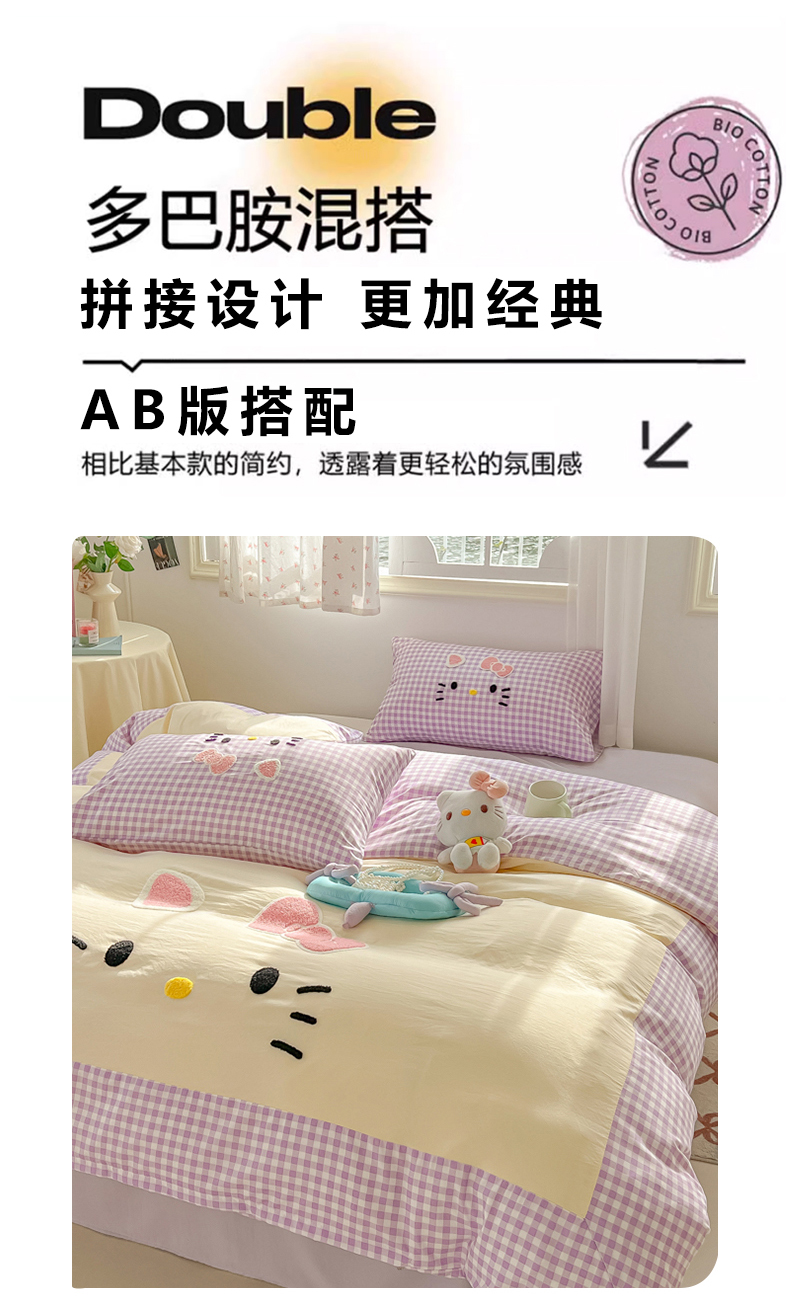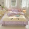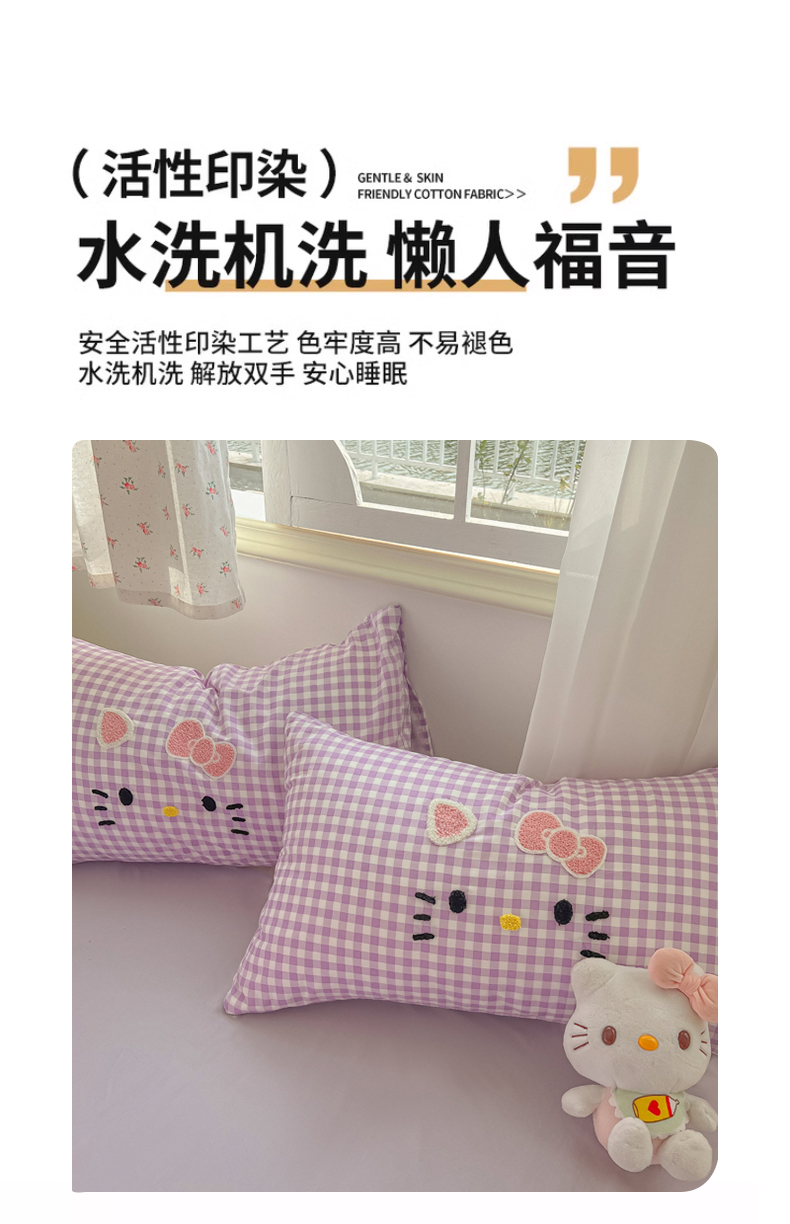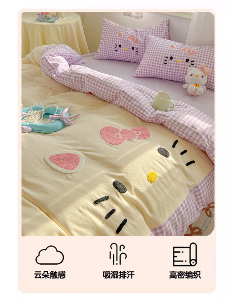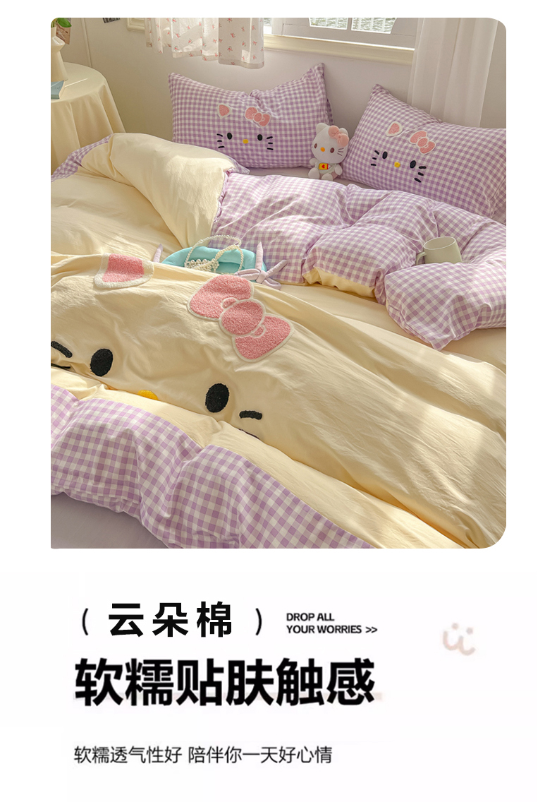 商品名称:2025春夏新款云朵棉水洗棉毛巾绣拼角工艺四件套 快乐猫咪-紫小格