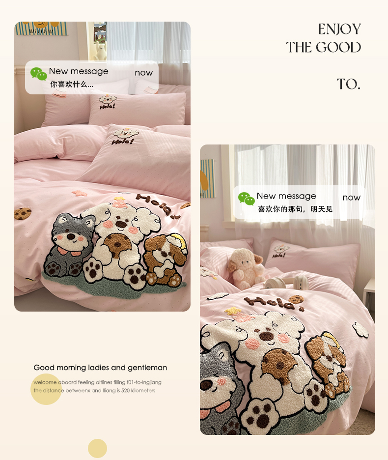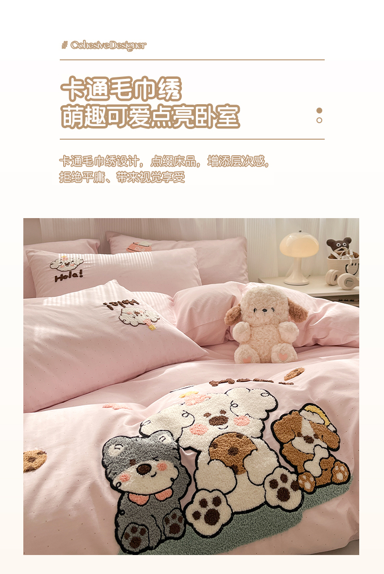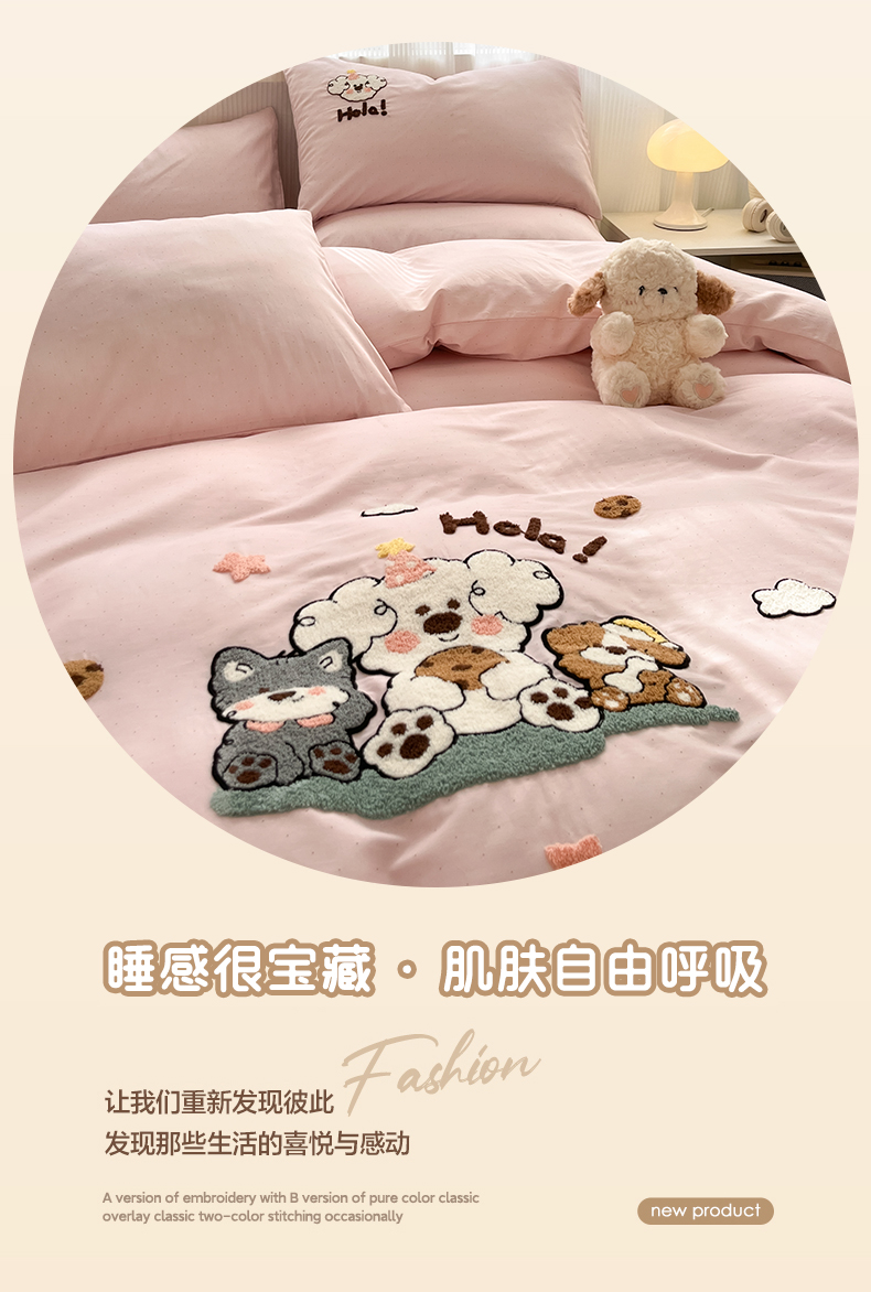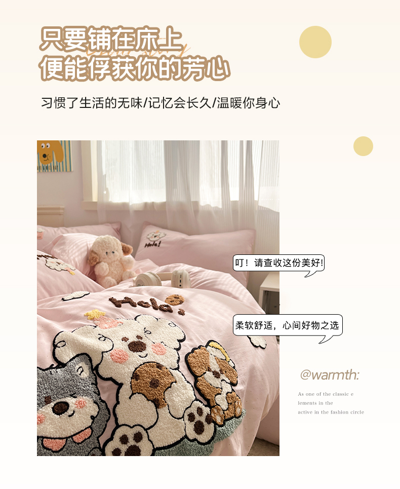 (总)寐居家纺 2025新款贴布绣高克重牛奶绒四件套,安吉拉喵,查理狗,粉糯kitty,皮皮布布