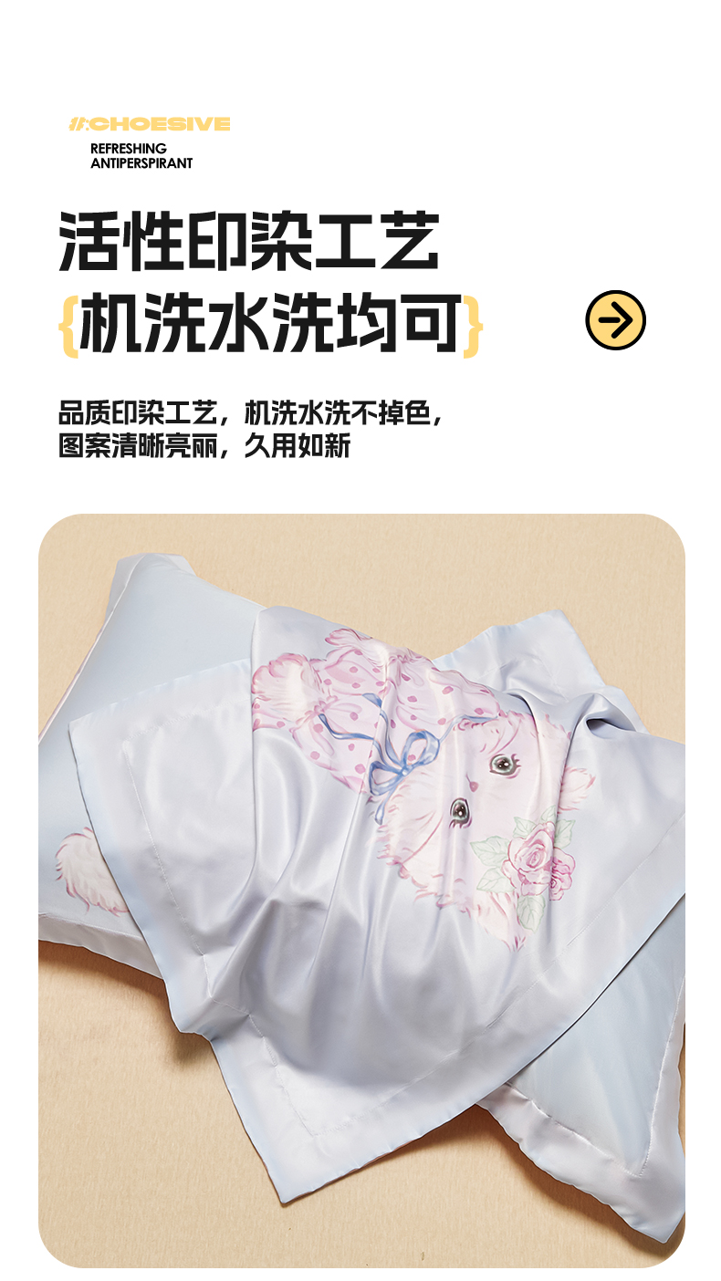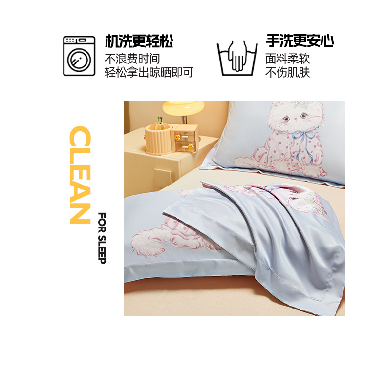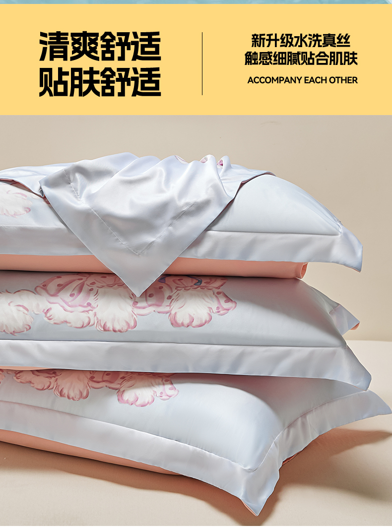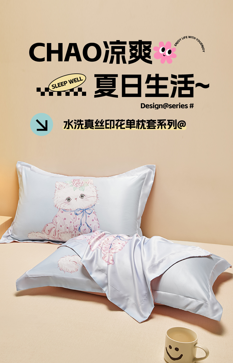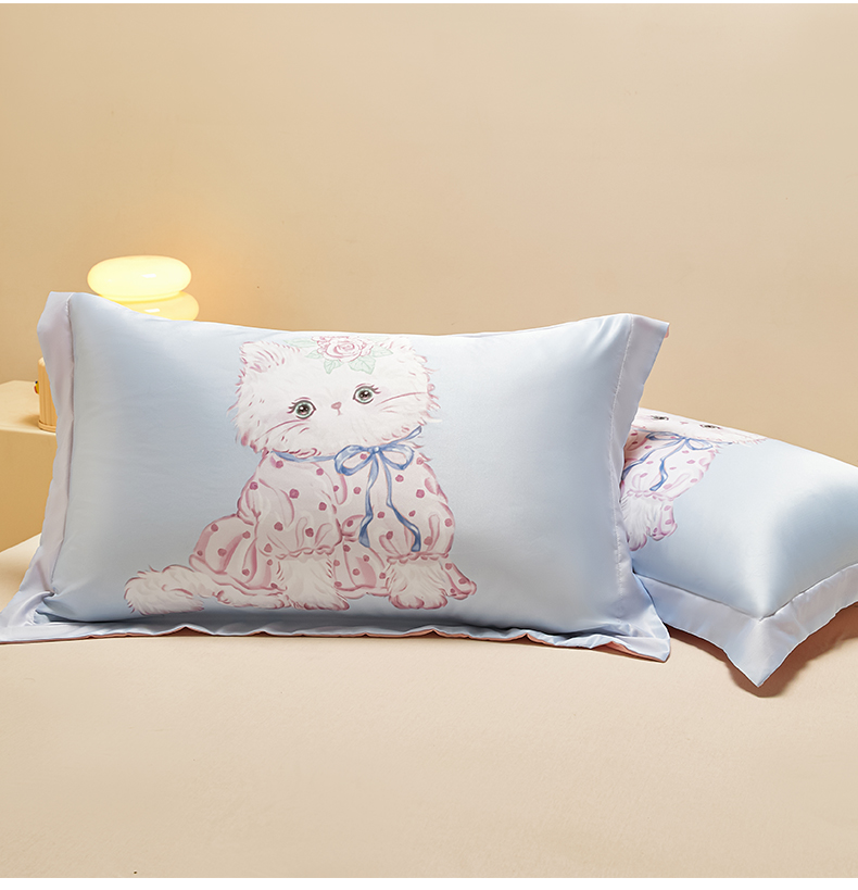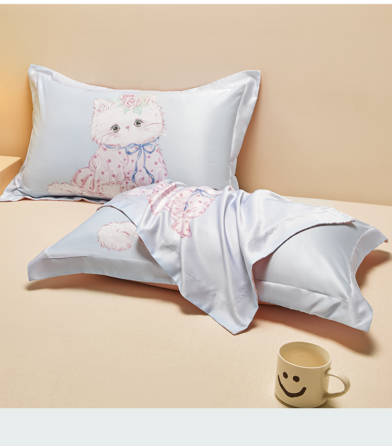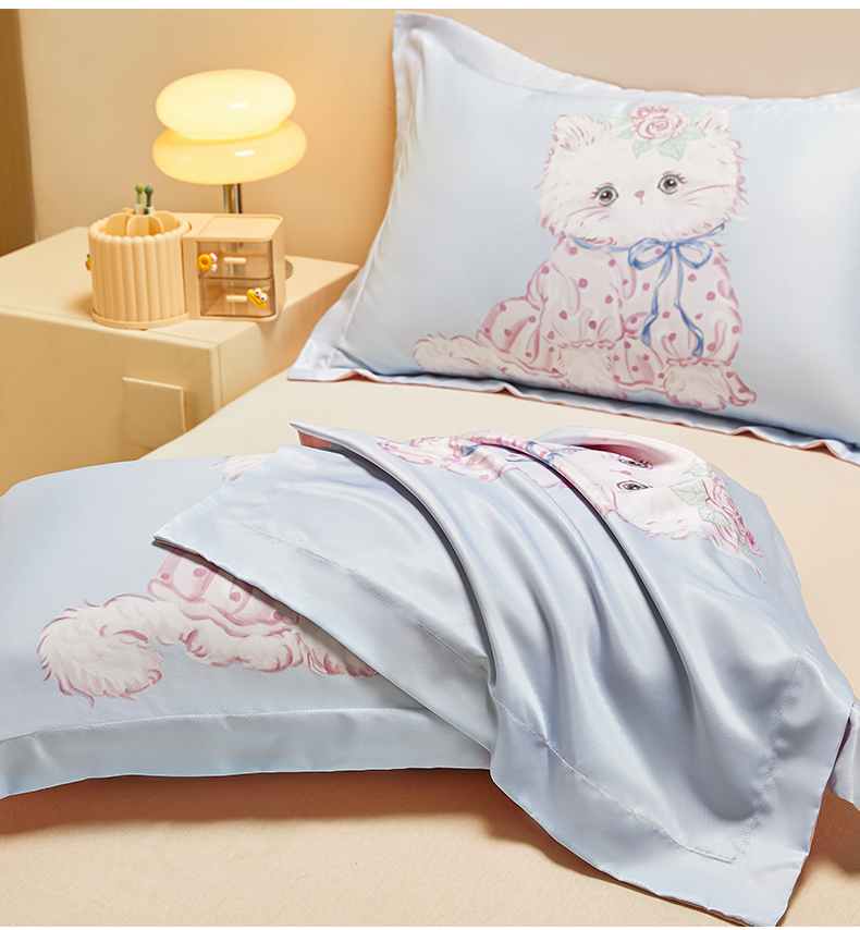笙意家纺 2025新款水洗真丝数码印花卡通枕套 可爱猫