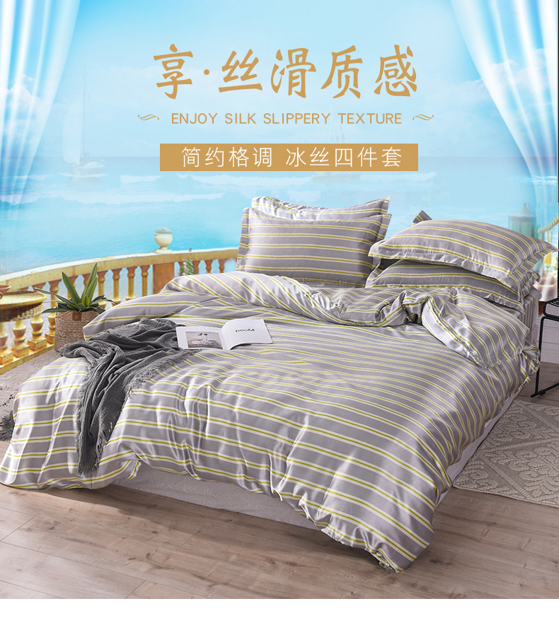 商品名称:经年 2025新款条纹丝绸冰丝四件套-单床笠 蓝中条