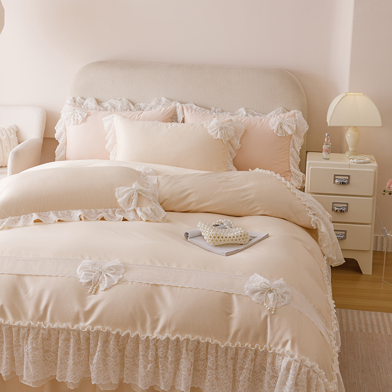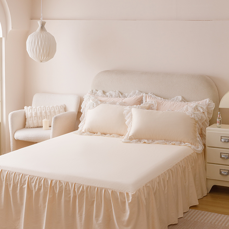 总北纬27度 2022法式双层花边全棉夹棉床裙四件套直播爆款,高级白,公主粉,海洋蓝,可爱黄