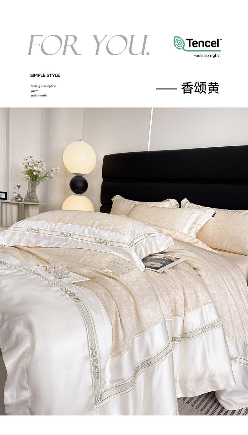 商品名称:高端轻奢A类母婴级兰精天丝全工艺刺绣四件套高端真丝夏季丝滑裸睡床上用品 维曼-香颂黄