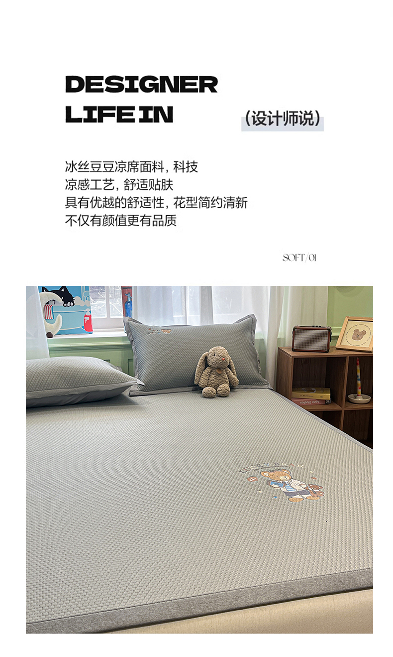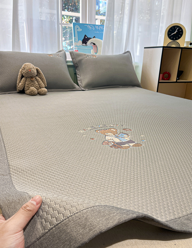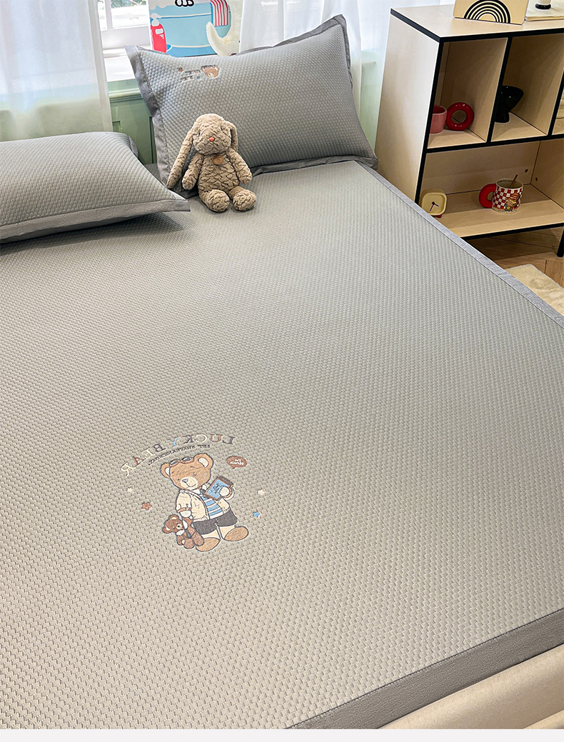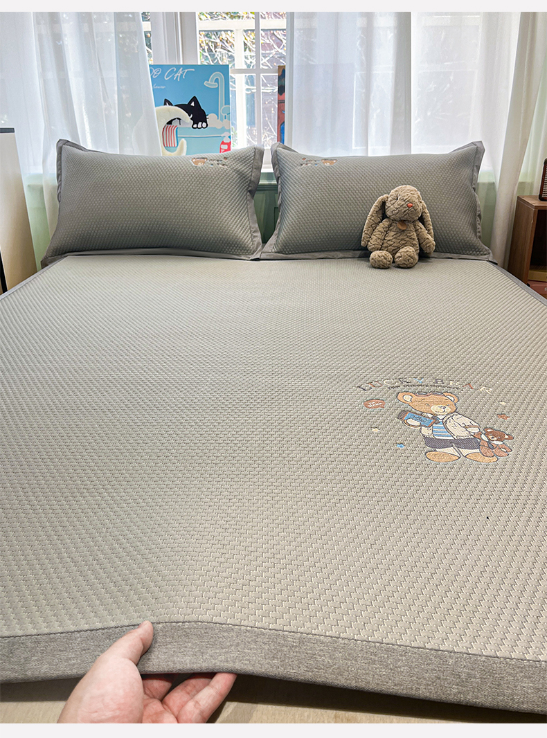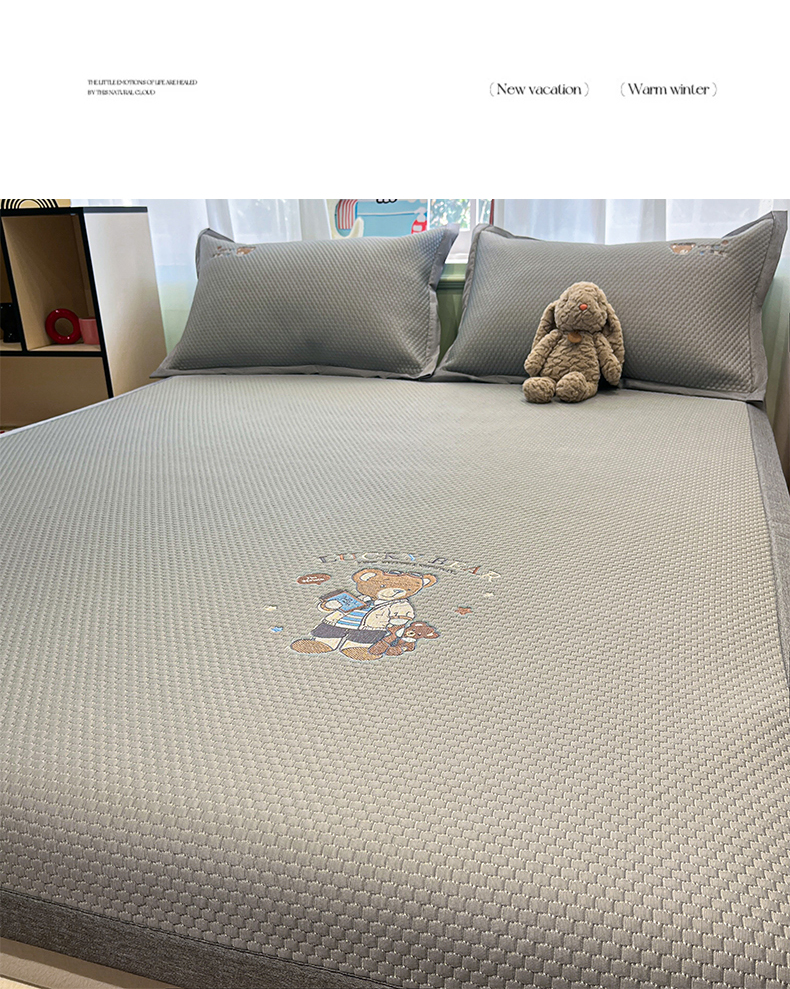 启程家纺 2025春夏新款冰豆豆凉席刺绣款复合三明治三件套 熊仔宝贝-灰
